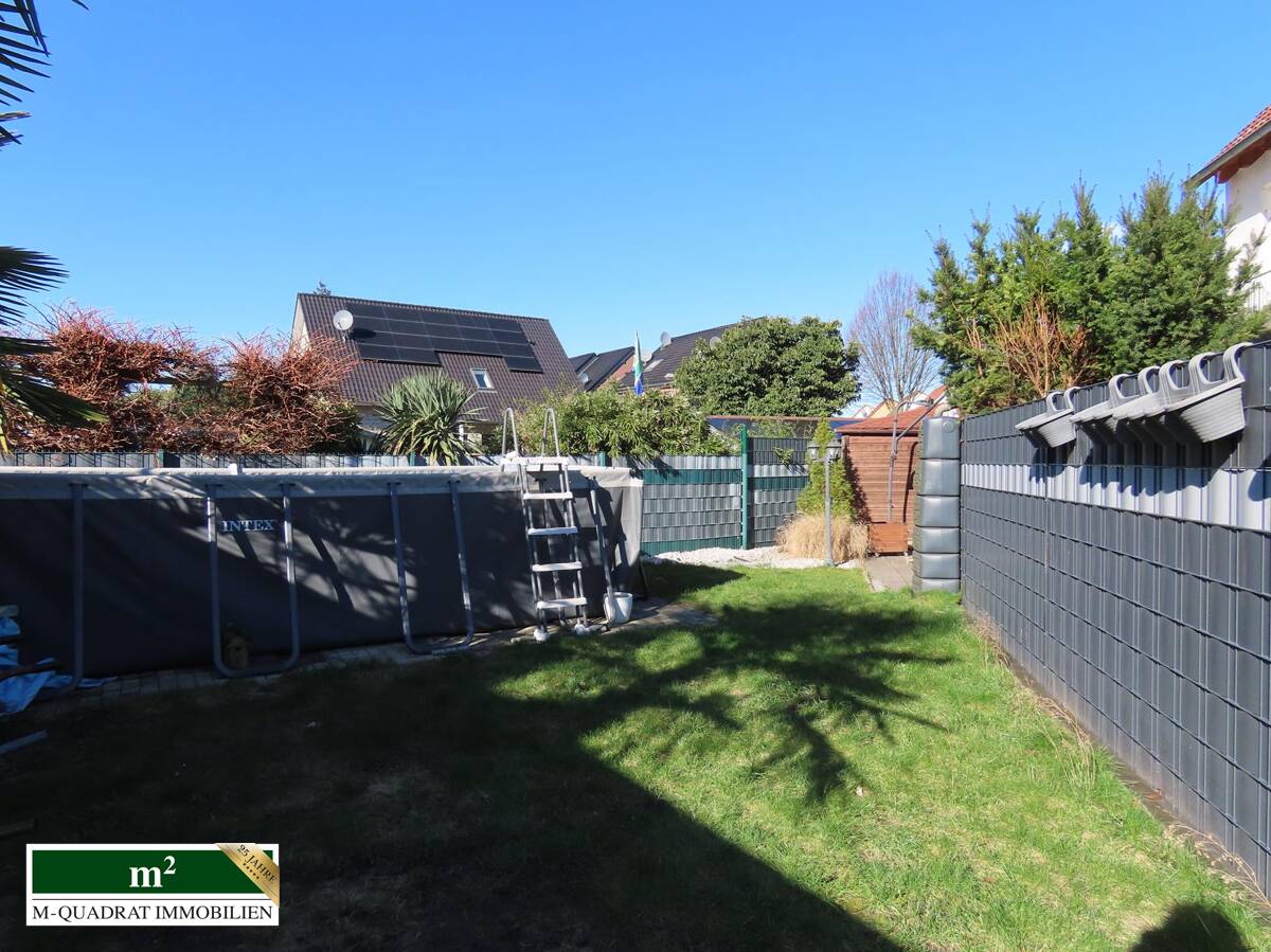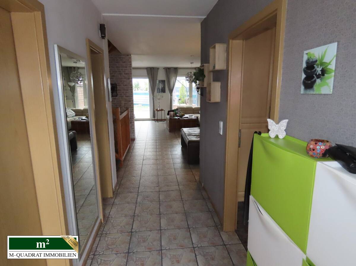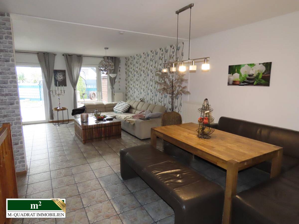 Bei Betreten des Flures finden sich auf der linken Seite ein Vorratsraum und dahinter das Gäste-WC. Rechts liegt die Küche mit Einbauzeile, die zur Straßenseite zeigt. Folgt man dem Korridor weiter, betritt man den offenen Wohnbereich. Direkt links liegt das Treppenhaus. An den geräumigen Eßbereich schließt sich der ebenfalls räumlich großzügige Wohnteil an. Durch zwei Doppel-Terrassentüren ist der Innenbereich mit Licht geflutet. Daran grenzen die überdachte Terrasse und der Garten an, der durch seine Winkelform sowohl in Süd-, als auch Westlage ausgerichtet ist. Darin befindet sich u.a. ein rechteckiger Aufstellpool. Ferner verbleibt genug Platz für Spielflächen und ein Gartenhäuschen.