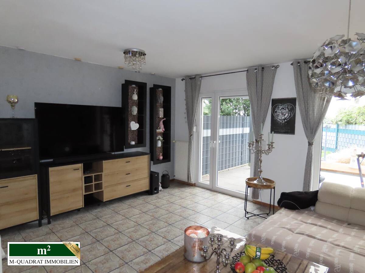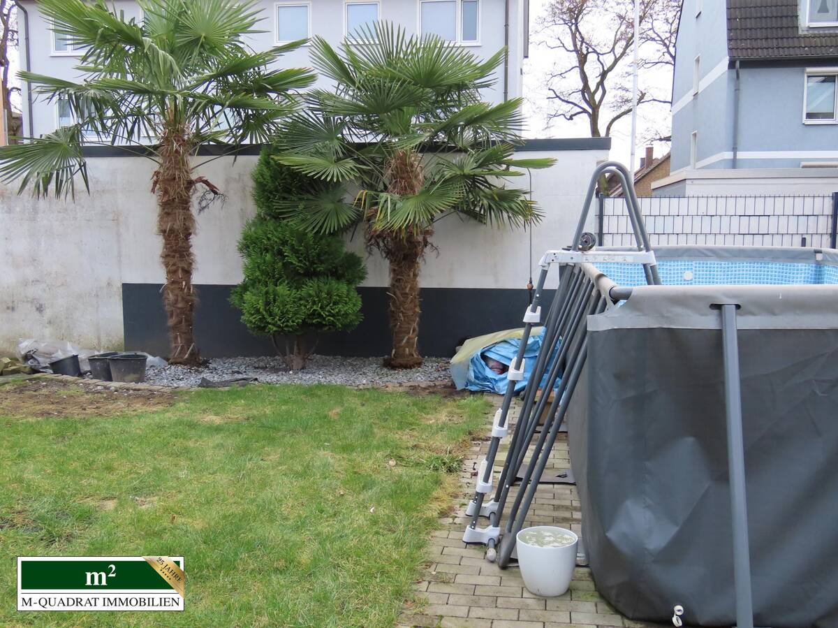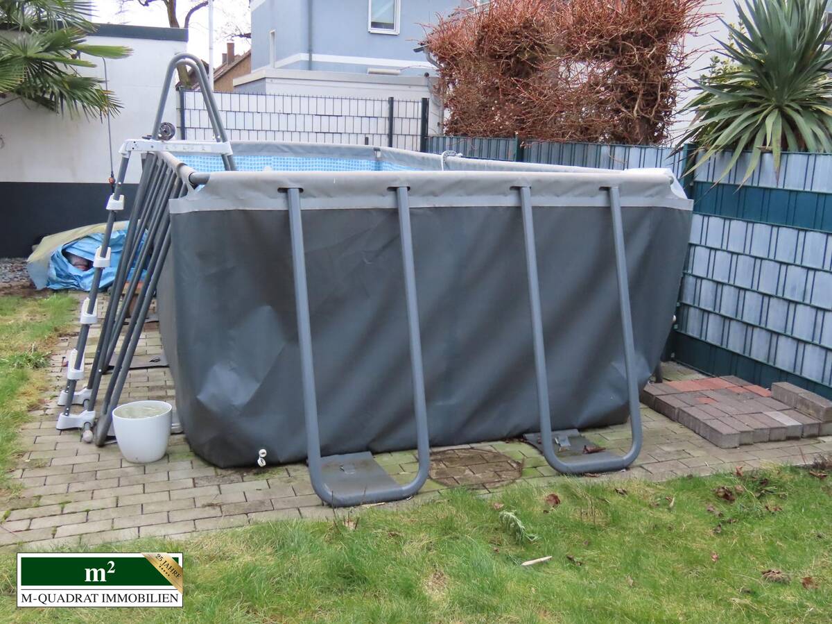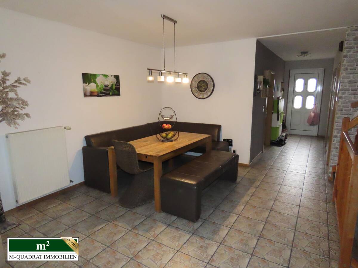 Bei Betreten des Flures finden sich auf der linken Seite ein Vorratsraum und dahinter das Gäste-WC. Rechts liegt die Küche mit Einbauzeile, die zur Straßenseite zeigt. Folgt man dem Korridor weiter, betritt man den offenen Wohnbereich. Direkt links liegt das Treppenhaus. An den geräumigen Eßbereich schließt sich der ebenfalls räumlich großzügige Wohnteil an. Durch zwei Doppel-Terrassentüren ist der Innenbereich mit Licht geflutet. Daran grenzen die überdachte Terrasse und der Garten an, der durch seine Winkelform sowohl in Süd-, als auch Westlage ausgerichtet ist. Darin befindet sich u.a. ein rechteckiger Aufstellpool. Ferner verbleibt genug Platz für Spielflächen und ein Gartenhäuschen.