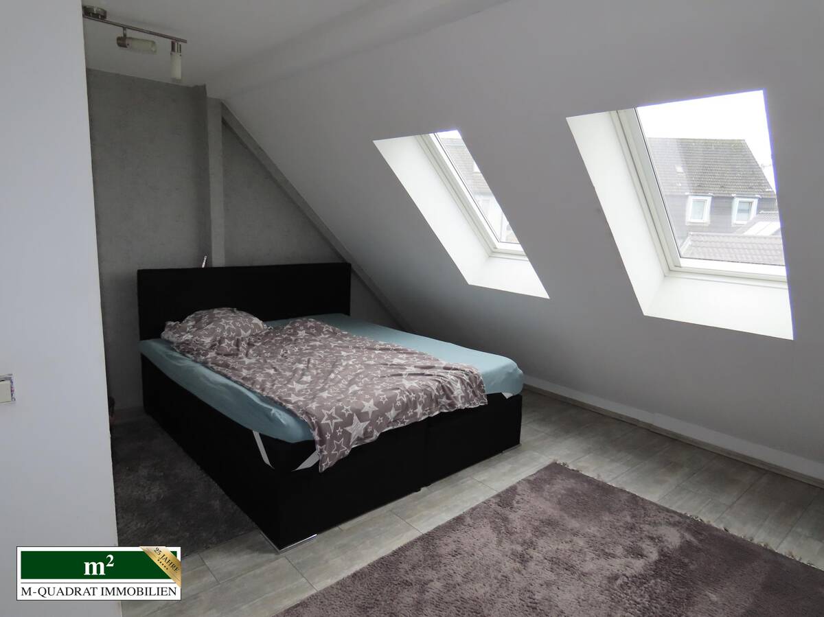 Zurück im Haus gelangt man nun über das Treppenhaus ins I. OG. Zur Gartenseite ausgerichtet liegt das Schlafzimmer. Dieses ist durch zwei bodentiefe, jeweils zweitürige Fenster ausgestattet, sodaß der Raum bei hochgezogenen Rolladen hell ausgeleuchtet ist. Zur Straßenseite zeigen das erste Kinder-/ Gästezimmer, als auch das Badezimmer mit Wanne und Dusche. Folgt man dem Treppenhaus bis unters Dach, findet sich hier ein auf seiner gesamten Fläche erstreckender Wohn- und Schlafbereich. Gegenwärtig ist dieser offen, könnte aber mit wenig Aufwand in zwei Kinder-, bzw. Jugendzimmer gestaltet werden. Über eine Leiter im Treppenhaus erreicht man unter dem Dachgiebel einen Stauraum für Koffer, Deko usw..