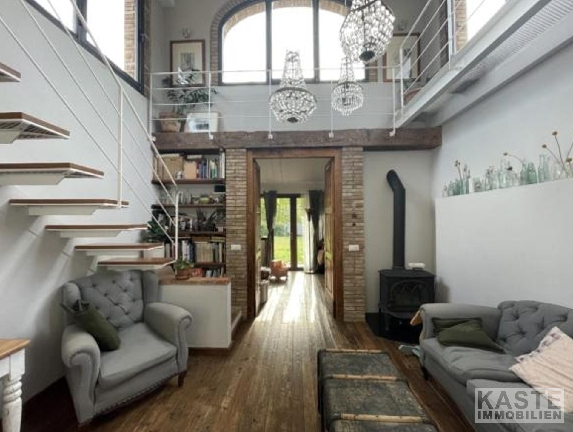 DIE SCHEUNE Die Scheune hat einen ganz anderen Stil, moderner mit antiken Details und wiederverwendeten Materialien, aber immer noch charmant und warm. Sie besteht aus einem Eingang durch die Veranda in die große Küche, dann durch einen kleinen Bogen in das Wohnzimmer, das Badezimmer und ein Schlafzimmer, im Dachgeschoss, das dem Wohnbereich gegenüber liegt, befindet sich das andere Schlafzimmer. Das Heizsystem arbeitet mit Holzöfen, die das gesamte Haus sehr gut beheizen.
