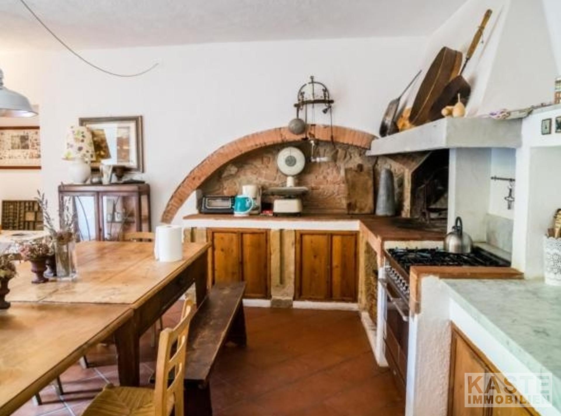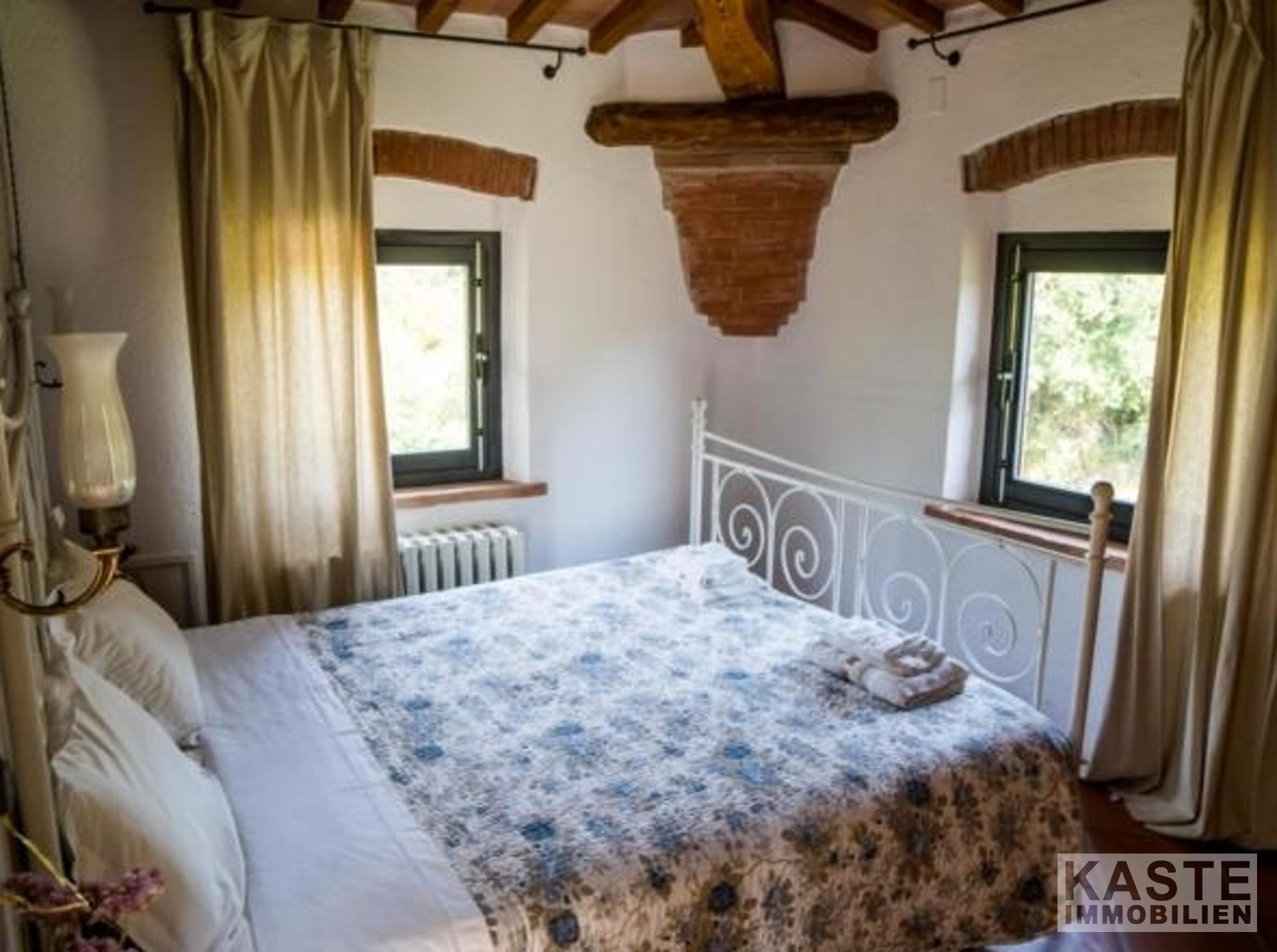 IL MOLINO: Landhaus auf 3 Etagen mit einer Gesamtfläche von 250 qm. Erdgeschoss - teilweise mittelalterliche Ursprünge, einst als Mühle genutzt, wurde vollständig renoviert und in eine ca. 30 qm große Küche mit einem großen Kamin umgewandelt und die gesamte Küche wurde mit wiederverwendeten Materialien gebaut. Von der Küche aus gelangen Sie in einen privaten, mit Terrakottafliesen gepflasterten Hof von etwa 100 qm. Neben der Küche befindet sich ein Abstellraum mit Waschküche. Im Außenbereich neben der Küche befindet sich ein alter Holzofen mit Überdachung. Von der Küche aus führt eine Treppe aus wiederhergestellten Terrakotta-Ziegeln nach oben. Erster Stock - Wohnzimmer mit großem Kamin, der aus den gleichen Deckenbalken gebaut wurde, die komplett mit Balken und Terrakotta-Ziegeln renoviert wurden. Sie können diesen Raum auch über eine Außentreppe erreichen, denn dies ist der Haupteingang. Auf der gleichen Etage befindet sich das Hauptbadezimmer, sehr groß mit Badewanne und Dusche und begehbarem Kleiderschrank, ein Dreibettzimmer, ein Doppelzimmer mit Terrasse und ein Einzelzimmer. Auf dieser Etage befindet sich auch der Heizungsraum. Das gesamte Anwesen wird mit Flüssiggas beheizt, es gibt einen unterirdischen Tank in der Nähe der Straße. Zweite Etage - über eine Treppe aus Terrakotta und Holz gelangen Sie in den Turm, wo sich zwei Schlafzimmer und ein Badezimmer befinden. Die gesamte Etage verfügt über originale Balken und Ziegel.