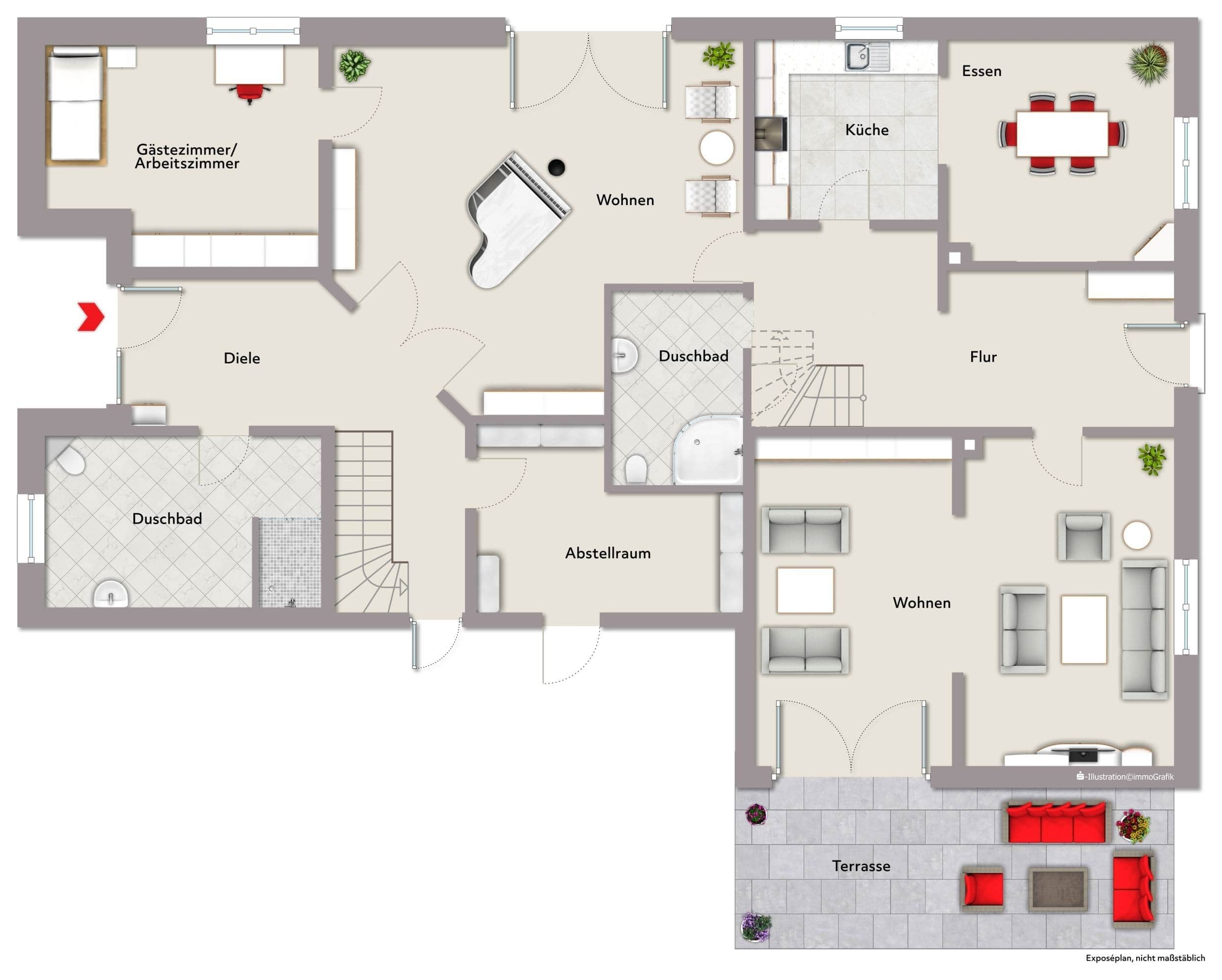 Im Erdgeschoss sorgen großzügige Wohnbereiche und die Fußbodenheizung für angenehmen Komfort. Von hier aus eröffnet sich der Zugang zur Terrasse und in den privaten Gartenbereich – ein geschützter Rückzugsort mit viel Freiraum. Mehrere Zimmer ermöglichen flexible Nutzung – ob klassisches Familienleben, Gästebereich oder Arbeiten von Zuhause.