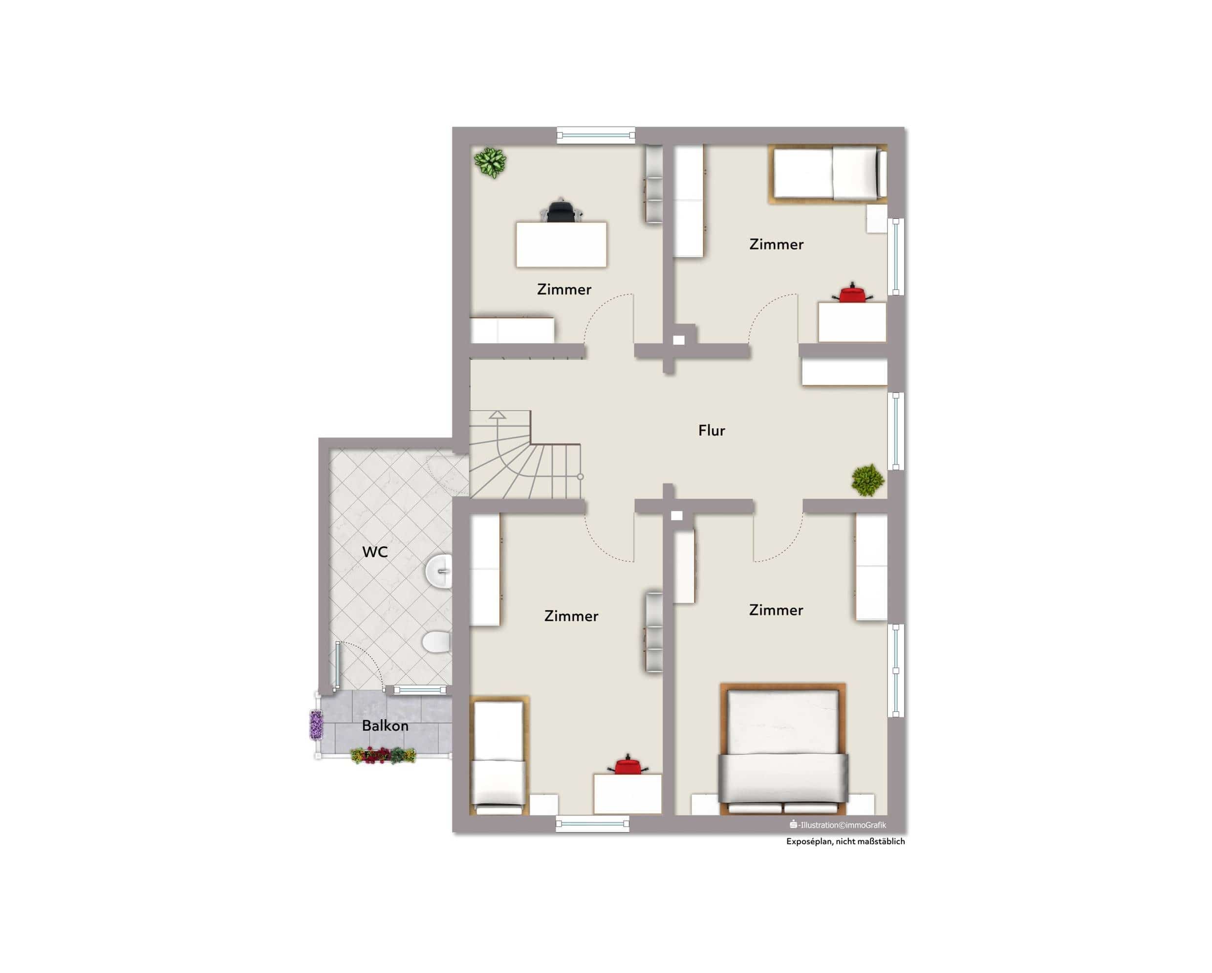 Das Obergeschoss verfügt über vier gut geschnittene Räume, die sich über einen zentralen Flur erschließen. Zusätzlich wurde der Übergang zum Dachboden der ehemaligen Tenne zu einem WC ausgebaut und erweitert die Wohnfläche sinnvoll. Von hier aus gelangt man auf den Balkon mit Blick in den Garten.