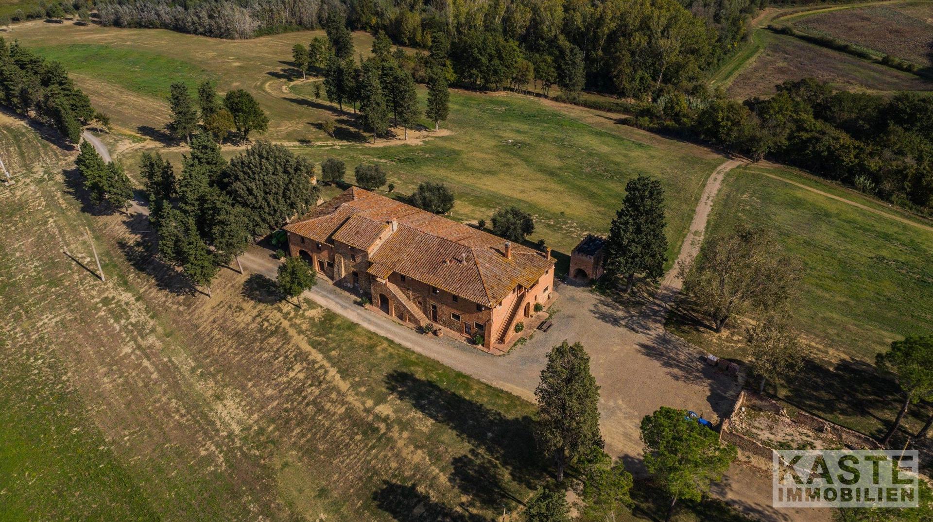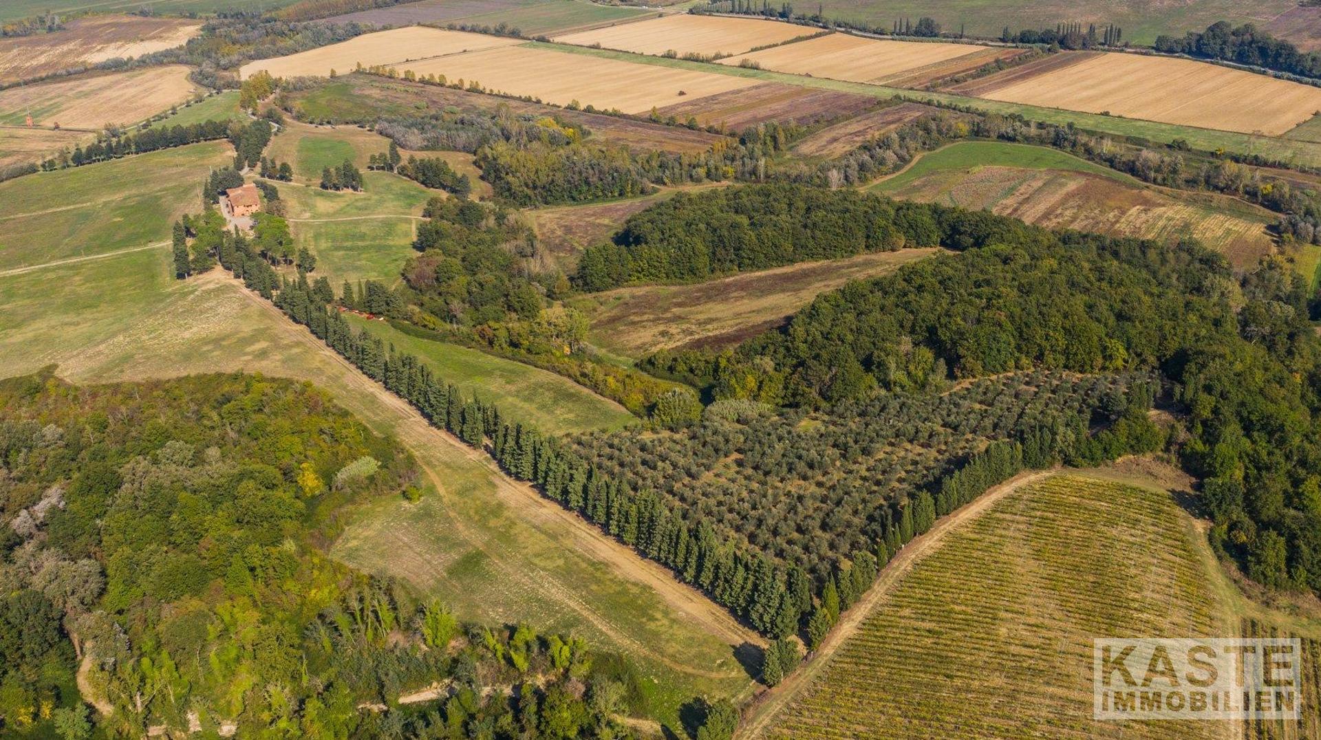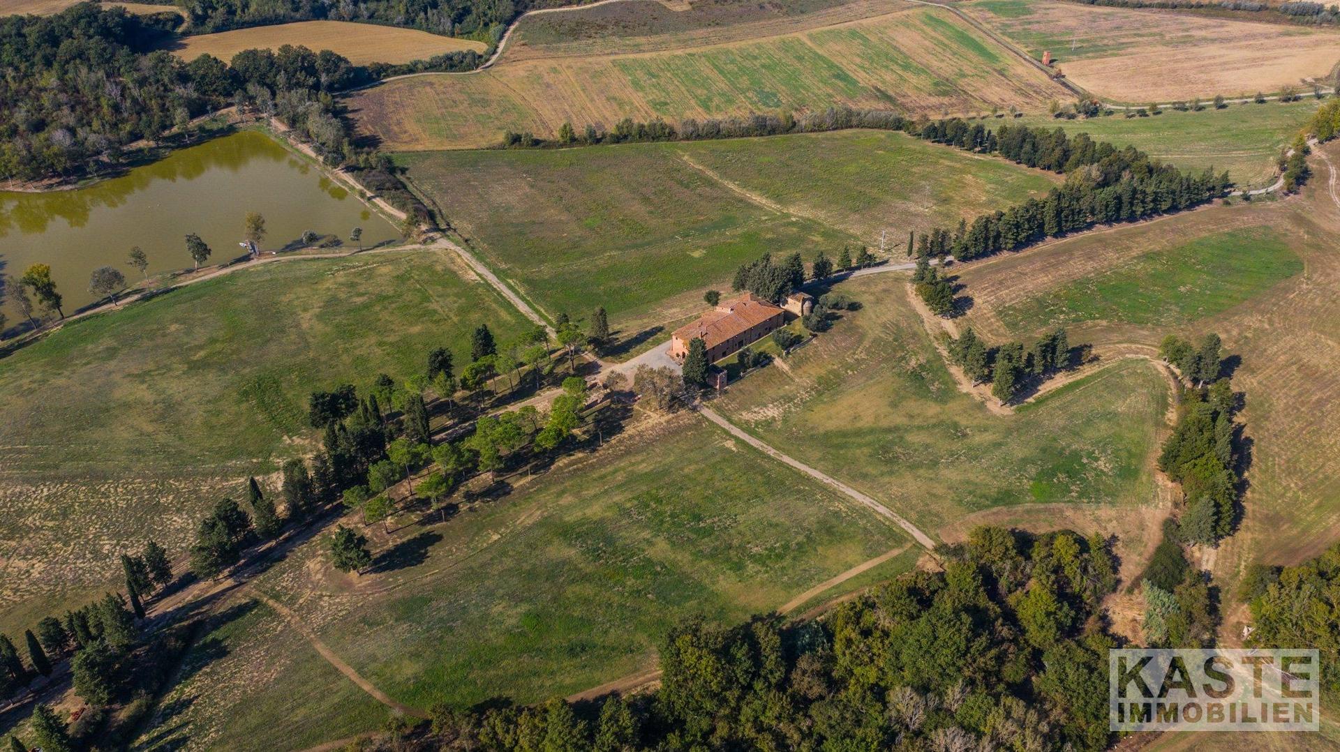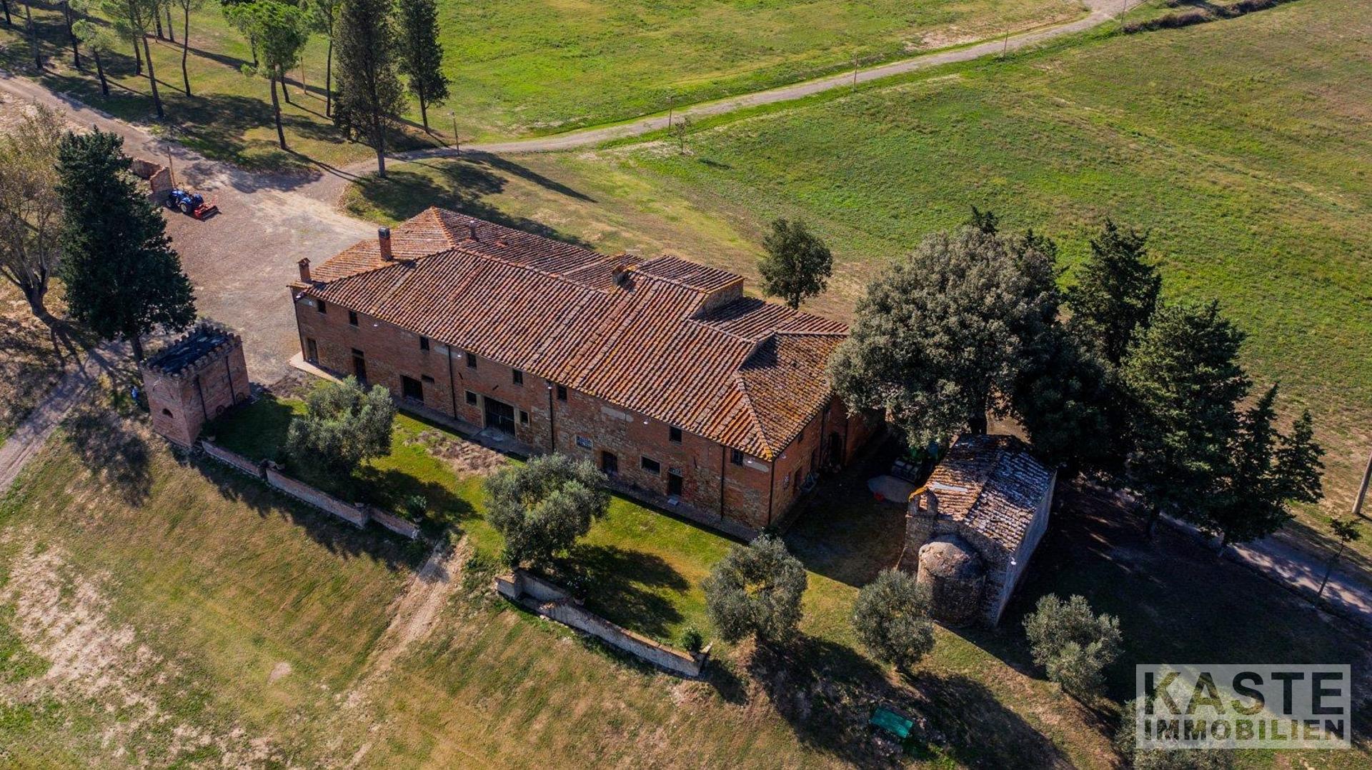 Ein riesiges Bauernhaus (ehemaliges Kloster) auf 2 Etagen mit einer Pfarrkirche aus dem Jahr 700. Umgeben von 100 ha Land mit einem See, einem Wald (welcher ein privates Wildgehege hat), vielen Feldern sowie ca. 400 Olivenbäumen. Die Zufahrt zum Grundstück erfolgt über einen sehr gepflegten Feldweg, eine Zypressenallee, die direkt vor das Bauernhaus führt. Das Anwesen liegt ganz oben auf dem Hügel mit einem 360°-Blick auf die Umgebung, welche malerisch schön ist.