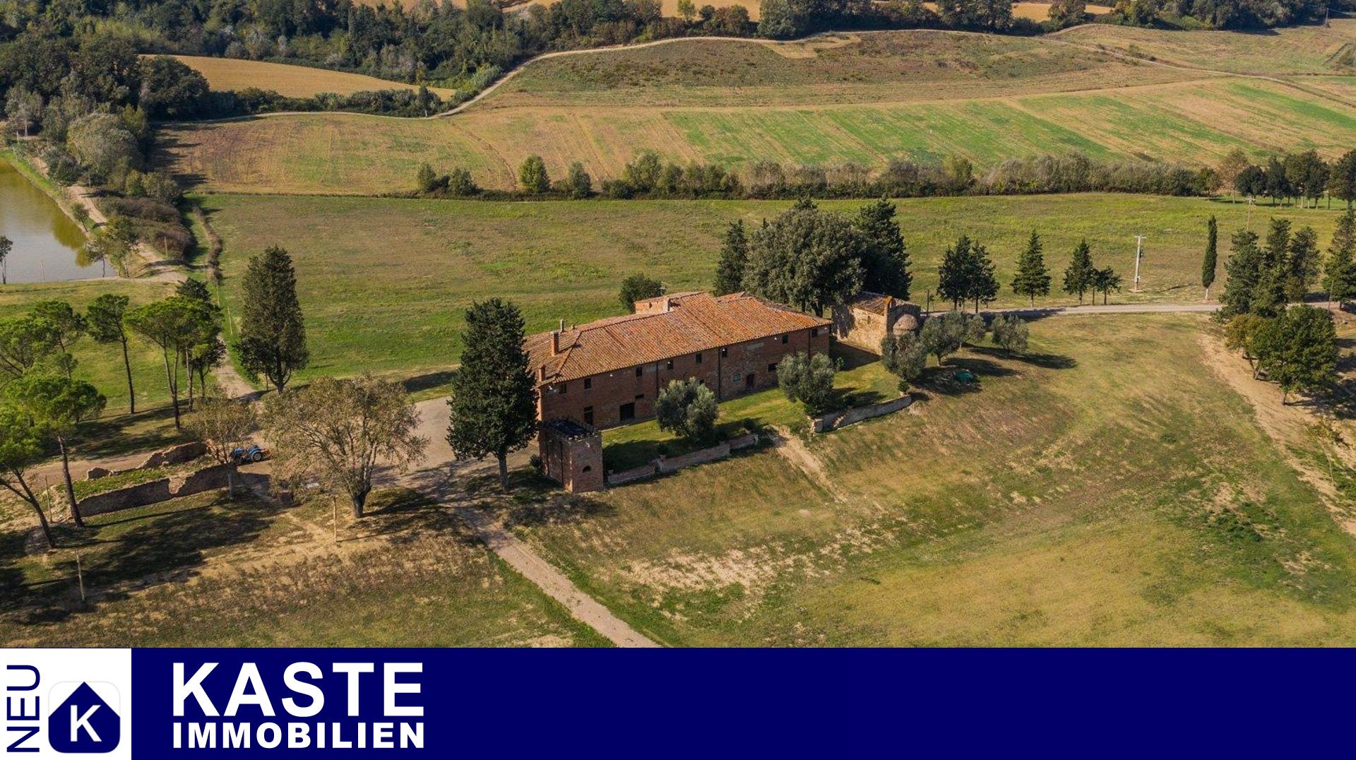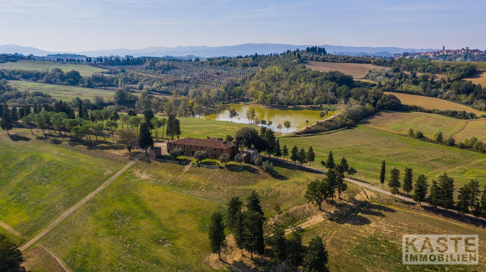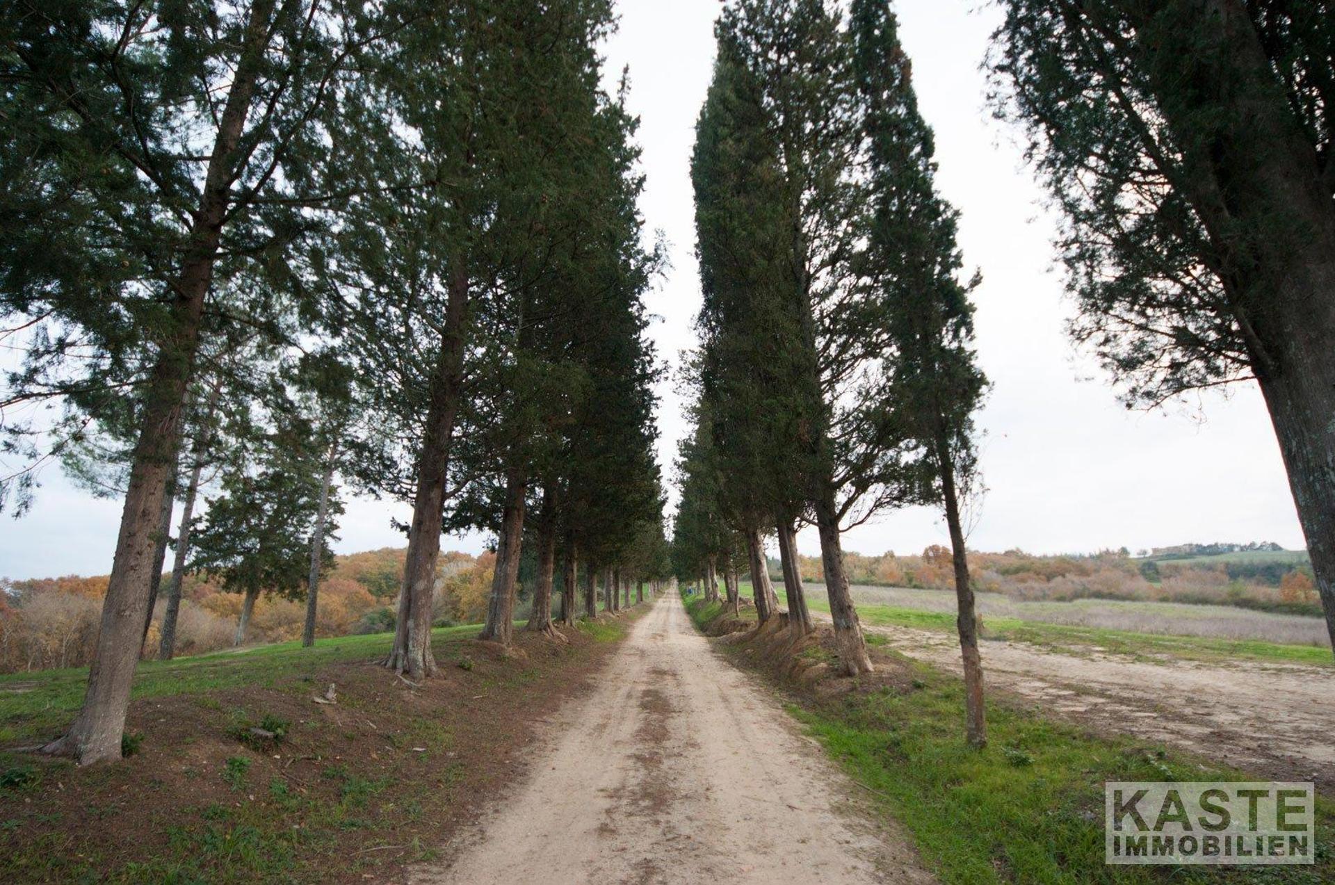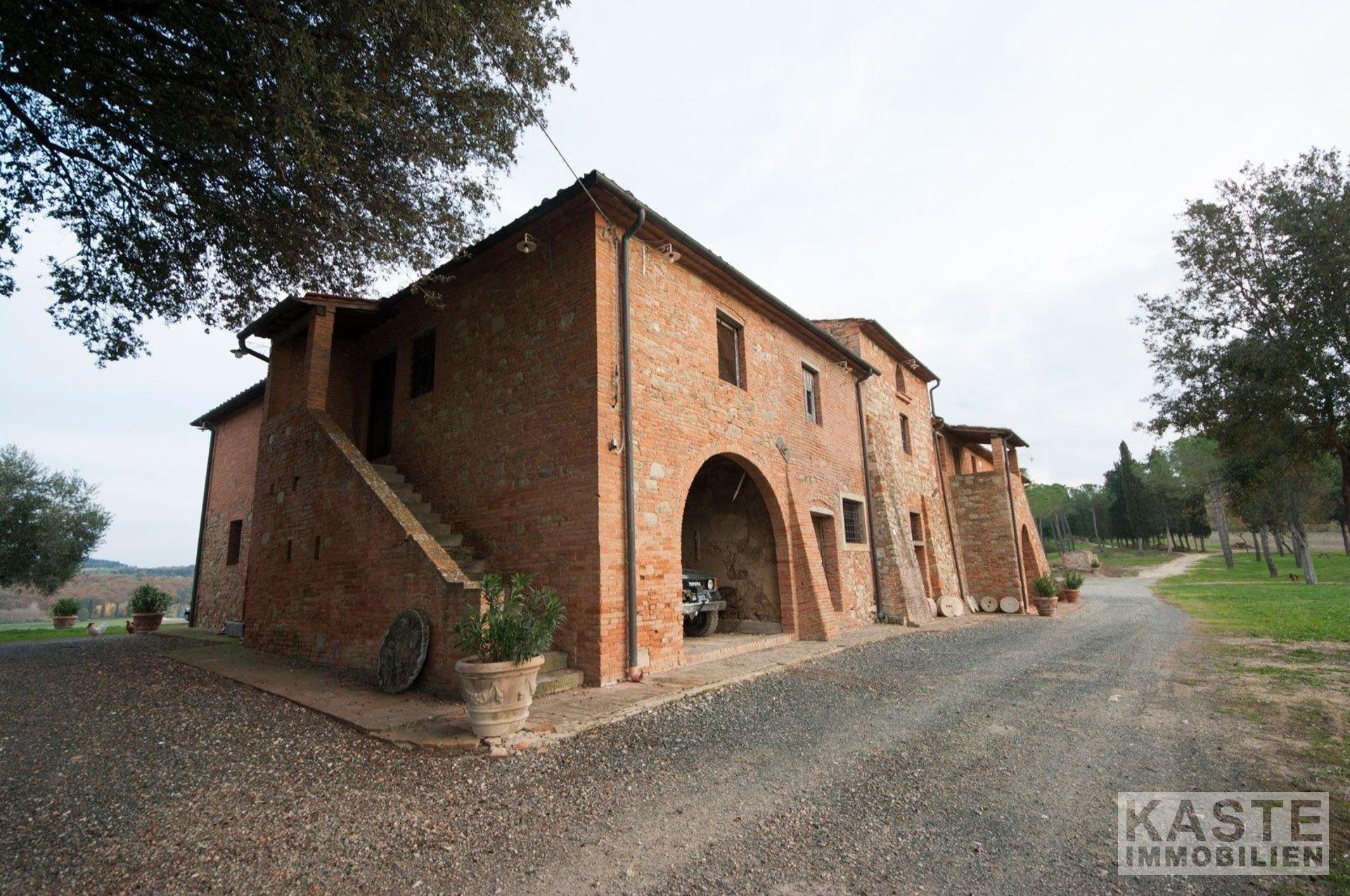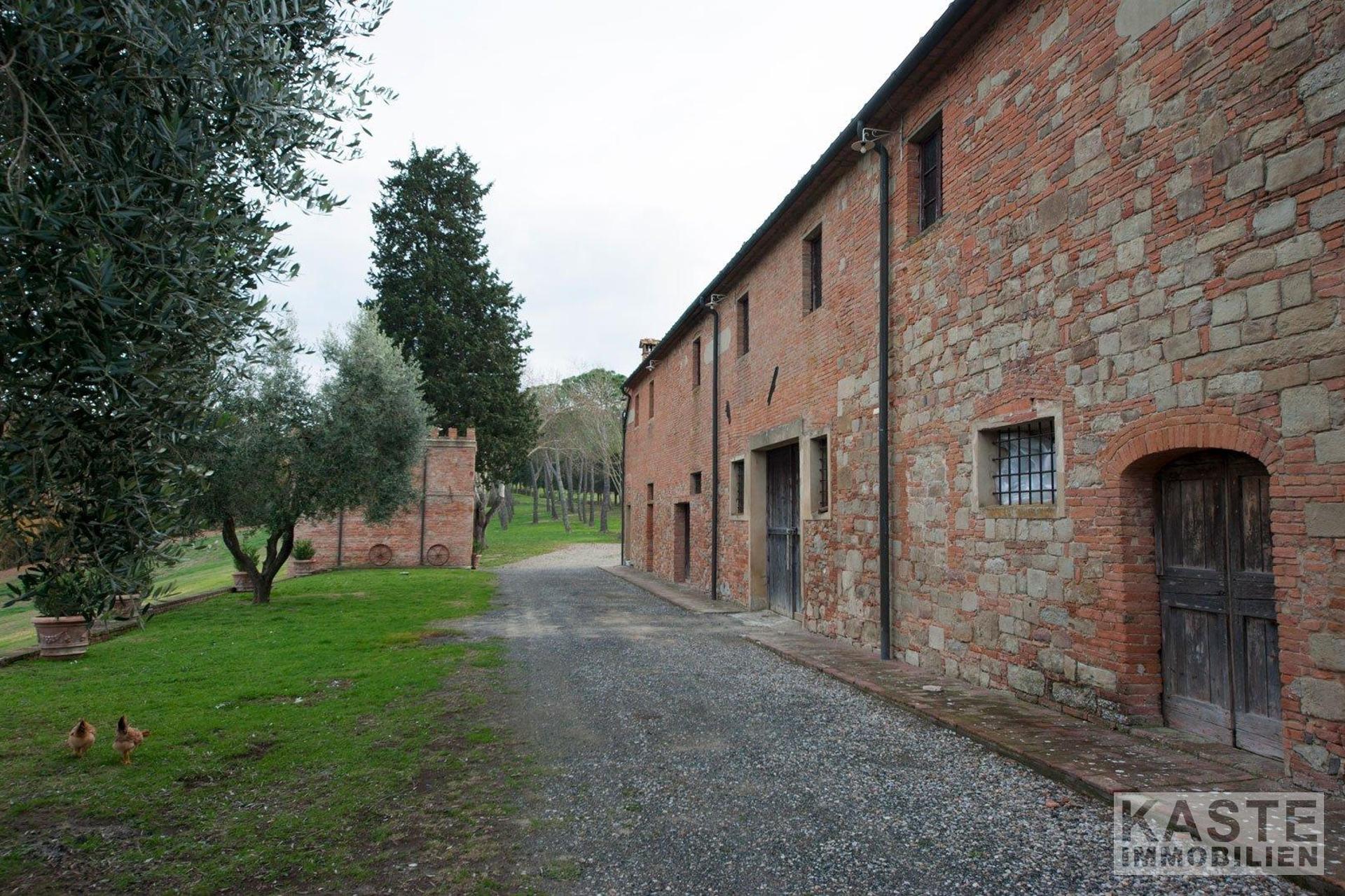 Ein riesiges Bauernhaus (ehemaliges Kloster) auf 2 Etagen mit einer Pfarrkirche aus dem Jahr 700. Umgeben von 100 ha Land mit einem See, einem Wald (welcher ein privates Wildgehege hat), vielen Feldern sowie ca. 400 Olivenbäumen. Die Zufahrt zum Grundstück erfolgt über einen sehr gepflegten Feldweg, eine Zypressenallee, die direkt vor das Bauernhaus führt. Das Anwesen liegt ganz oben auf dem Hügel mit einem 360°-Blick auf die Umgebung, welche malerisch schön ist.