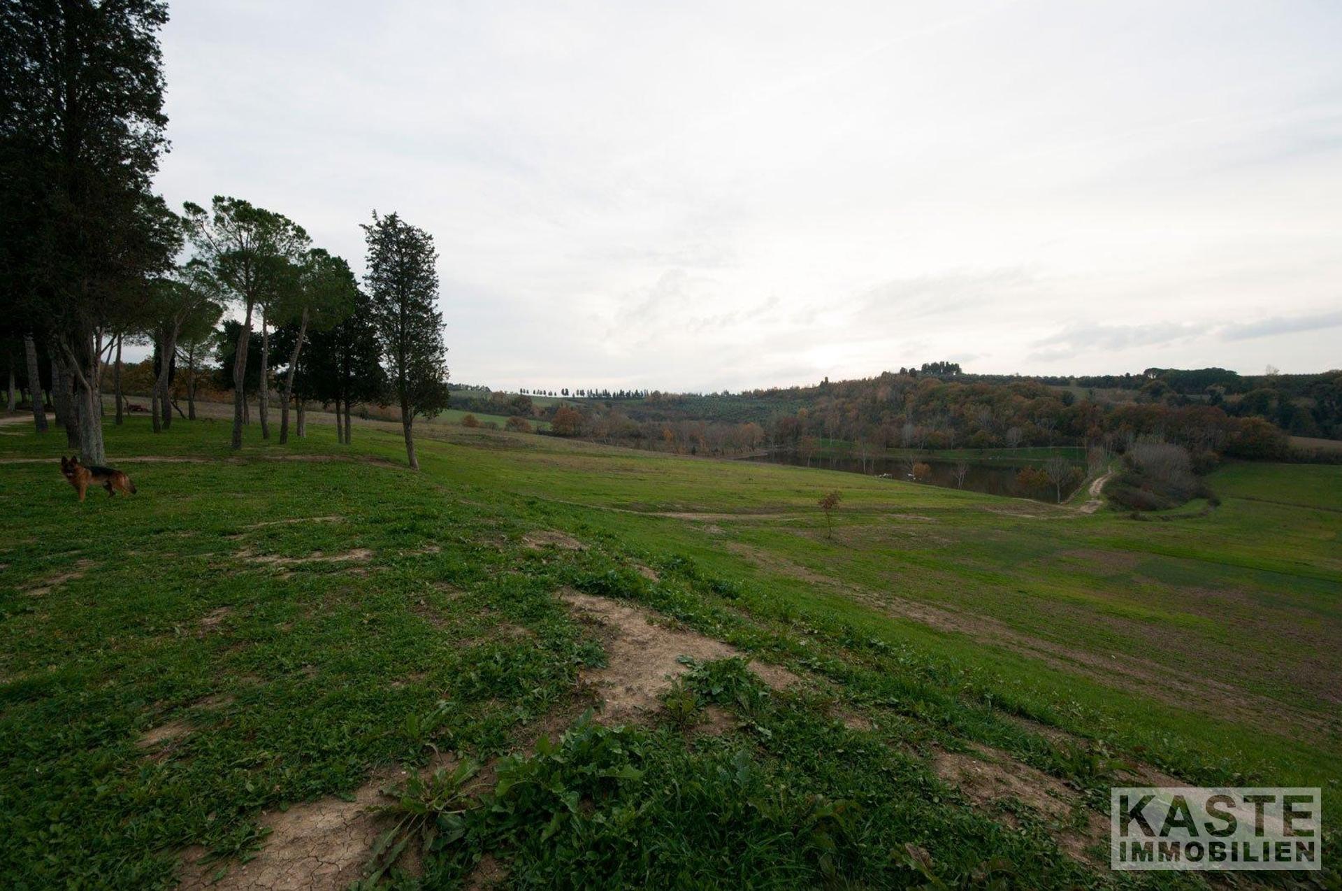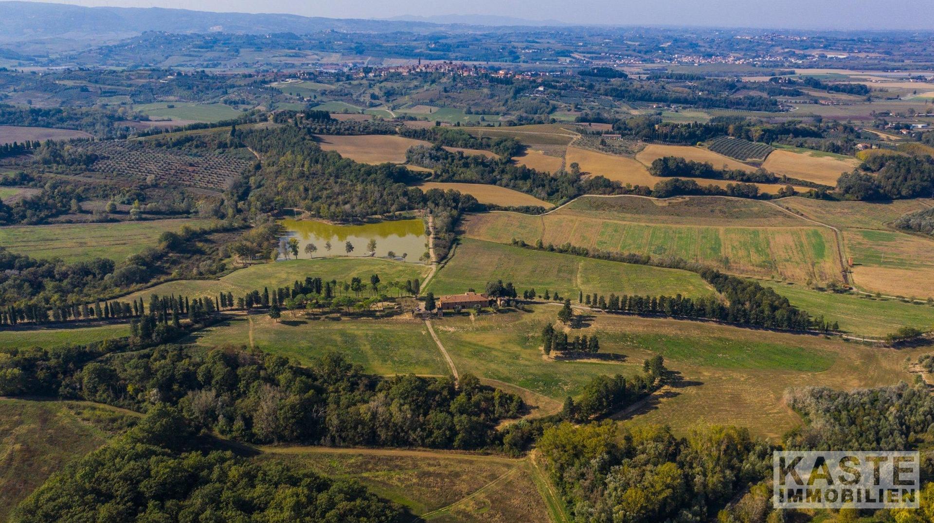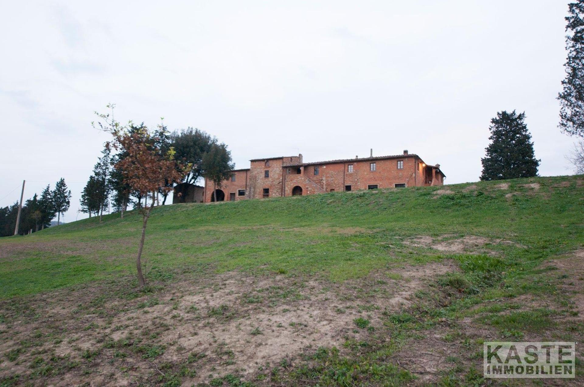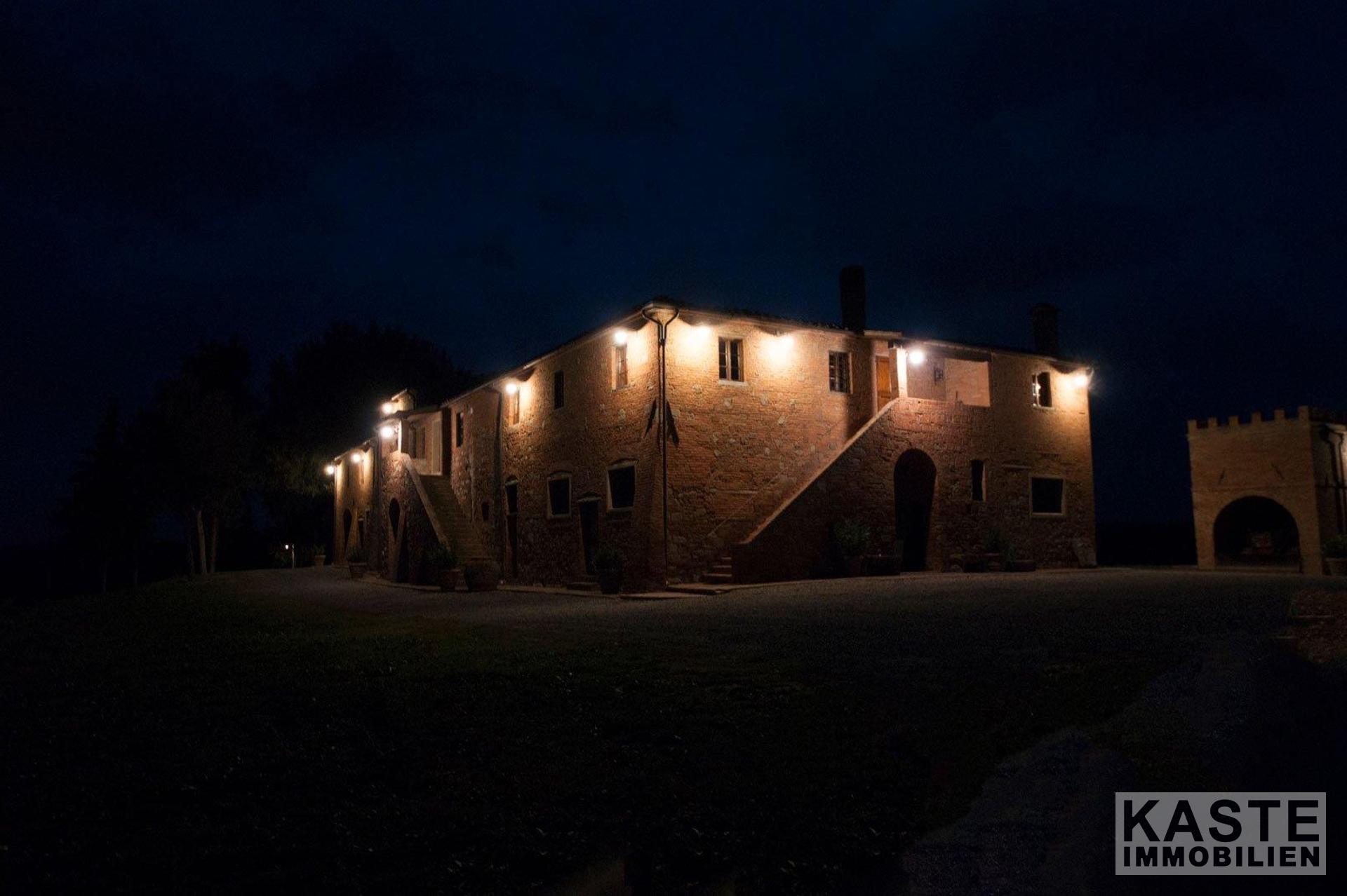 Ein riesiges Bauernhaus (ehemaliges Kloster) auf 2 Etagen mit einer Pfarrkirche aus dem Jahr 700. Umgeben von 100 ha Land mit einem See, einem Wald (welcher ein privates Wildgehege hat), vielen Feldern sowie ca. 400 Olivenbäumen. Die Zufahrt zum Grundstück erfolgt über einen sehr gepflegten Feldweg, eine Zypressenallee, die direkt vor das Bauernhaus führt. Das Anwesen liegt ganz oben auf dem Hügel mit einem 360°-Blick auf die Umgebung, welche malerisch schön ist.