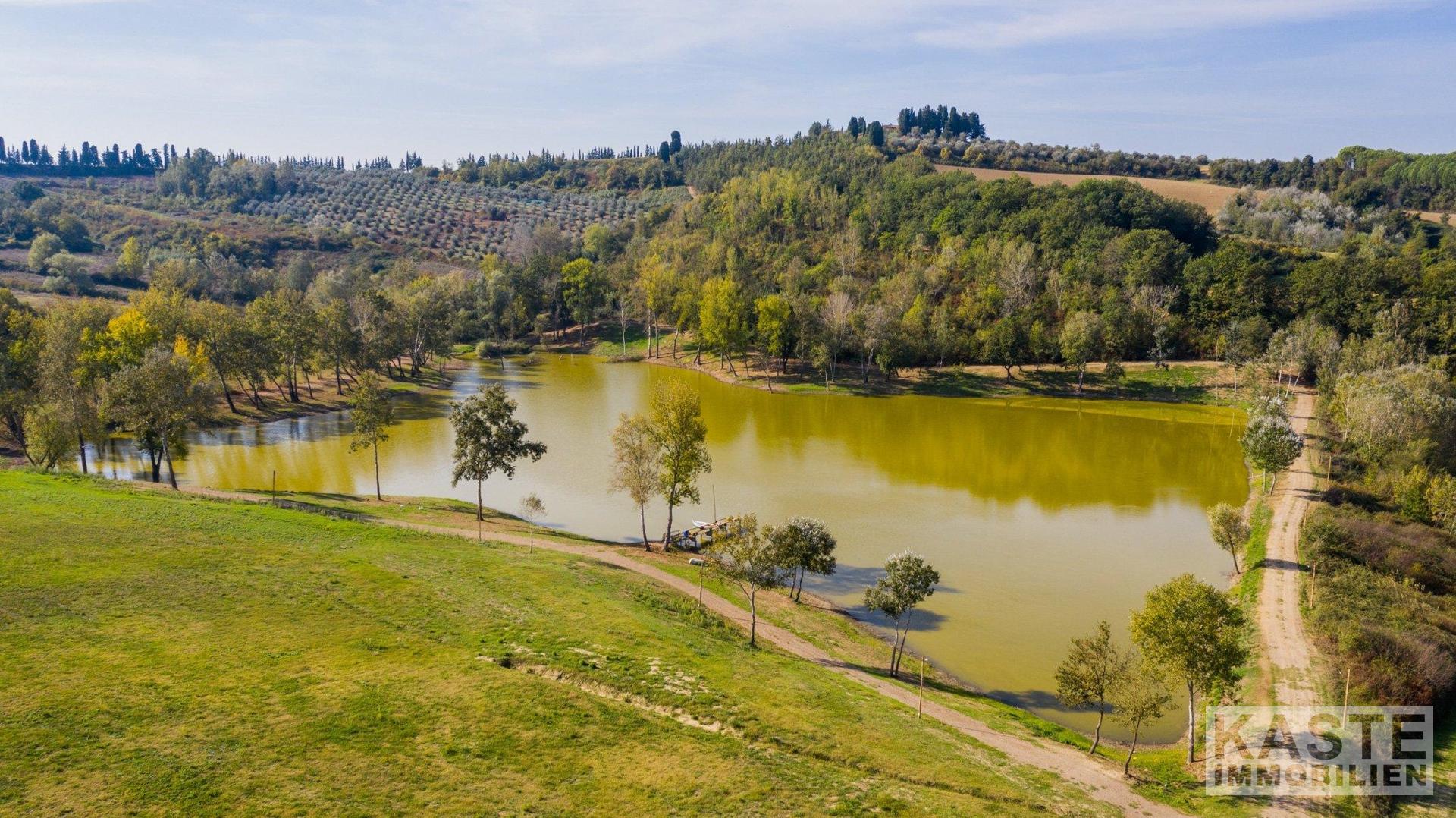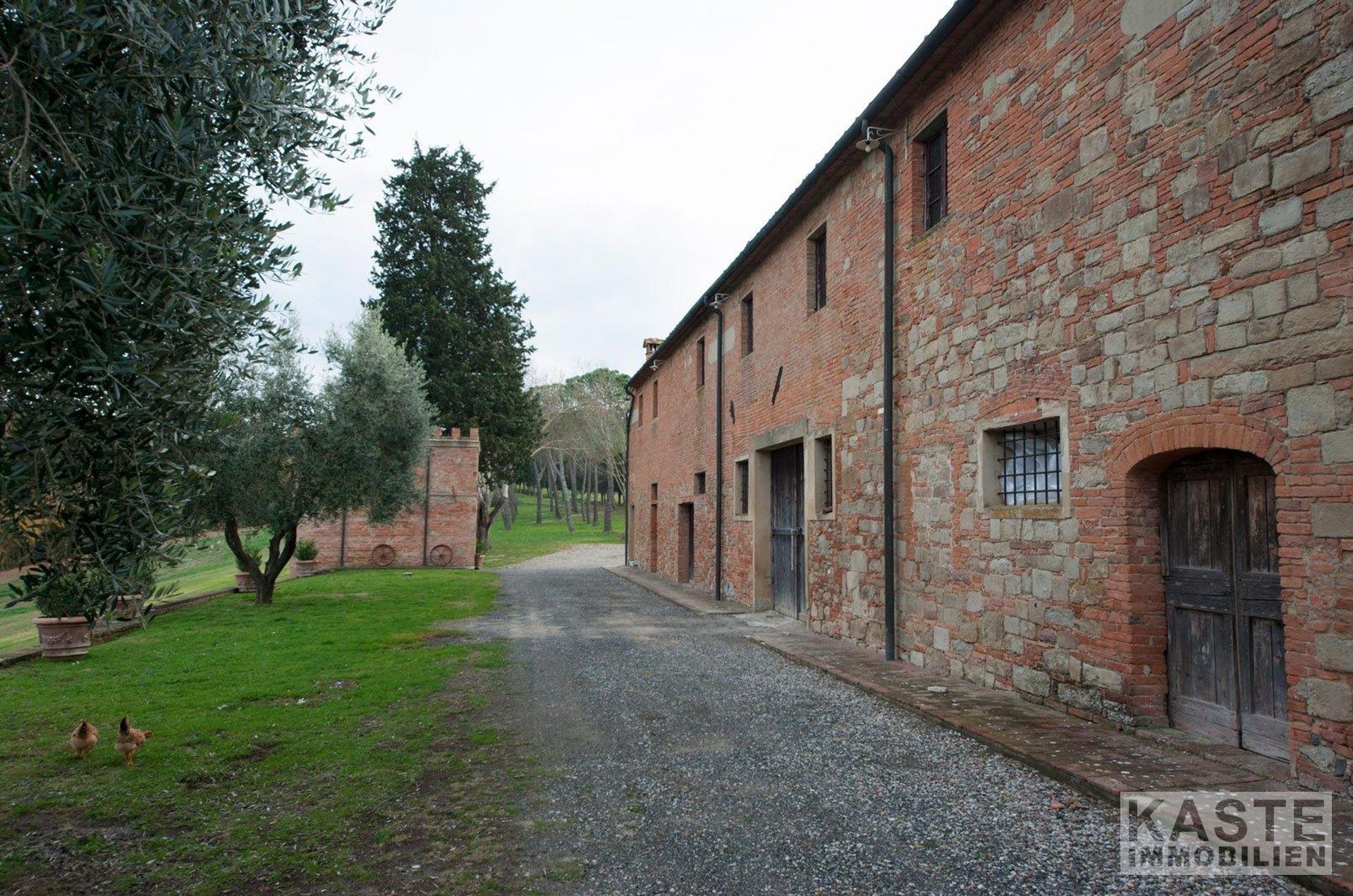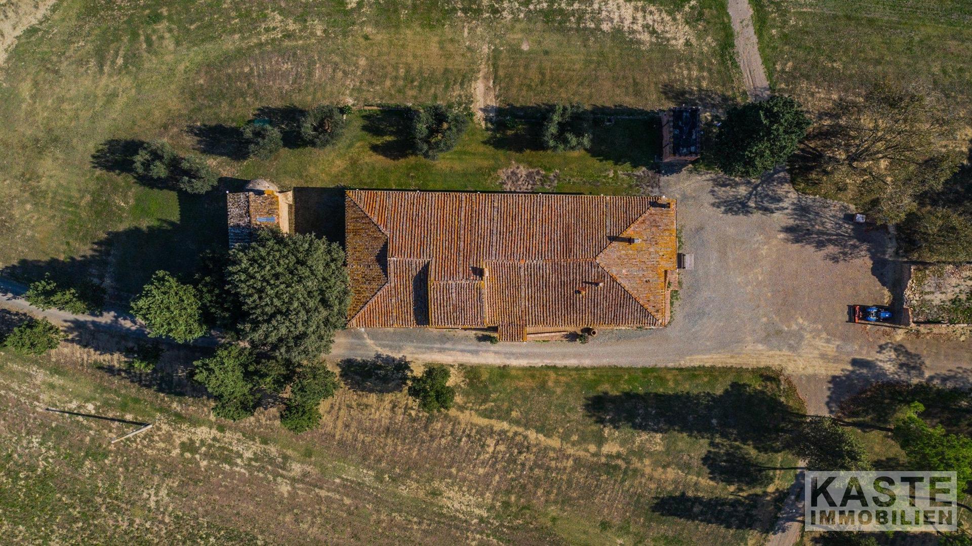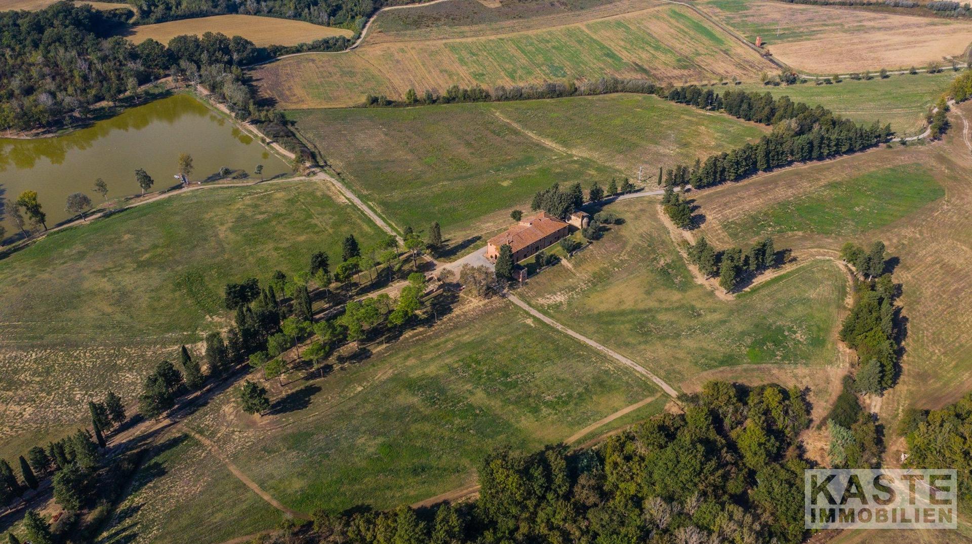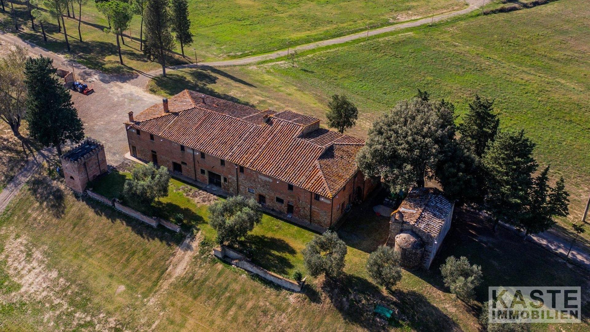 Ein riesiges Bauernhaus (ehemaliges Kloster) auf 2 Etagen mit einer Pfarrkirche aus dem Jahr 700. Umgeben von 100 ha Land mit einem See, einem Wald (welcher ein privates Wildgehege hat), vielen Feldern sowie ca. 400 Olivenbäumen. Die Zufahrt zum Grundstück erfolgt über einen sehr gepflegten Feldweg, eine Zypressenallee, die direkt vor das Bauernhaus führt. Das Anwesen liegt ganz oben auf dem Hügel mit einem 360°-Blick auf die Umgebung, welche malerisch schön ist.