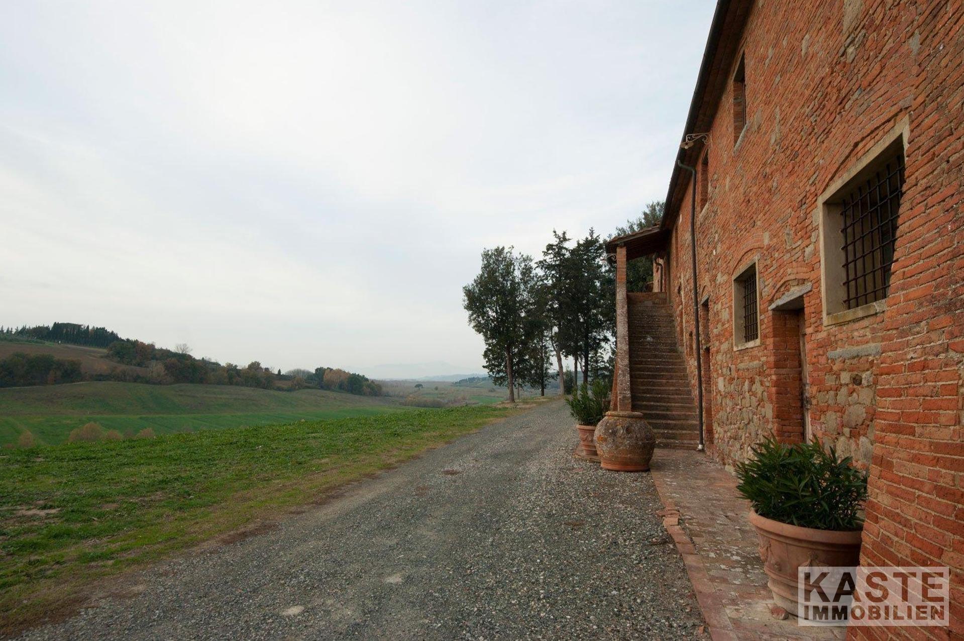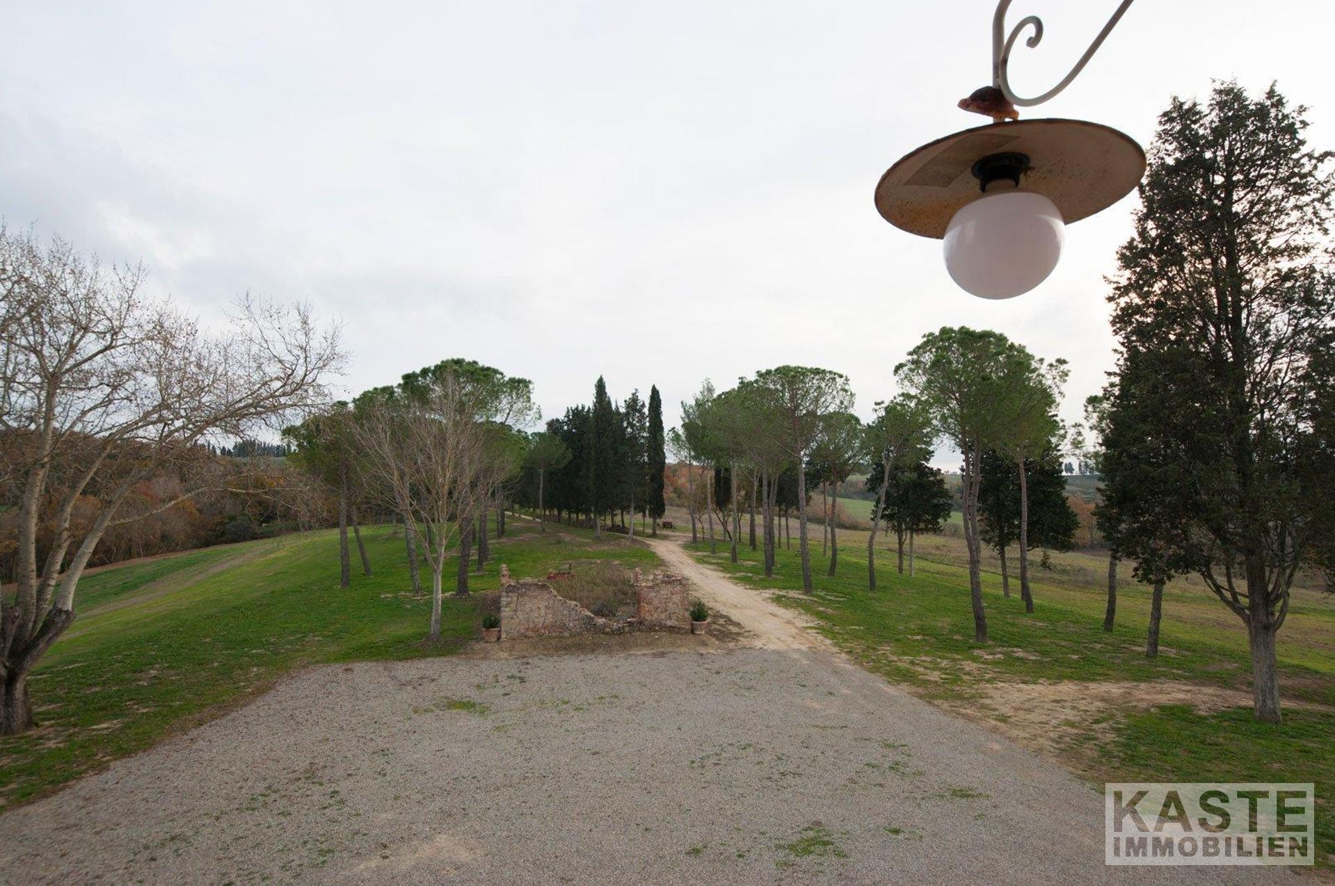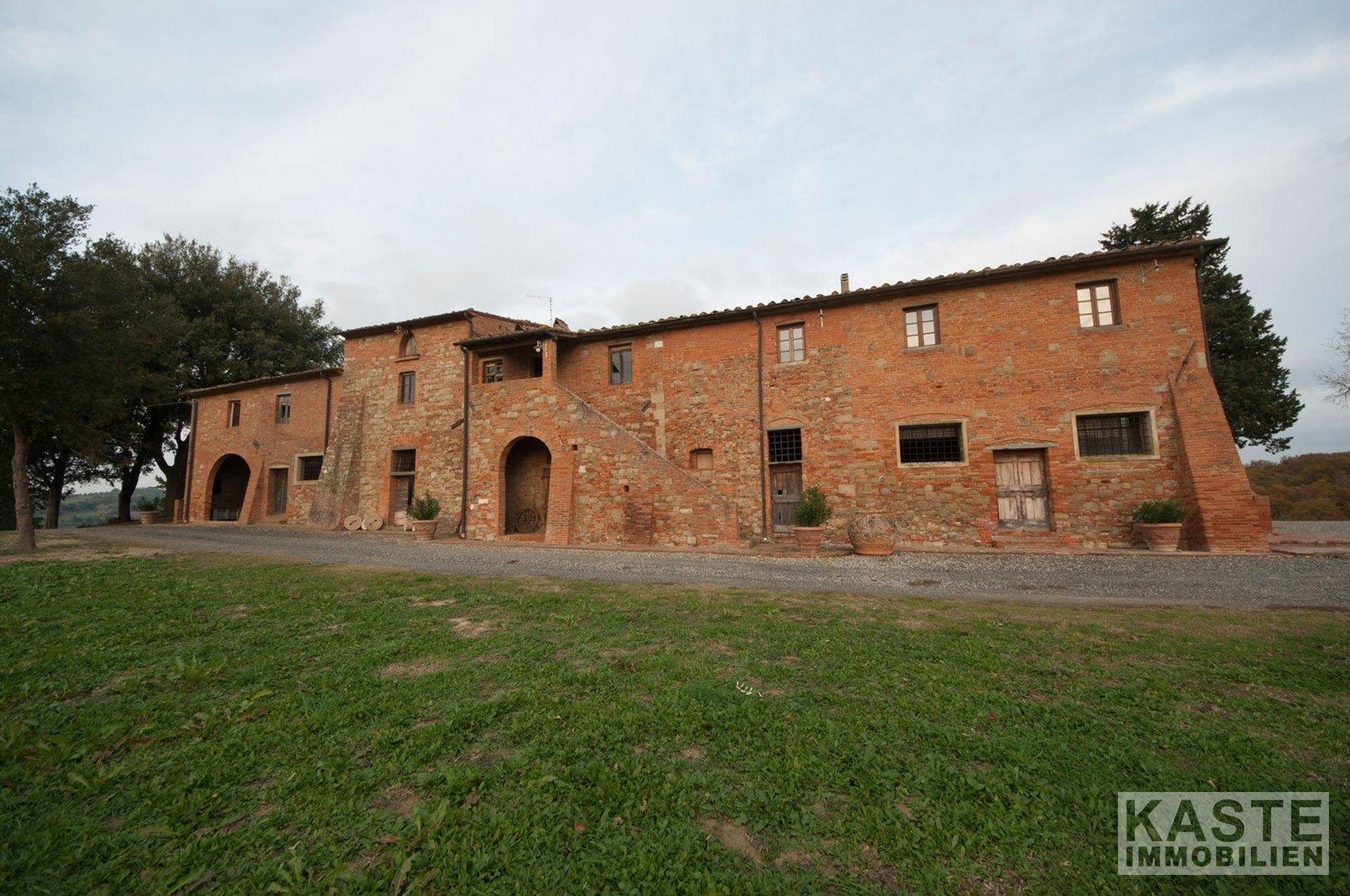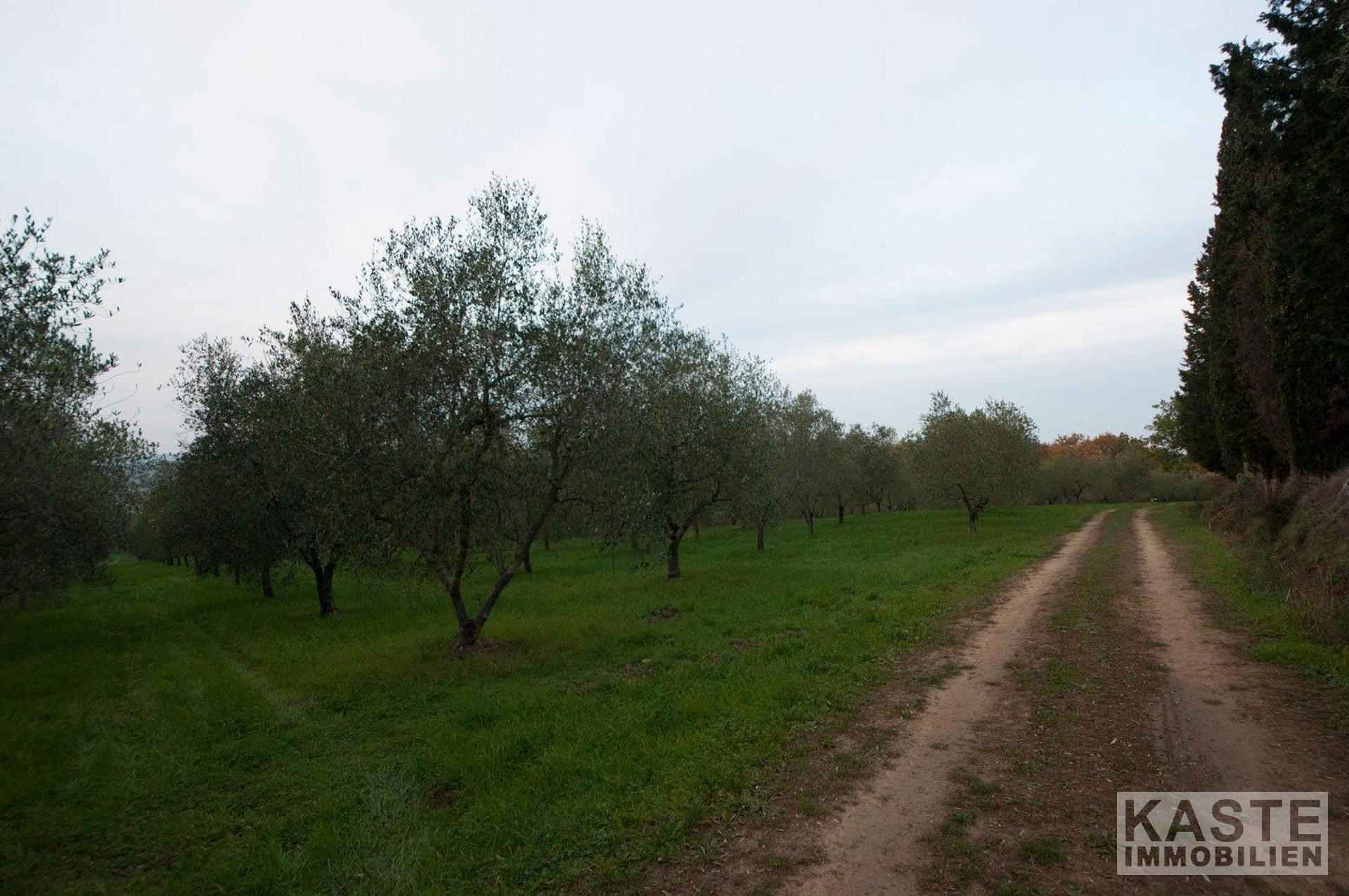 Ein riesiges Bauernhaus (ehemaliges Kloster) auf 2 Etagen mit einer Pfarrkirche aus dem Jahr 700. Umgeben von 100 ha Land mit einem See, einem Wald (welcher ein privates Wildgehege hat), vielen Feldern sowie ca. 400 Olivenbäumen. Die Zufahrt zum Grundstück erfolgt über einen sehr gepflegten Feldweg, eine Zypressenallee, die direkt vor das Bauernhaus führt. Das Anwesen liegt ganz oben auf dem Hügel mit einem 360°-Blick auf die Umgebung, welche malerisch schön ist.