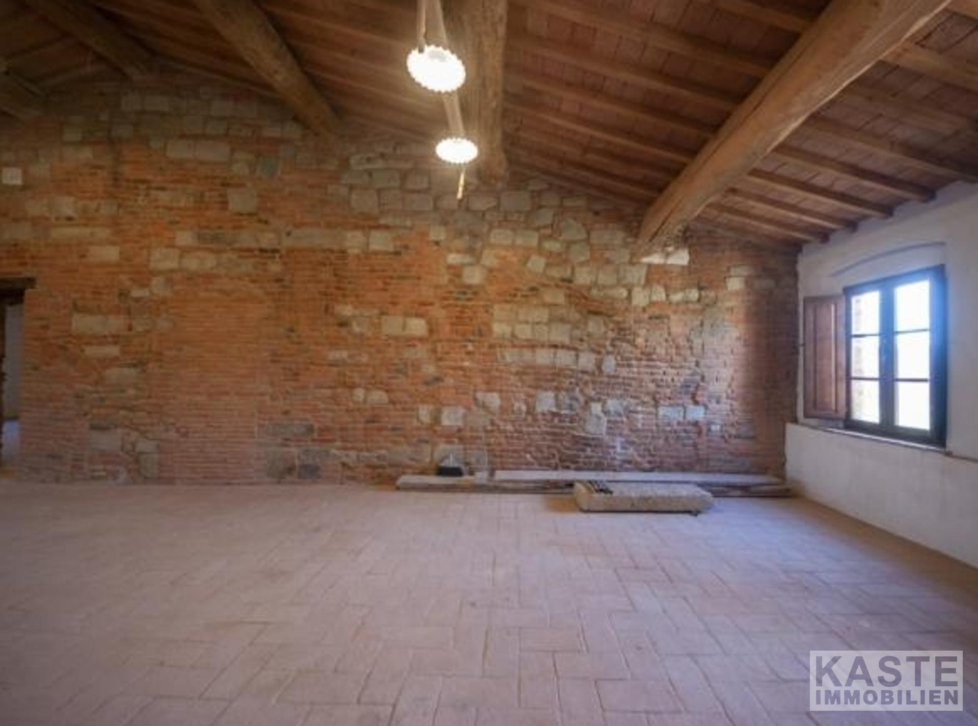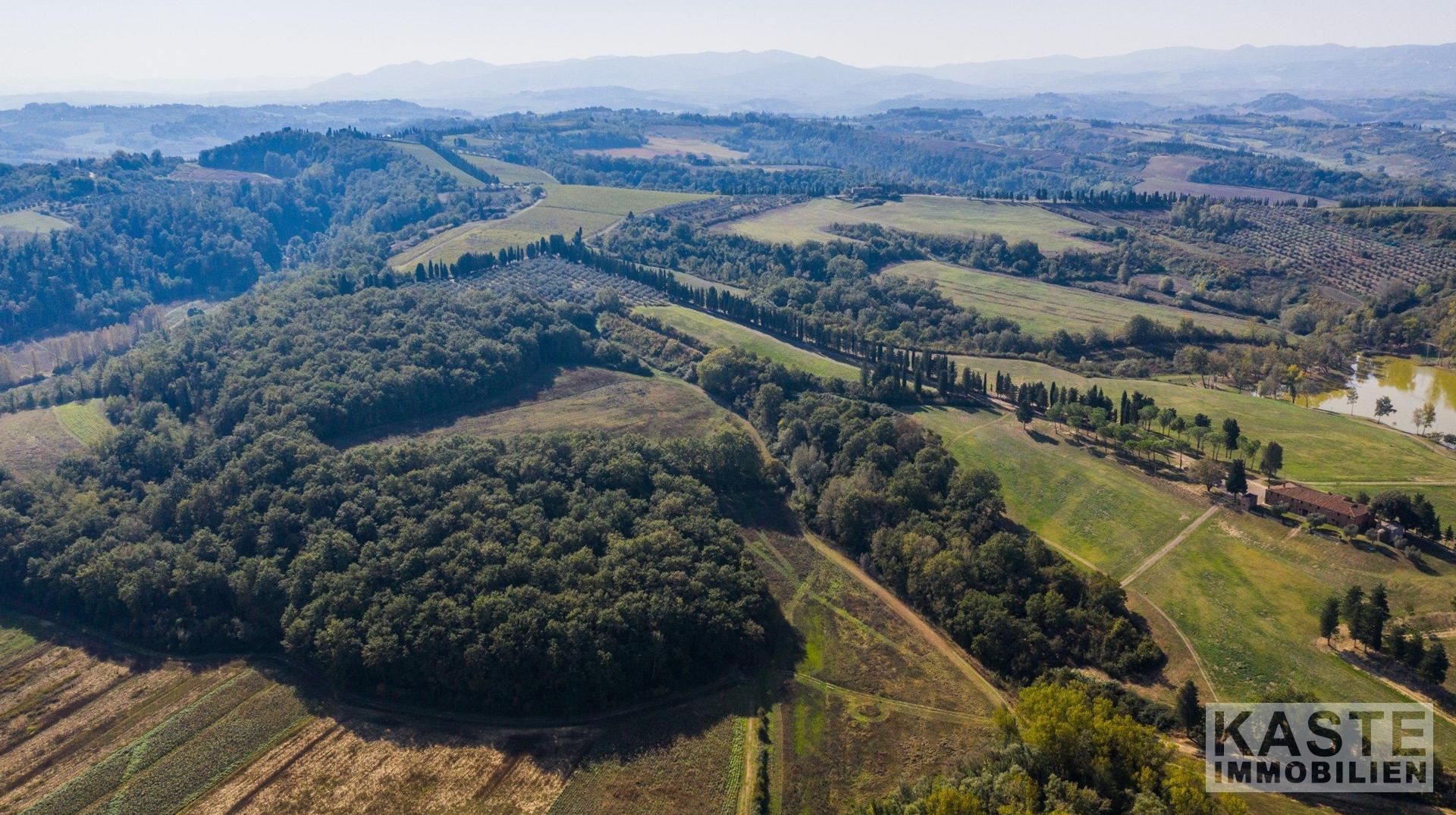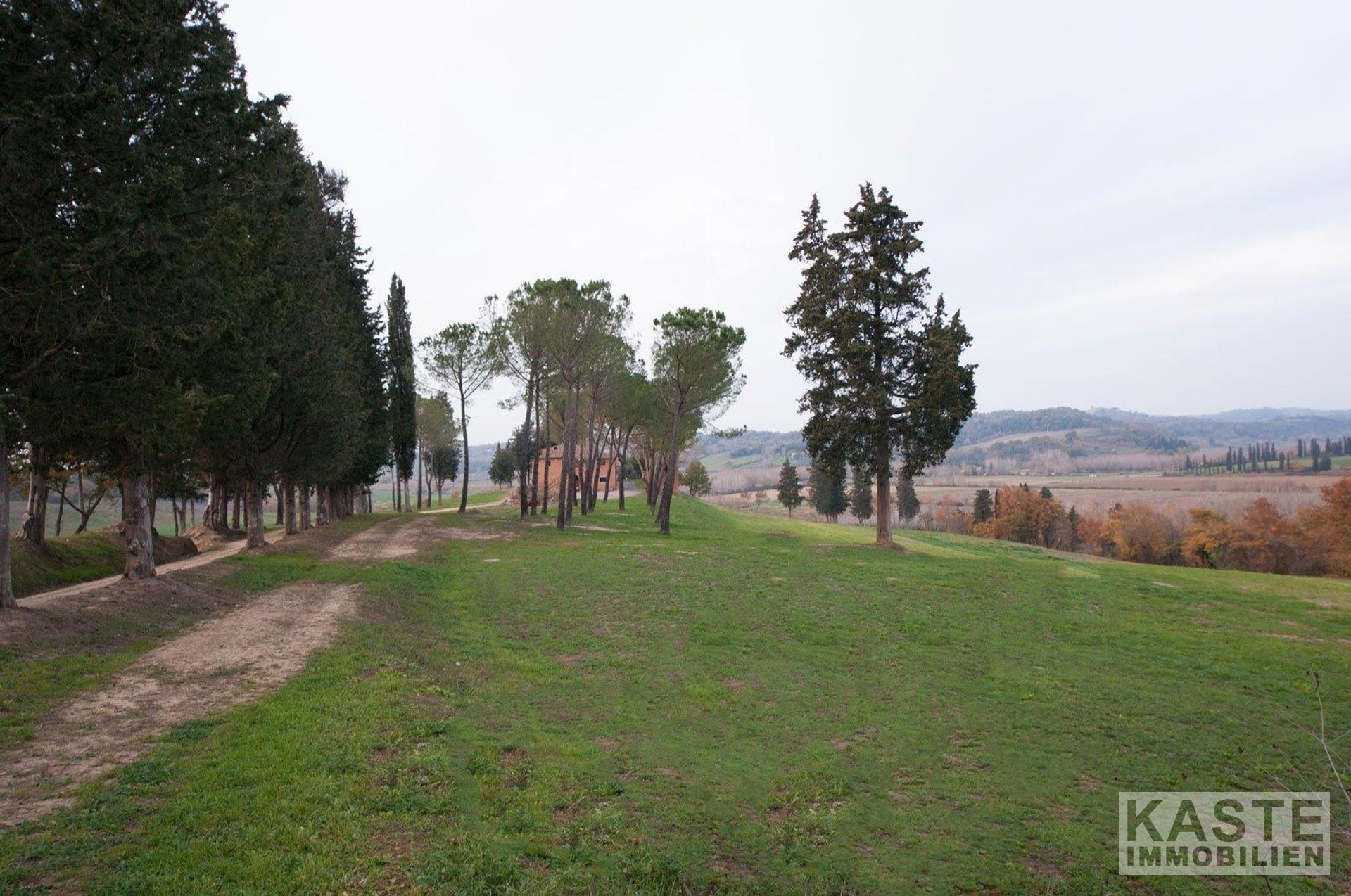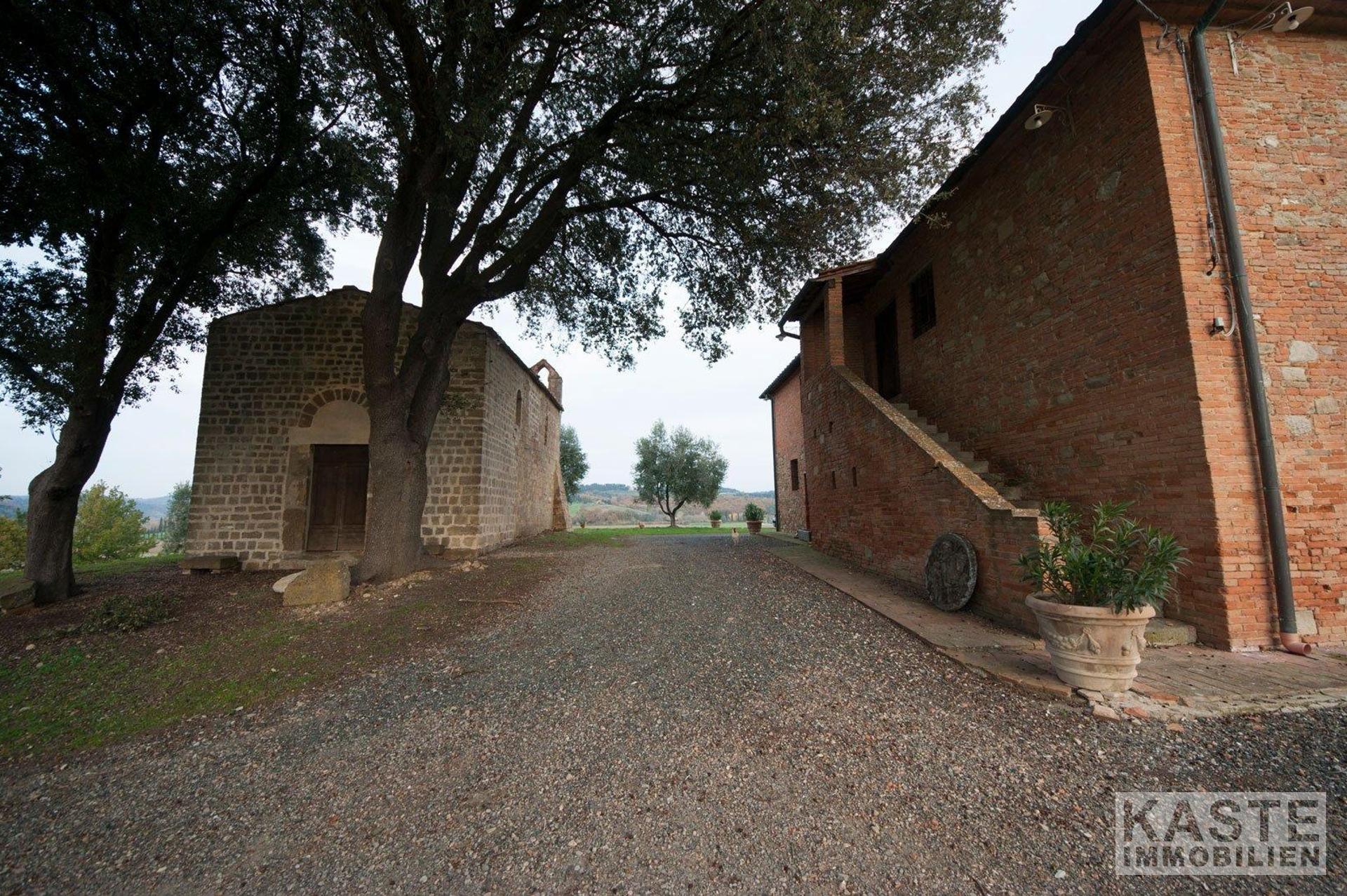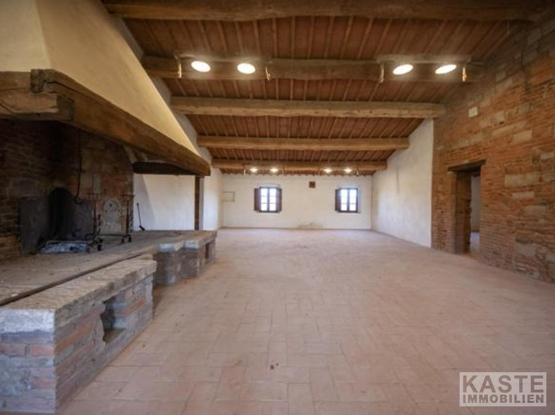 Ein riesiges Bauernhaus (ehemaliges Kloster) auf 2 Etagen mit einer Pfarrkirche aus dem Jahr 700. Umgeben von 100 ha Land mit einem See, einem Wald (welcher ein privates Wildgehege hat), vielen Feldern sowie ca. 400 Olivenbäumen. Die Zufahrt zum Grundstück erfolgt über einen sehr gepflegten Feldweg, eine Zypressenallee, die direkt vor das Bauernhaus führt. Das Anwesen liegt ganz oben auf dem Hügel mit einem 360°-Blick auf die Umgebung, welche malerisch schön ist.