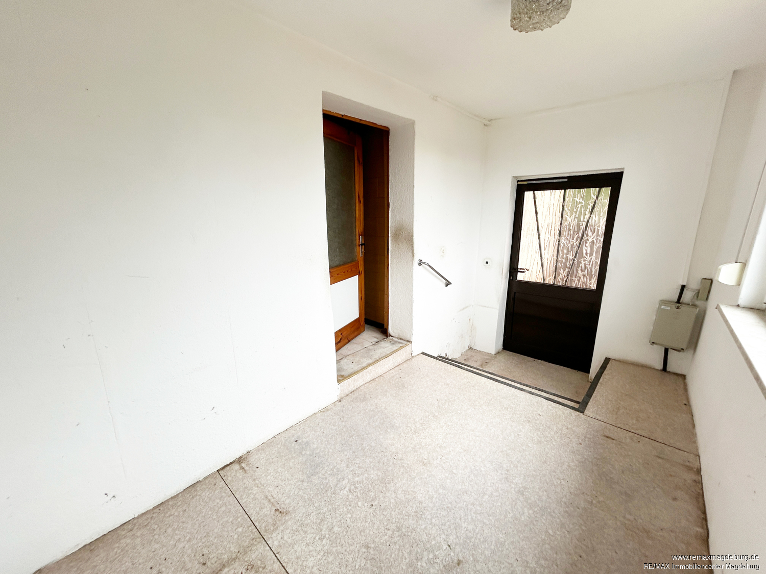 Über den Windfang gelangen Sie in den zentralen Flur. Das Wohnzimmer mit Kamin ist direkt mit dem angrenzenden Schlafzimmer verbunden. Ergänzt wird das Raumangebot durch eine funktionale Küche und ein Tageslichtbad, welches mit einer Dusche ausgestattet ist. Zwei Abstellräume sowie ein Lagerbereich bieten zusätzliche Flächen, die sich hervorragend für die Umgestaltung in Wohn- oder Nutzräume, wie zum Beispiel ein Büro, eine geräumige Wohnküche oder ein Hauswirtschaftsraum eignen.