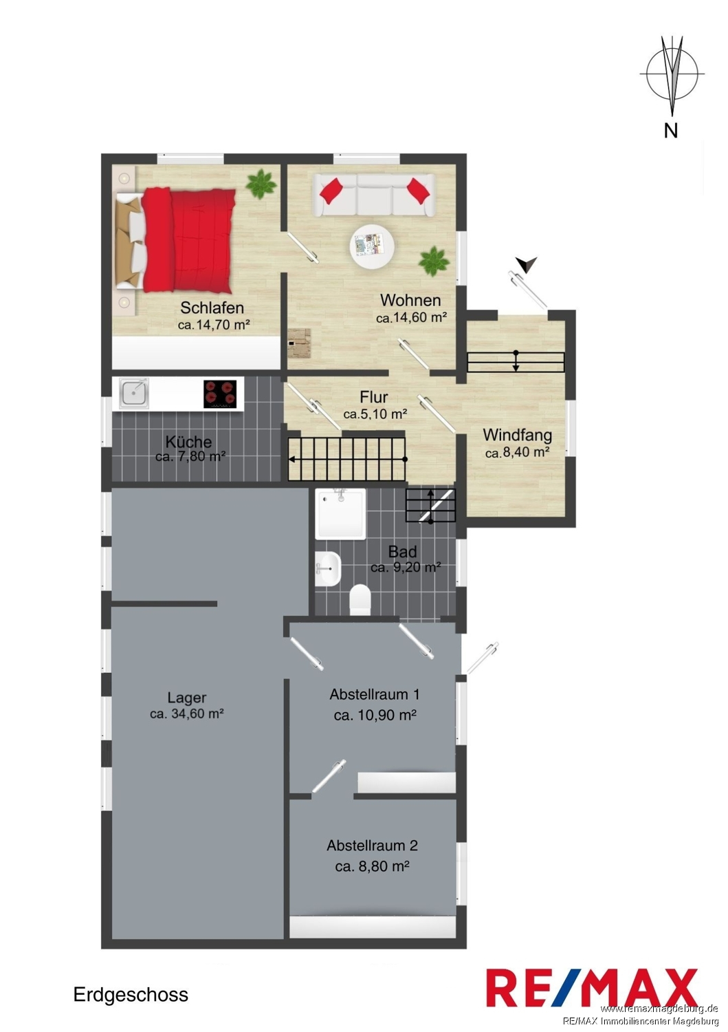 Erdgeschoss: - Windfang, - Flur, - Wohnen mit Kamin, - Schlafen, - Küche, - Bad mit Dusche, - Abstellraum 1, - Abstellraum 2, - Lager