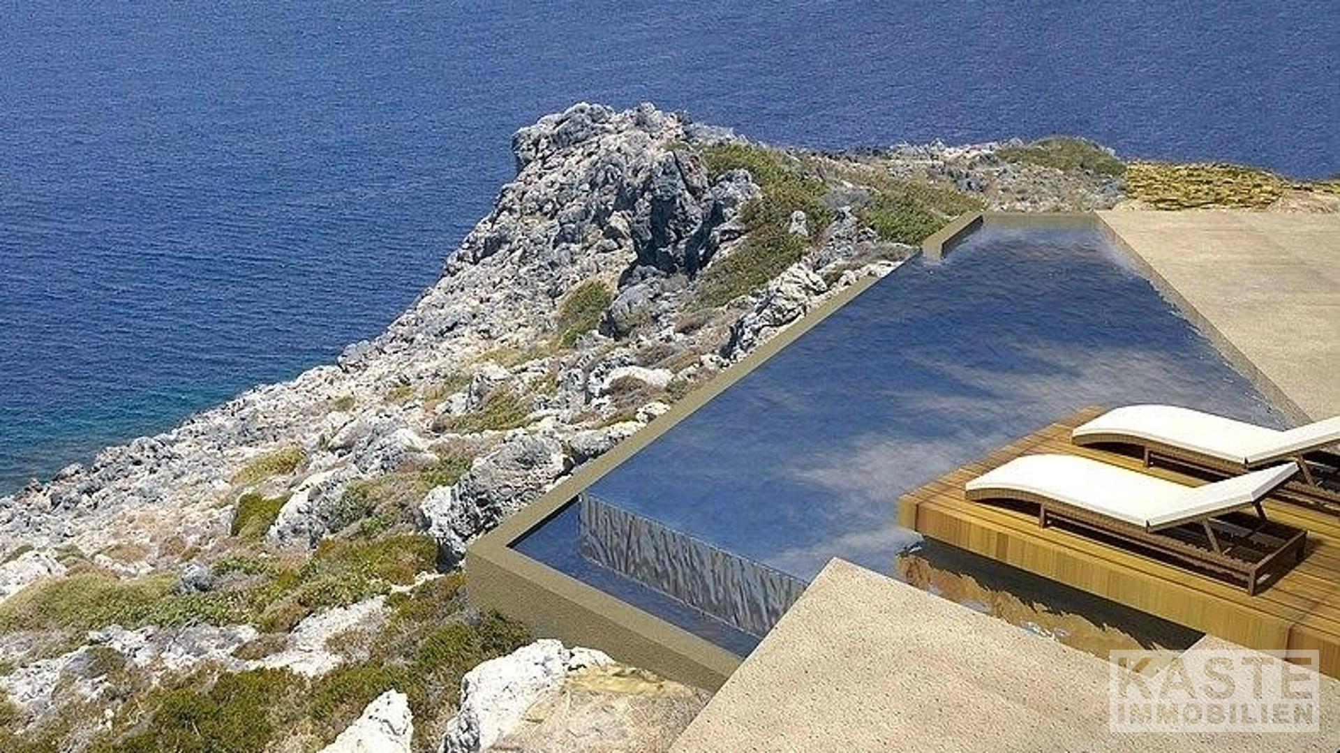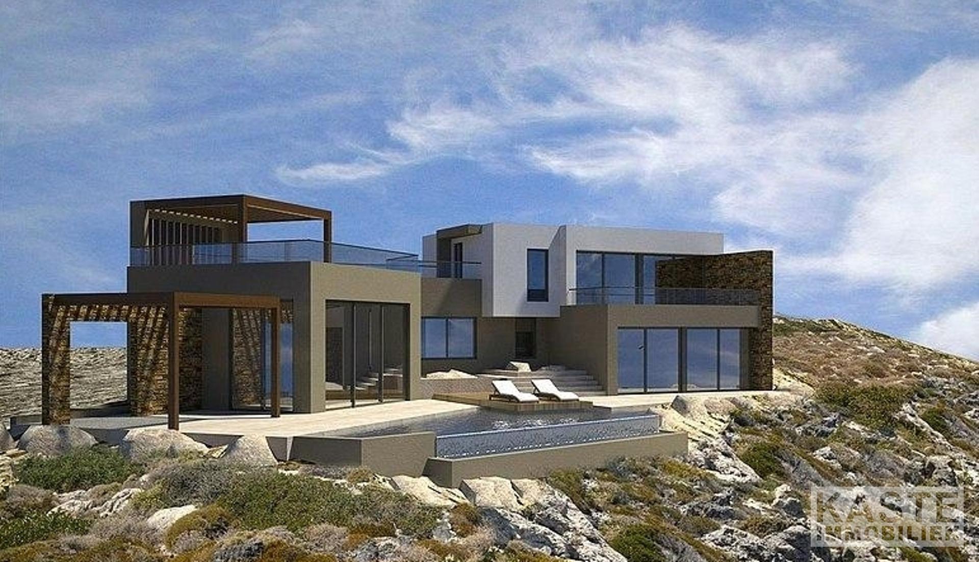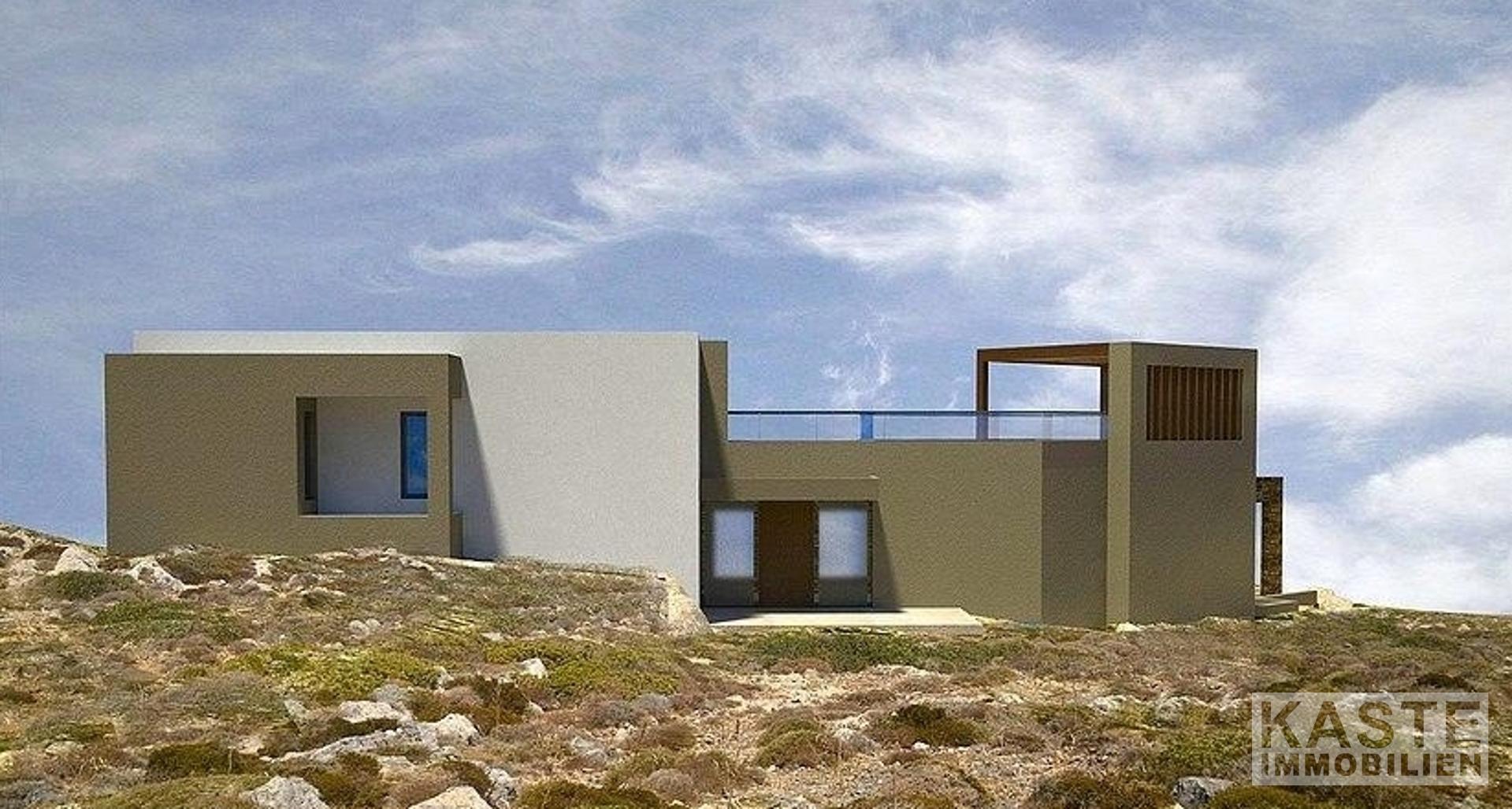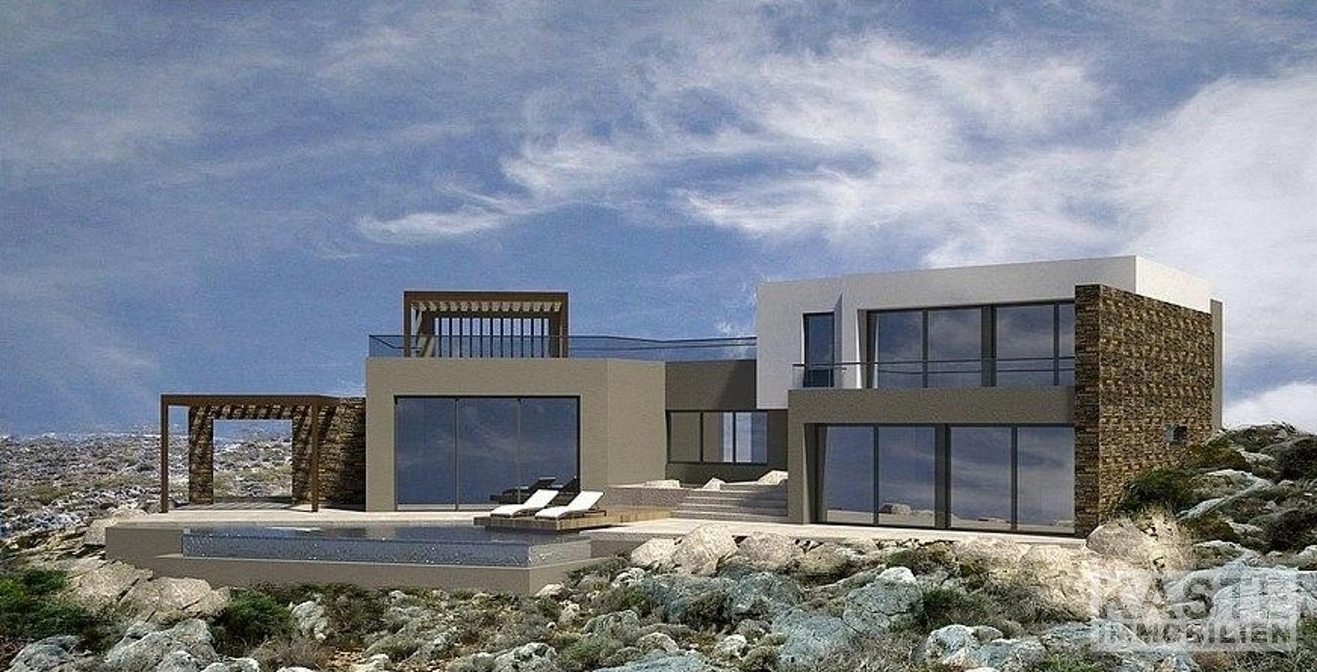 Das moderne Designerhaus mit vier Schlafzimmern liegt am Rande einer Klippe und bietet einen Panoramablick auf das glitzernde blaue Wasser der Ägäis. Es wurde sorgfältig entworfen, um die atemberaubende Landschaft und die Bilderbuch-Sonnenuntergänge, die diese exklusive Gegend zu bieten hat, in vollem Umfang zu nutzen und gleichzeitig seinen Bewohnern ein Maximum an Privatsphäre zu bieten.