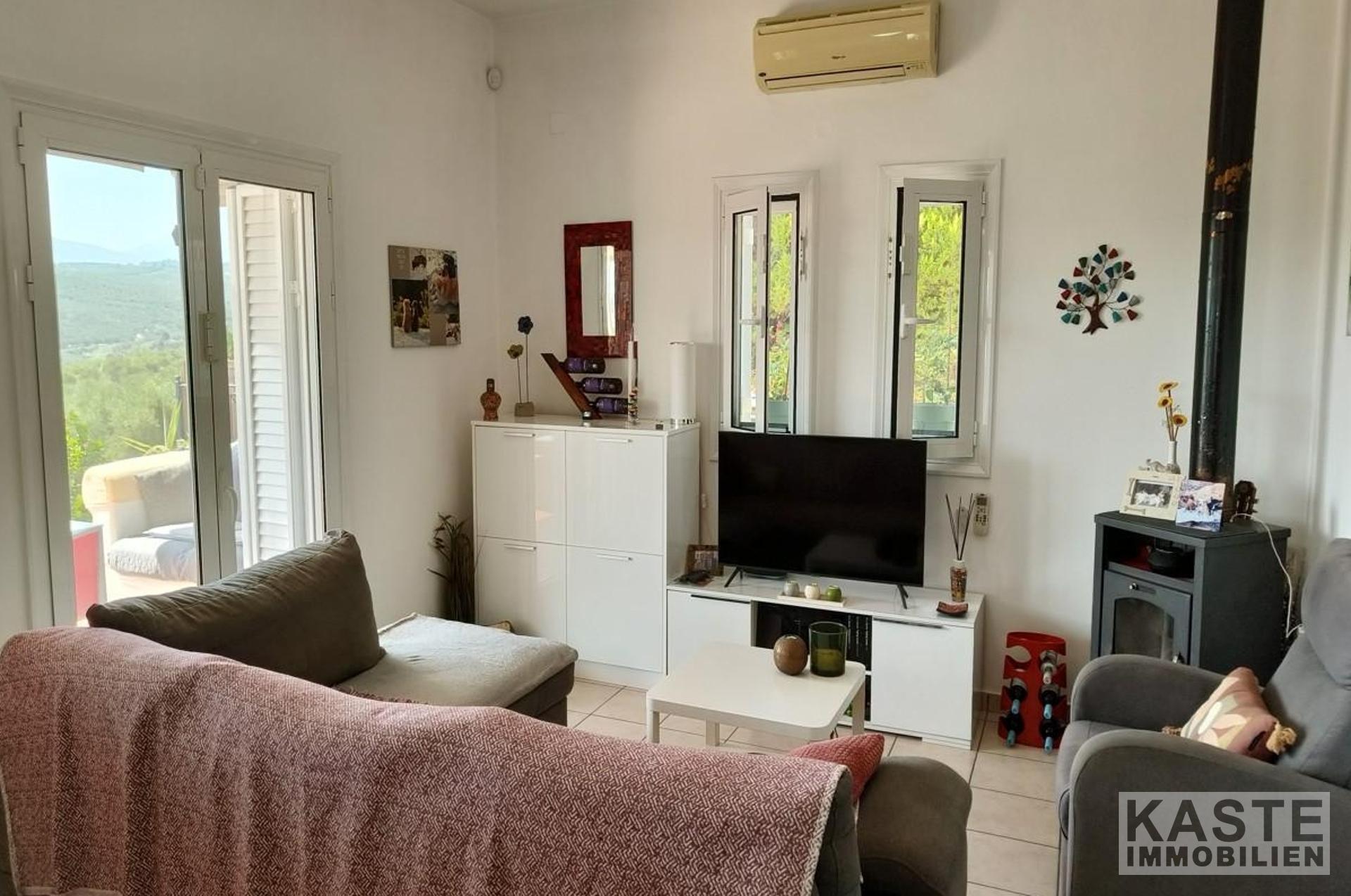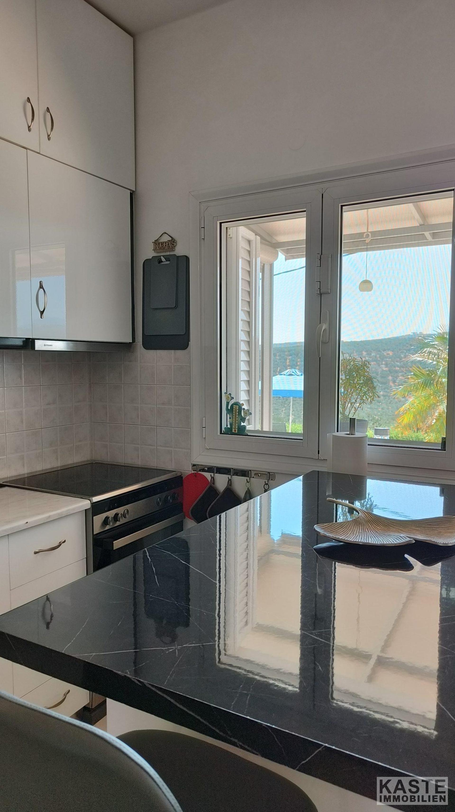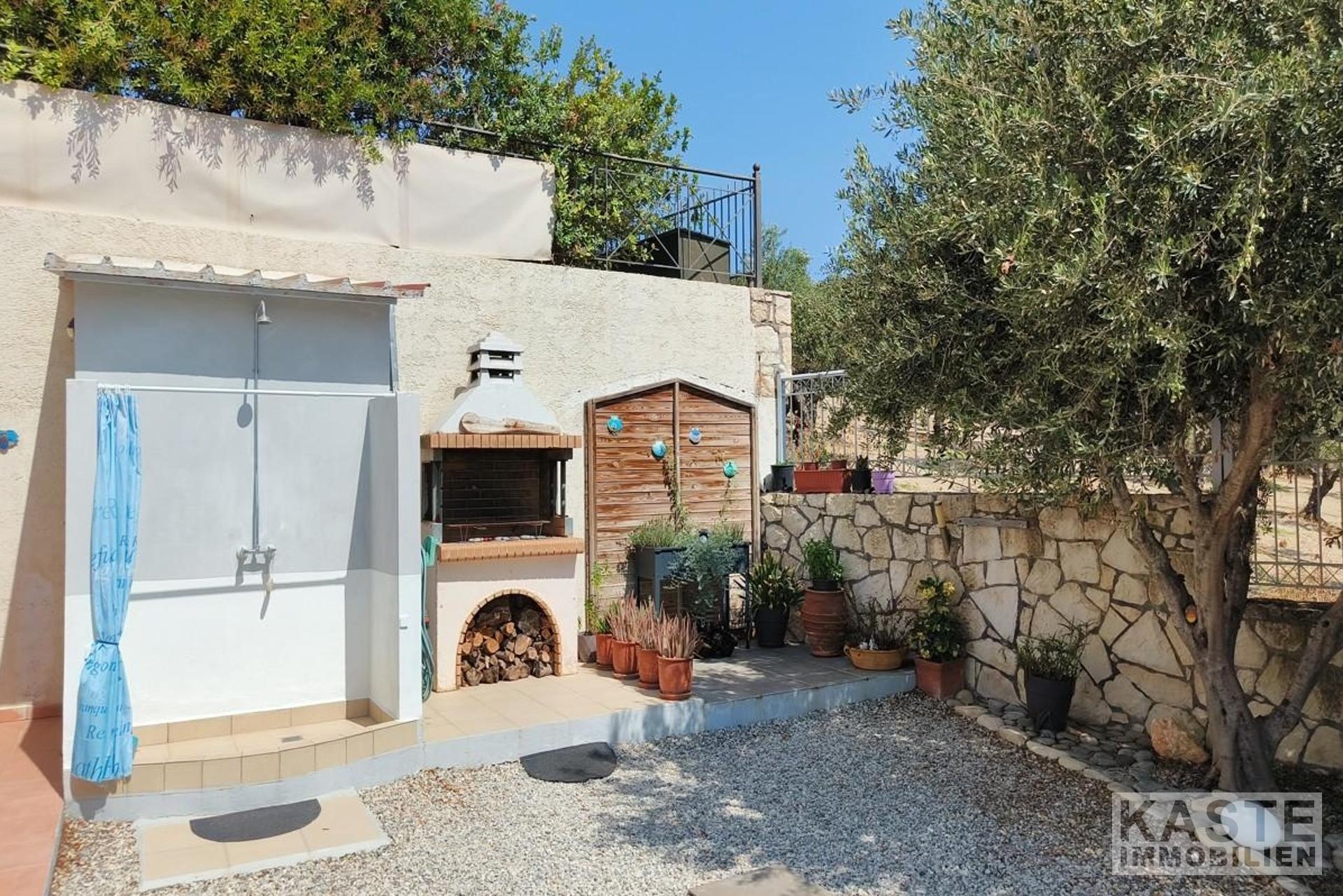 Besonderes Highlight der Residenz ist der private Swimmingpool umgeben von einer Liegewiese und mehreren komfortablen Sitzbereichen, die wie der gemauerte Grill aber auch die Außendusche und das separate WC im Freien zu entspannten Stunden oder geselligen Treffen einladen. Ein schöner gepflegter Garten mit mediterraner Vegetation sorgt für Privatsphäre und eine freundliche Atmosphäre, unterstützt von der Hanglage des Gebäudes mit Blickschutz zur Straße. Im Inneren empfängt Sie eine helle, modern ausgestattete Einbauküche und ein gemütlicher Wohnbereich mit naturbelichteten Fenstern. Für kühlere Monate steht ein wertvoller Holzofen bereit, der neben der effizienten Klimaanlage für wohlige Wärme sorgt.