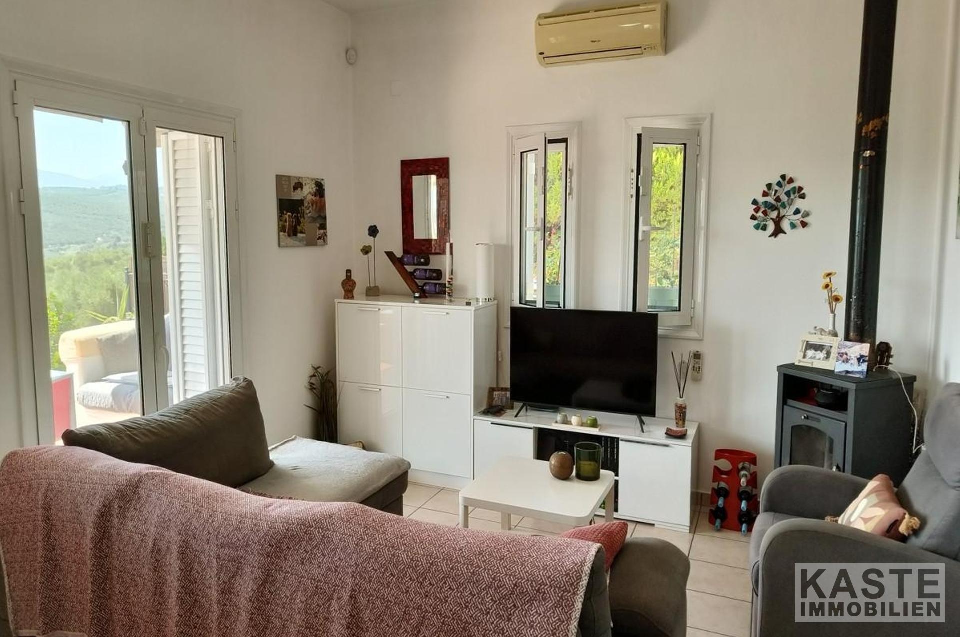 Besonderes Highlight der Residenz ist der private Swimmingpool umgeben von einer Liegewiese und mehreren komfortablen Sitzbereichen, die wie der gemauerte Grill aber auch die Außendusche und das separate WC im Freien zu entspannten Stunden oder geselligen Treffen einladen. Ein schöner gepflegter Garten mit mediterraner Vegetation sorgt für Privatsphäre und eine freundliche Atmosphäre, unterstützt von der Hanglage des Gebäudes mit Blickschutz zur Straße. Im Inneren empfängt Sie eine helle, modern ausgestattete Einbauküche und ein gemütlicher Wohnbereich mit naturbelichteten Fenstern. Für kühlere Monate steht ein wertvoller Holzofen bereit, der neben der effizienten Klimaanlage für wohlige Wärme sorgt.