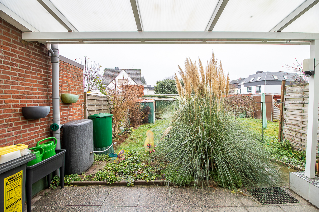 Dieses gepflegte Reihenmittelhaus überzeugt durch eine klassische Raumaufteilung und ein angenehmes Wohnambiente. Im Erdgeschoss empfängt ein zentraler Flur, von dem aus die Küche mit Einbauküche, das Gäste-WC sowie das Wohnzimmer erreichbar sind. Der Wohn- und Essbereich bildet den Mittelpunkt des Hauses und wird durch den vorhandenen Kamin besonders gemütlich. Von hier aus besteht direkter Zugang zur überdachten Terrasse und in den Garten.