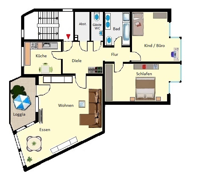 Wohn und EssbereichKücheTeilansicht SchlafzimmerTeilansicht SchlafzimmerBadezimmerBüro/KinderzimmerGäste WCWaschkücheTiefgaragenplatzGrundrissFür Sie vor Ort!Loggia in Südlage