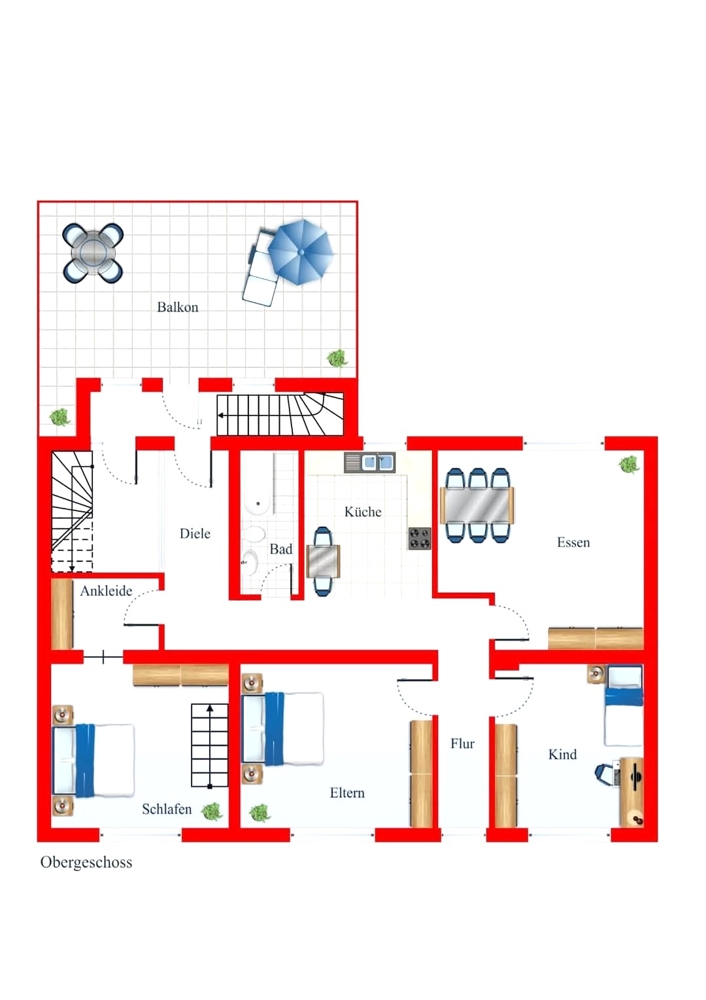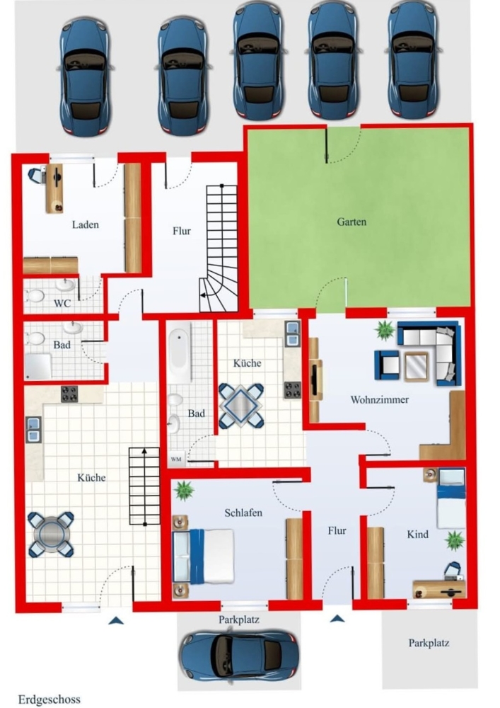 4.) Eine Wohneinheit (mit separatemTreppenaufgang neben der Gewerbeeinheit), mit Diele, Küche mit EBK, Wohn-/Esszimmer, Elternschlafzimmer, Kinderzimmer und großem, überdachtem Balkon