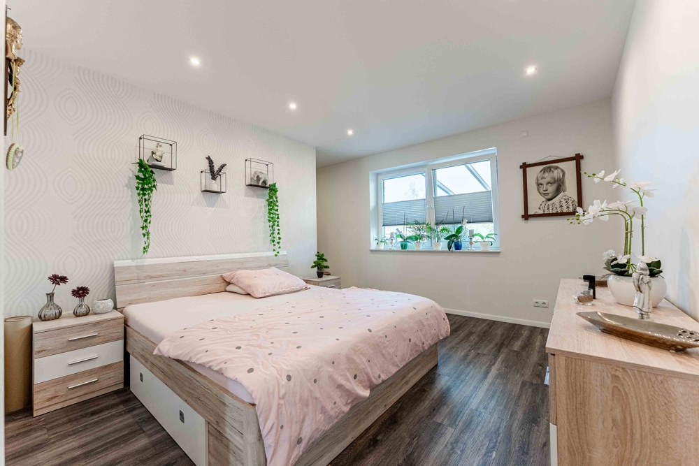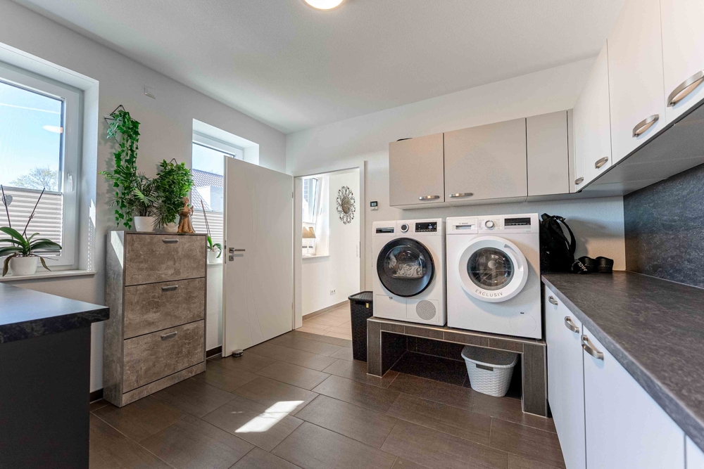 - Überdachte Terrasse: ca. 36 qm - Elternschlafzimmer: ca. 15,92 qm - Umkleide: ca. 6,06 qm - Bad: ca. 9,48 qm - Gästezimmer: ca. 11,51 qm - WC: ca. 3,68 qm - Diele: ca. 15,01 qm - Hauswirtschaftsraum: ca. 10,70 qm - Speisekammer: ca. 4,41 qm - Offenes Wohnen/Küche: ca. 46,84 qm