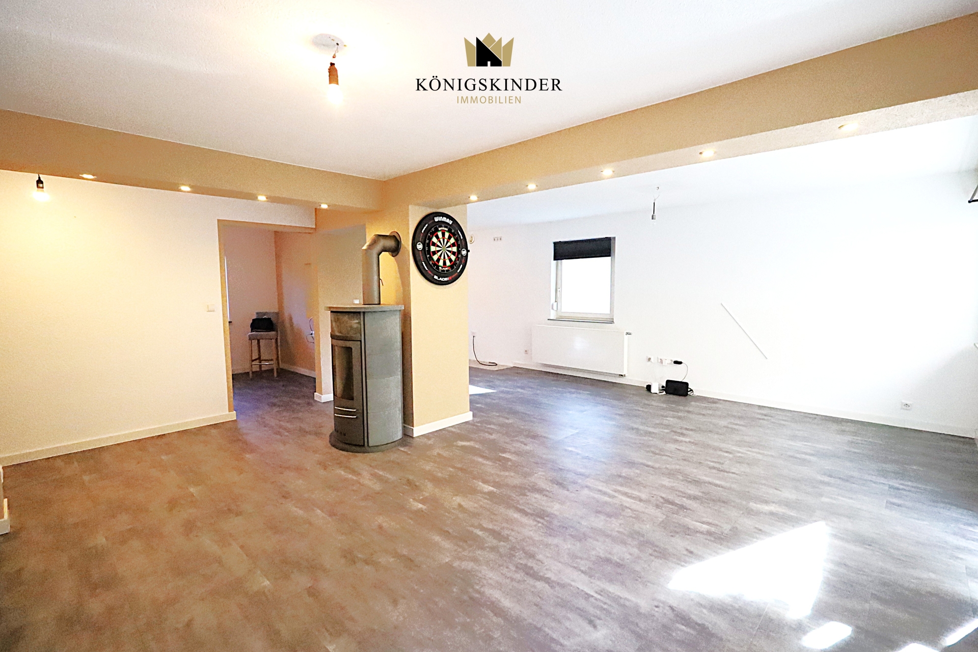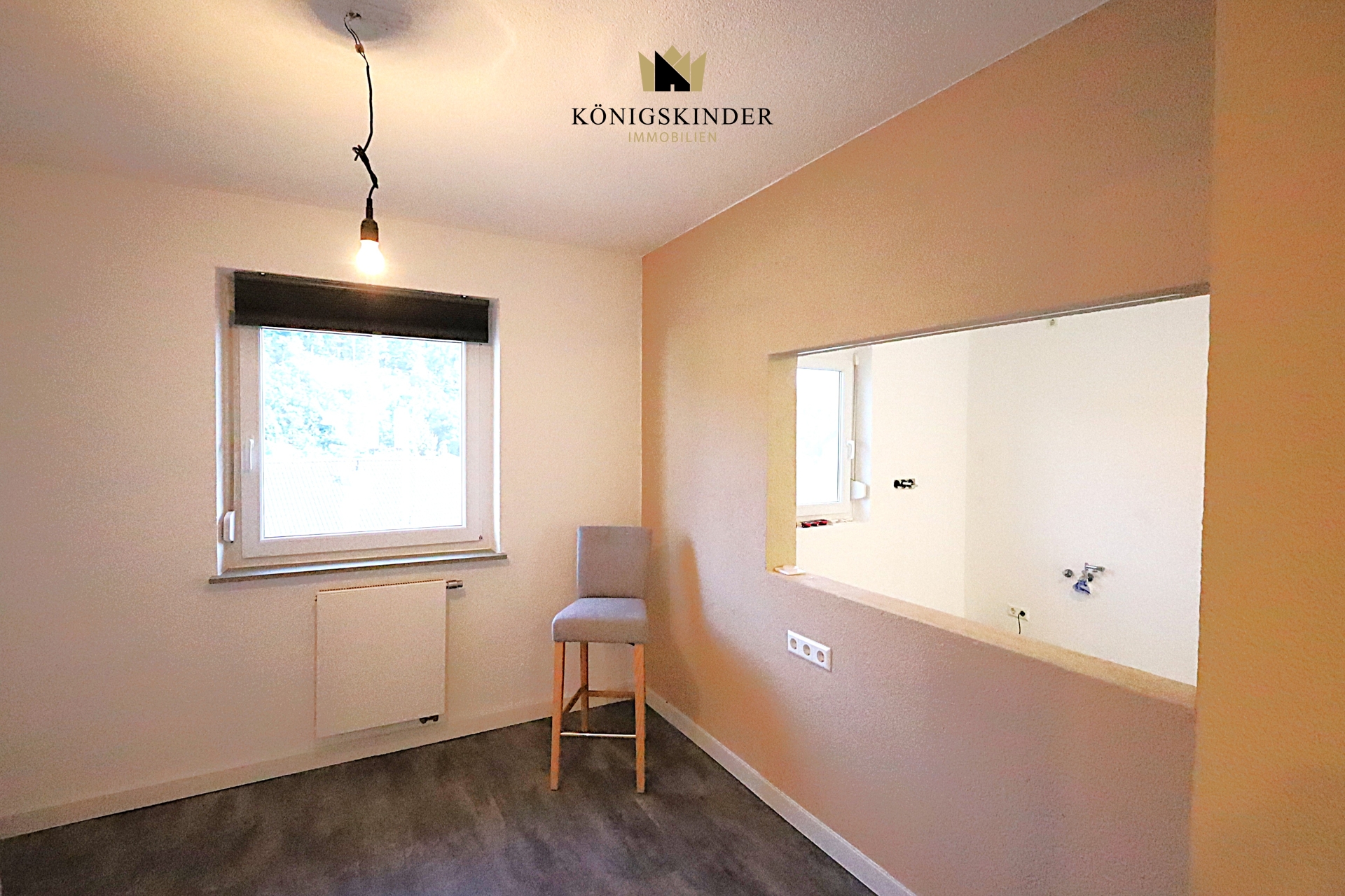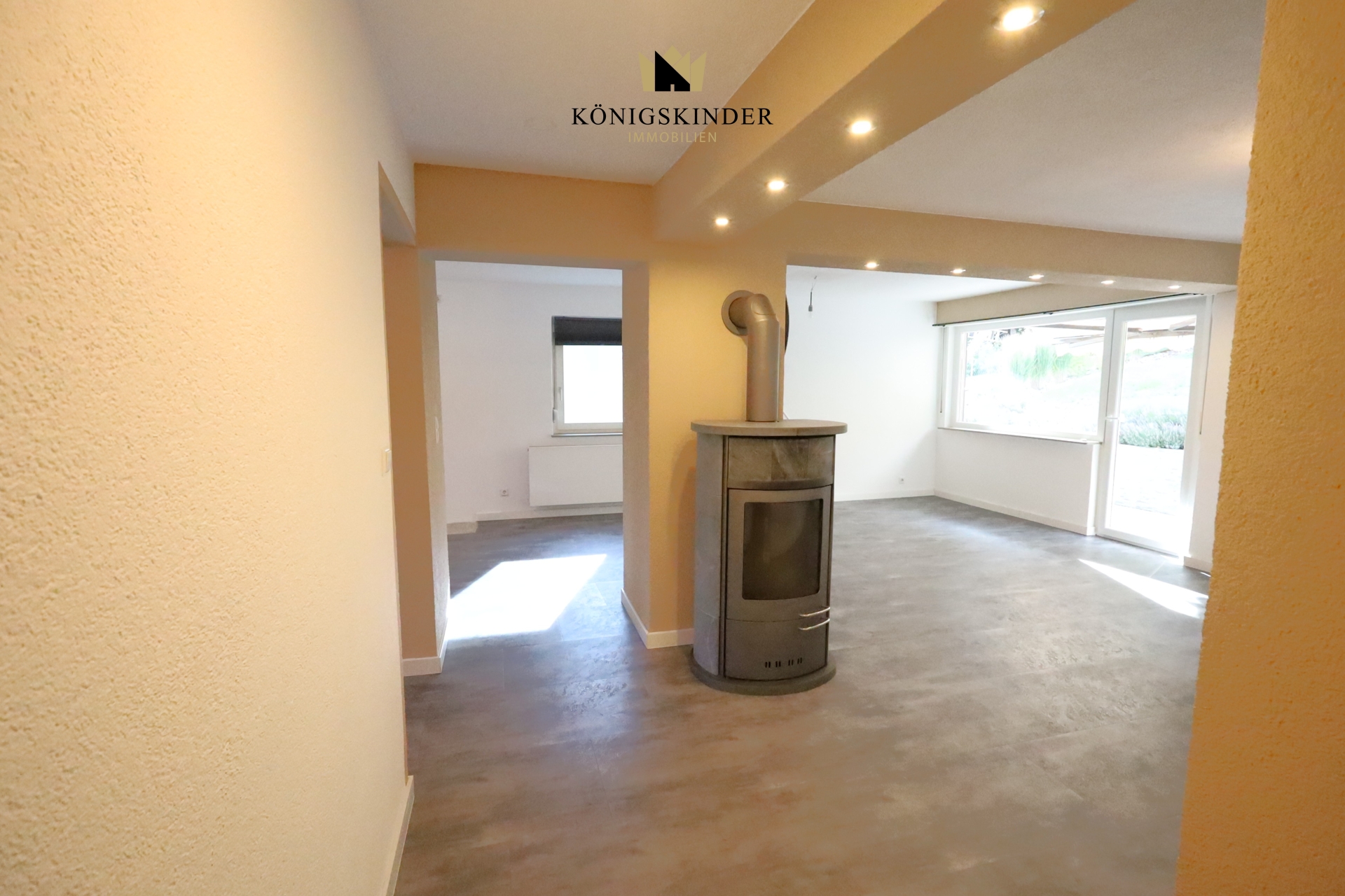 Das Haus ist geschickt in den Hang gebaut, sodass Sie die notwendigen Nutzräume im Hang haben und die Wohnräume hangabwärts im Gartengeschoß: 2 Zimmer, ein Duschbad eine kleine Küche (mit Einbauten) und ein Arbeitszimmer - für was immer Sie es nutzen möchten... Auf der Ebene befindet sich auch die Waschküche, Heizung und Abstellmöglichkeiten. Im Geschoss darüber, dem "eigentlichen" Erdgeschoss, ist Ihr zentraler Lebensbereich mit üppig großem Wohnbereich, Zugang zur offenen Küche (die im Bild zu sehenden Einbauten sind entfernt - Sie haben die Möglichkeit Ihrer eigenen Gestaltung) und zuj Essplatz. Dazu das elterliche Schlafzimmer, das Kinderzimmer und das Duschbad.