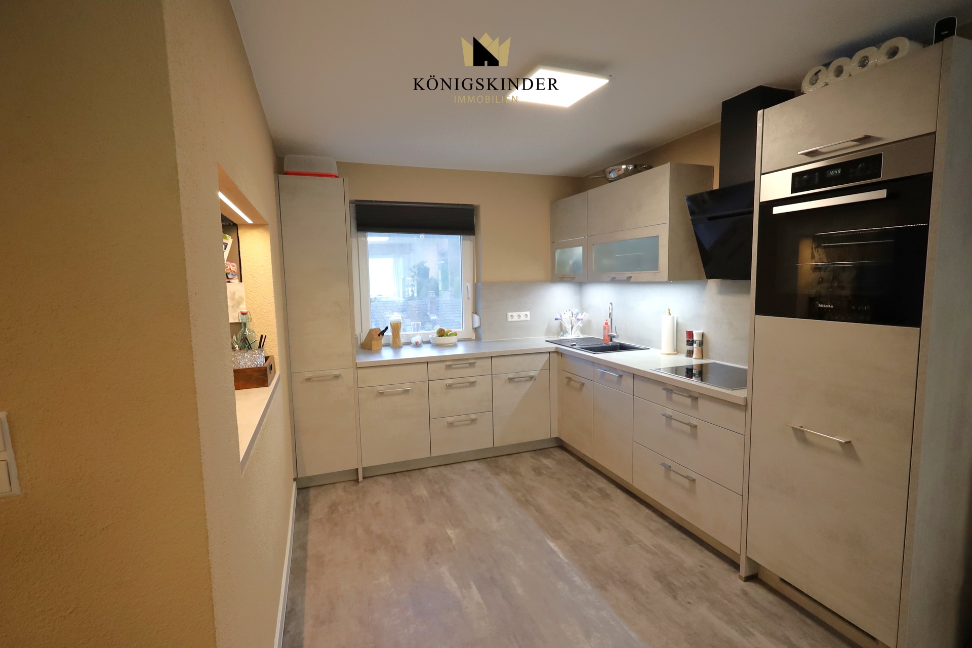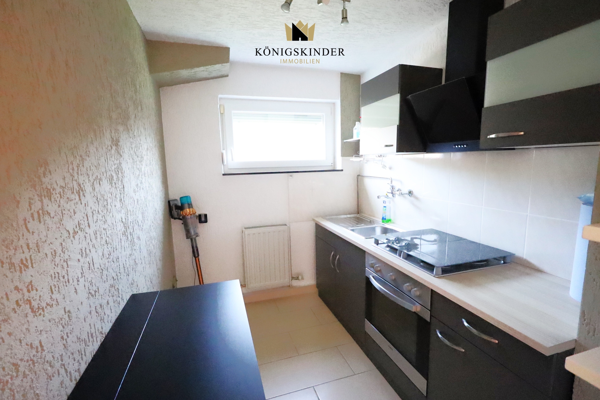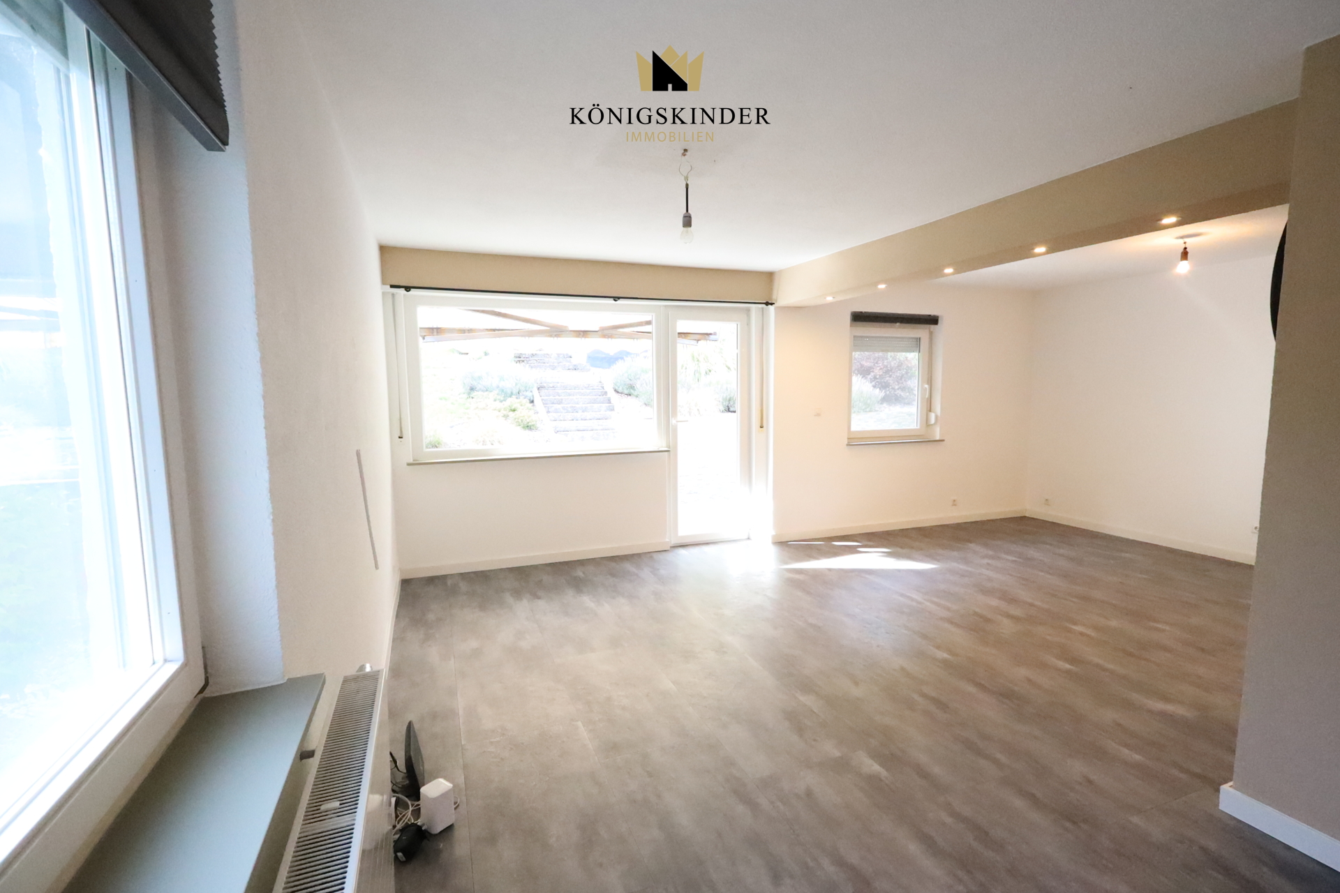 Das Haus ist geschickt in den Hang gebaut, sodass Sie die notwendigen Nutzräume im Hang haben und die Wohnräume hangabwärts im Gartengeschoß: 2 Zimmer, ein Duschbad eine kleine Küche (mit Einbauten) und ein Arbeitszimmer - für was immer Sie es nutzen möchten... Auf der Ebene befindet sich auch die Waschküche, Heizung und Abstellmöglichkeiten. Im Geschoss darüber, dem "eigentlichen" Erdgeschoss, ist Ihr zentraler Lebensbereich mit üppig großem Wohnbereich, Zugang zur offenen Küche (die im Bild zu sehenden Einbauten sind entfernt - Sie haben die Möglichkeit Ihrer eigenen Gestaltung) und zuj Essplatz. Dazu das elterliche Schlafzimmer, das Kinderzimmer und das Duschbad.