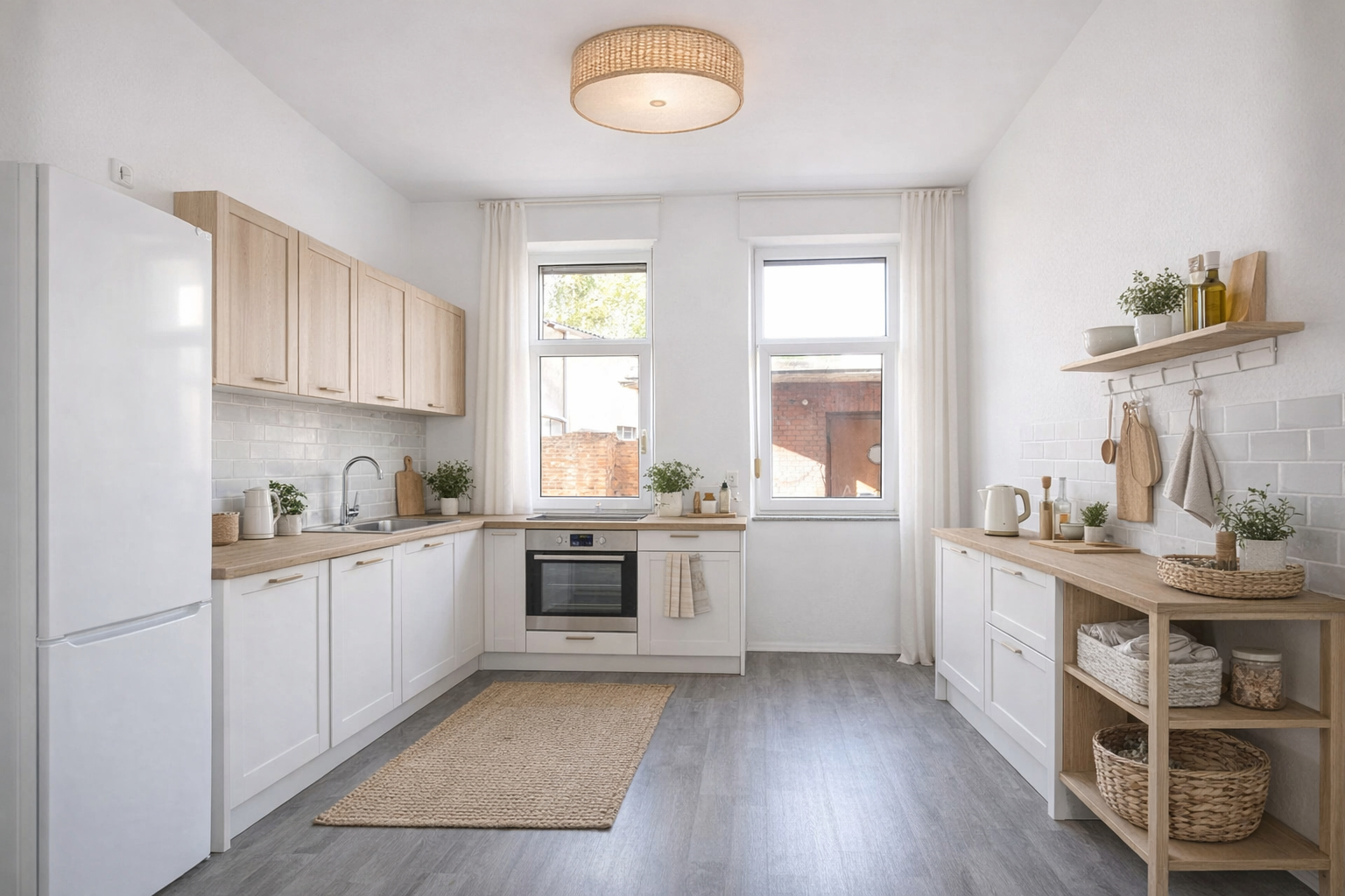 Die Küche bietet ausreichend Platz, um eine moderne Küchenzeile zu verbauen und zusätzlich einen kleinen Esstisch zu integrieren - ideal für gemütliche Mahlzeiten oder den morgendlichen Kaffee.