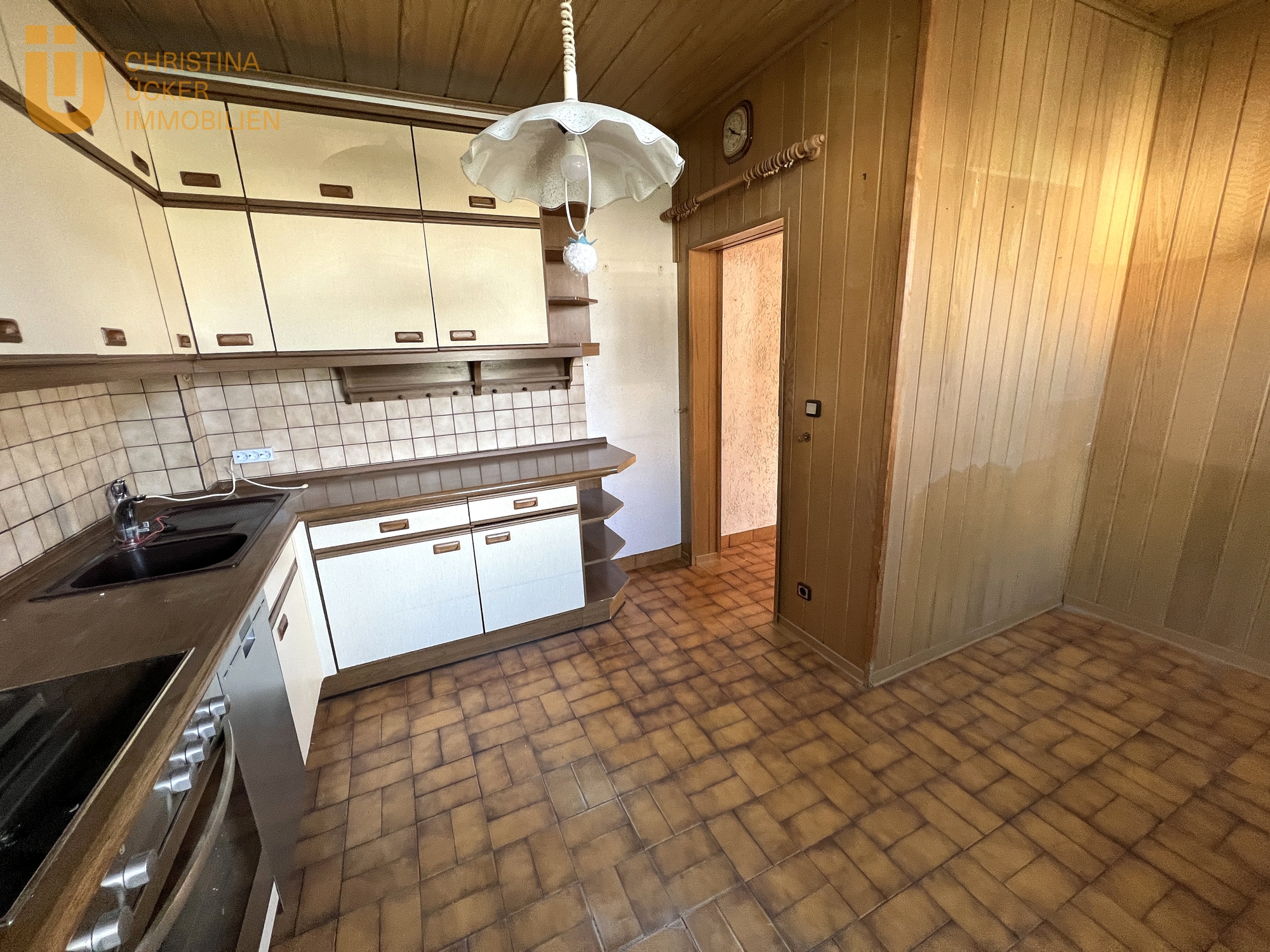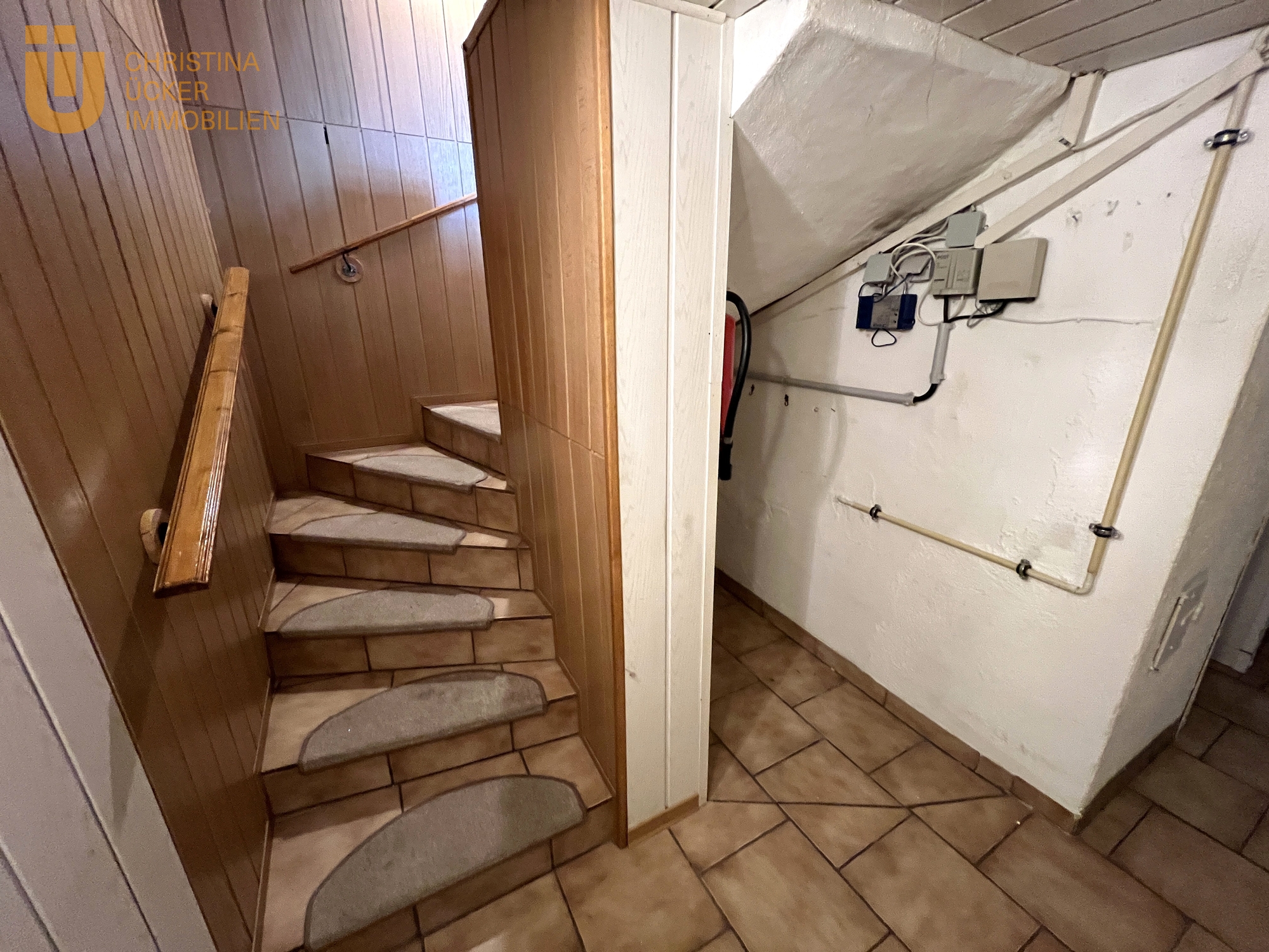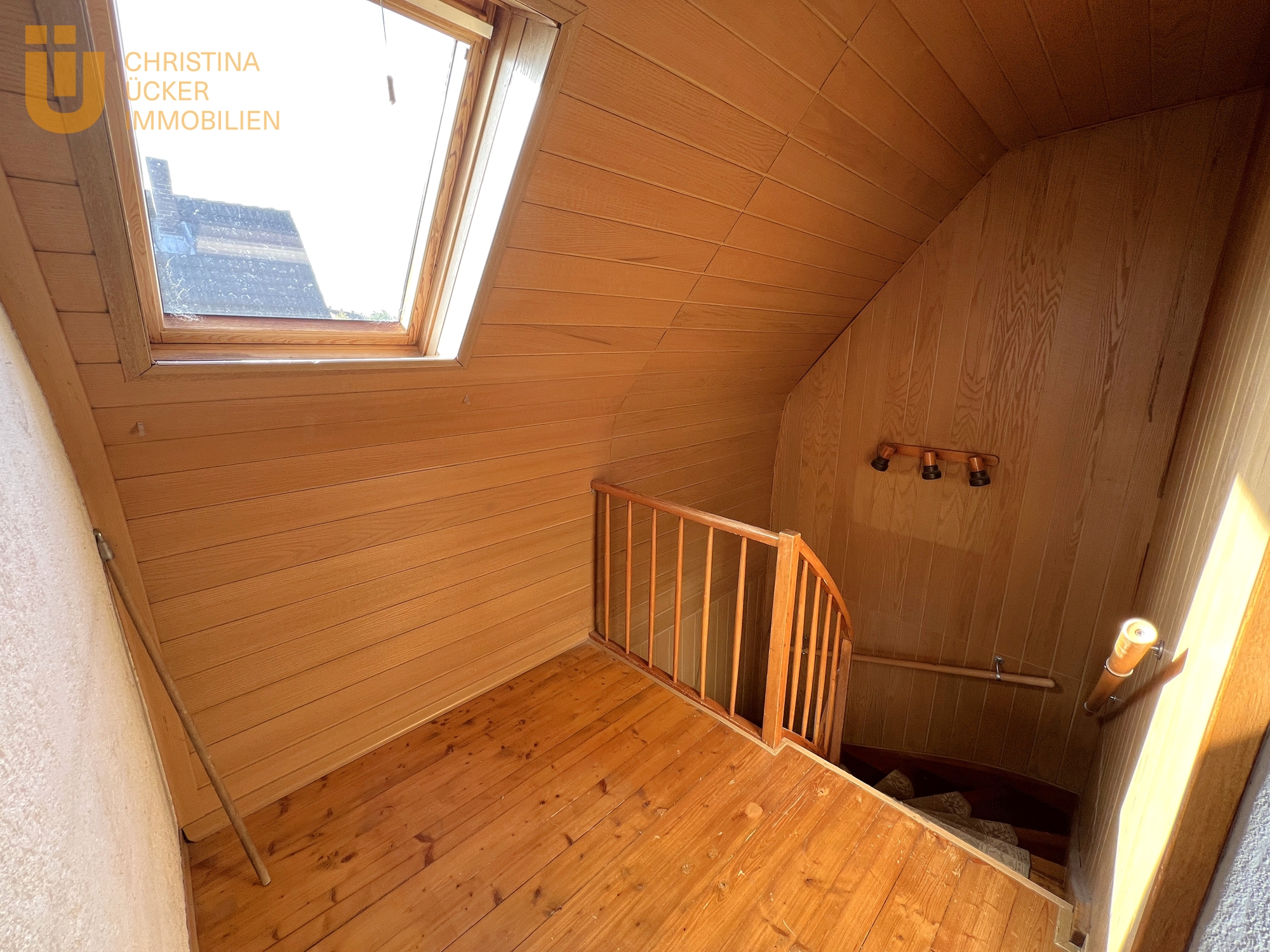 Über wenige Stufen und den für die Bauzeit typischen Windfang gelangt man zur Haustür. Im Erdgeschoss betritt man zunächst einen kleinen Flur, von dem aus alle Räume erreichbar sind. Direkt neben der Eingangstür befindet sich die Treppe ins Ober- bzw. Untergeschoss. Geradeaus gelangt man in die Küche. Daneben liegt das Wohnzimmer, das durch seine Helligkeit besticht und Platz für einen Essbereich bietet – alternativ lässt sich dieser oder ein separater kleinerer Essplatz, auch in der Küche integrieren. Vom Wohnzimmer aus hat man Zugang zur Terrasse und in den Garten.