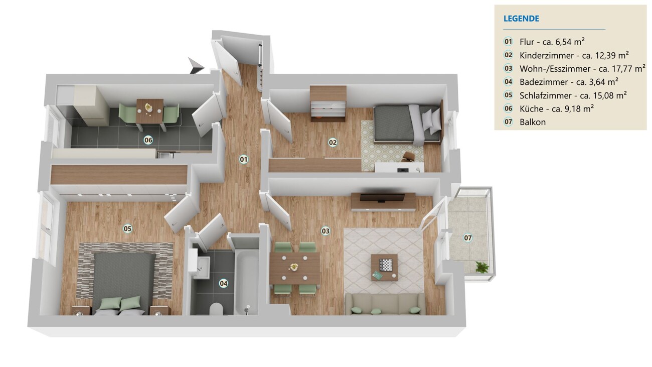Mit einer Wohnfläche von knapp 66 m² bietet sie eine klassische Raumaufteilung mit drei gut geschnittenen Zimmern sowie einen Balkon, der zusätzlichen Wohnkomfort schafft.