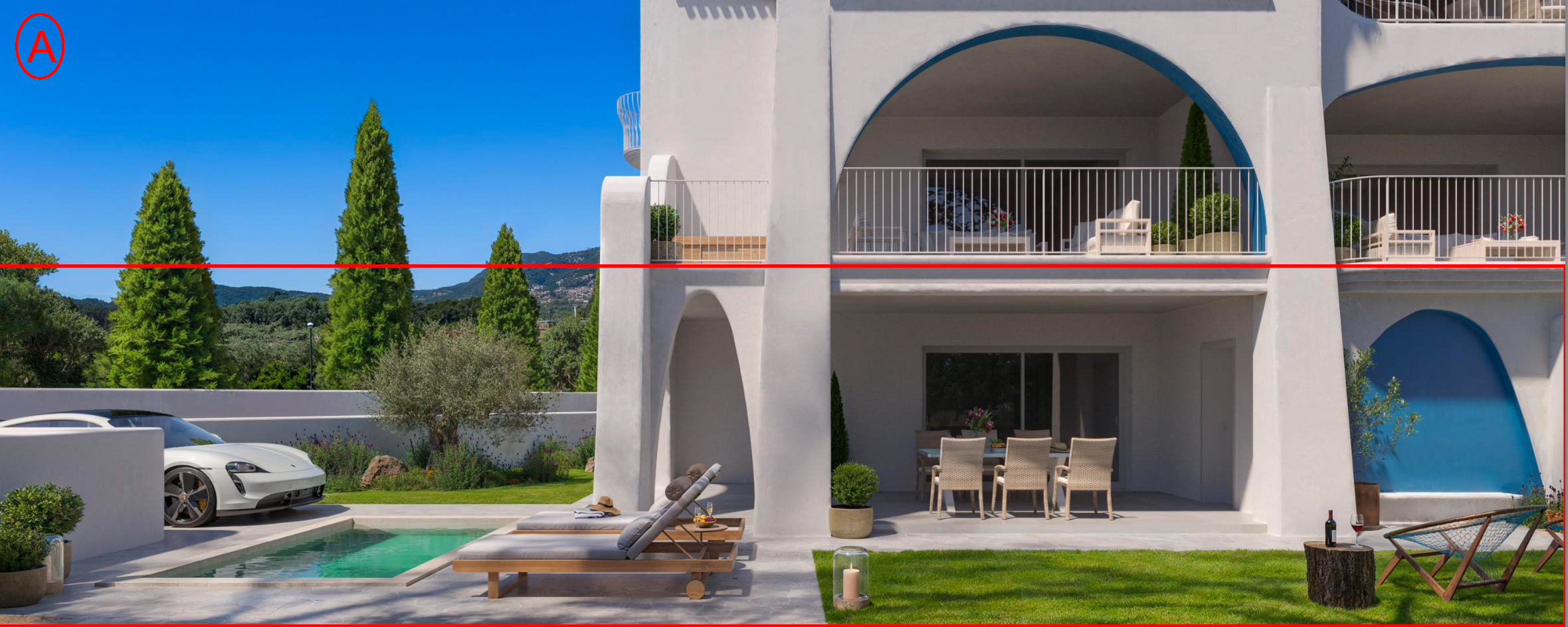 Die Wohnung ist von einem privaten Garten umgeben, der auf zwei Seiten angelegt ist. Ein großes Tor öffnet sich zum Parkplatz direkt vor der Wohnung. Beim Betreten durch die Eingangstür gelangt man in das geräumige Wohnzimmer. Dieser Raum ist dank der einheitlichen Fliesen und einer mehr als 3 Meter hohen Schiebetür besonders großzügig und hell. Die nahtlose Verbindung zur vorgelagerten, fast 30 Quadratmeter großen überdachten Terrasse bietet ganzjährig einen komfortablen Ort zum Speisen, Entspannen oder auch zum Arbeiten im Freien bei mildem Klima. Die hohe Decke von 2,70 Metern verleiht der Wohnung eine zusätzliche Großzügigkeit und einen besonderen Charme.