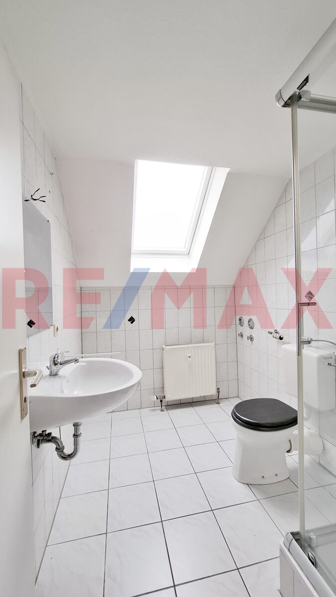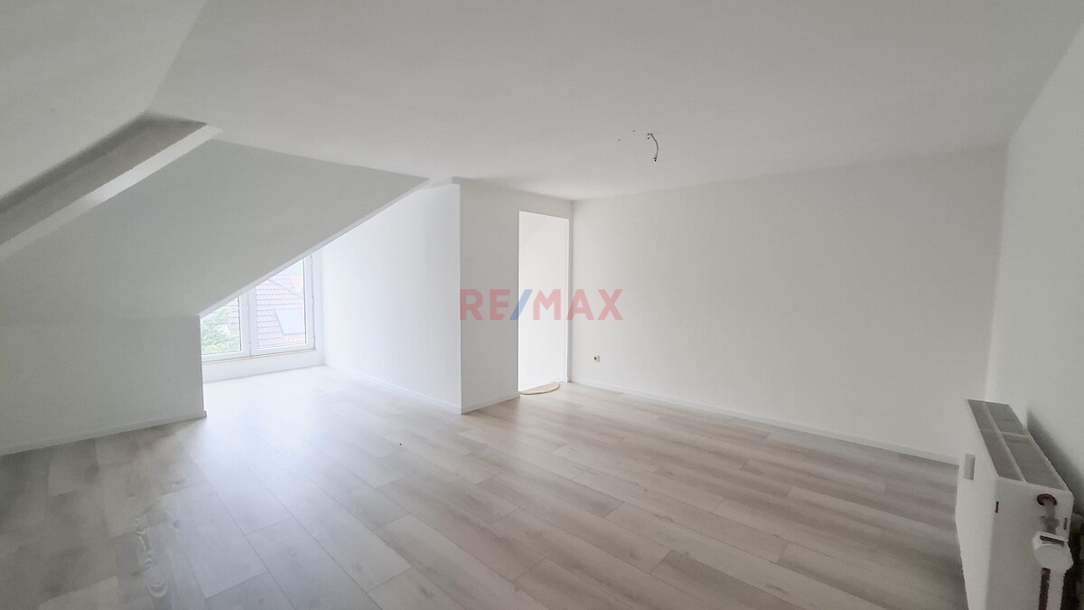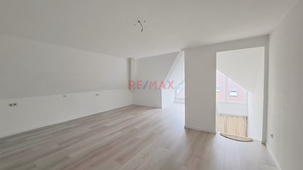 Über eine Treppe gelangen Sie ins Dachgeschoss, welches durch den raffinierten Schnitt viel Platz bietet als Schlafzimmer, mit möglichem Bürobereich.