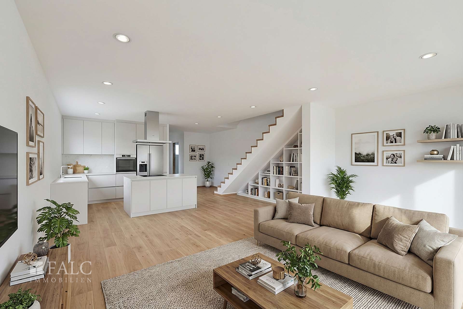 Die Küche ist als offener Bereich (zum Beispiel inklusive Kochinsel) in den Wohnbereich integriert - so wie sich modernes Wohnen versteht.
