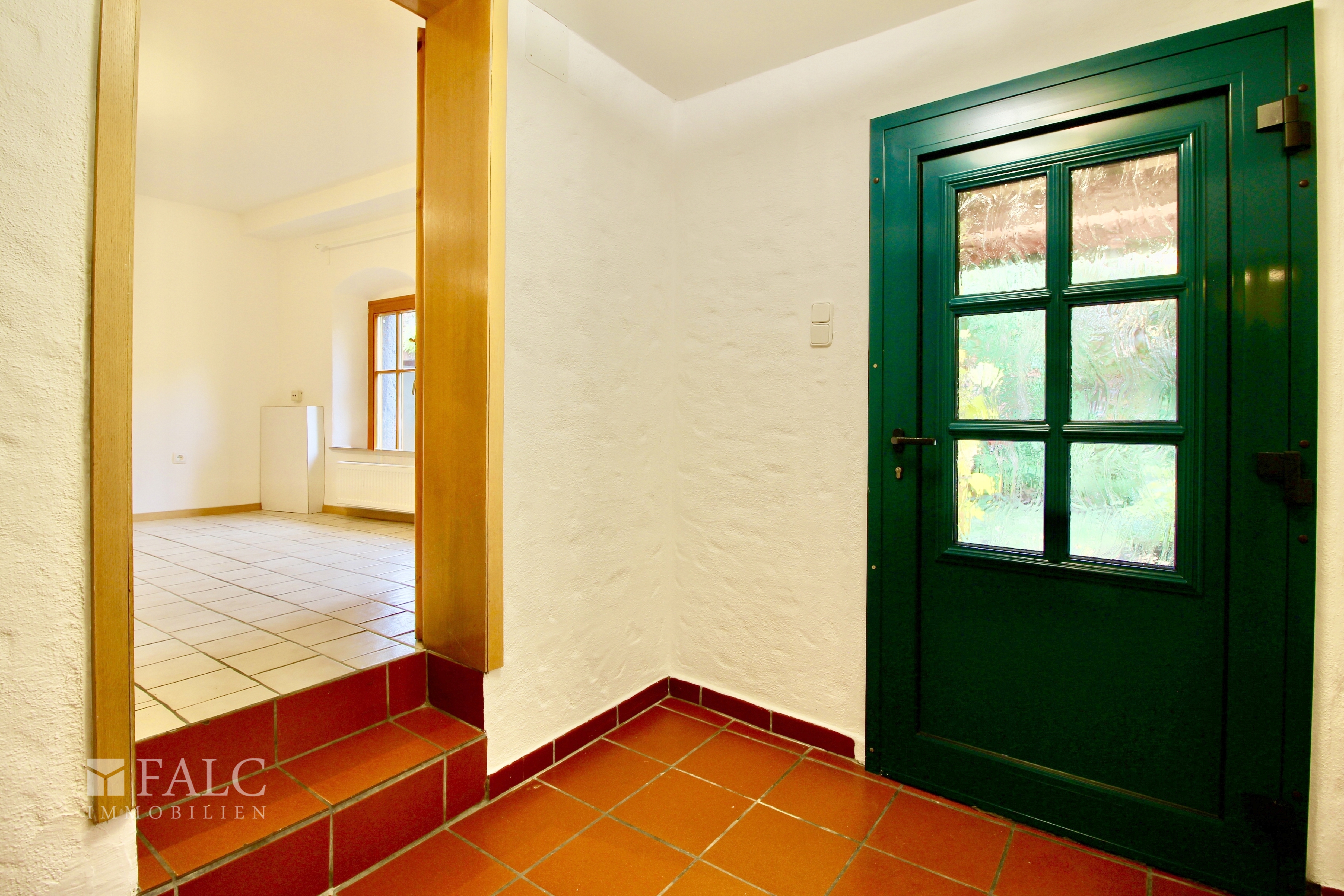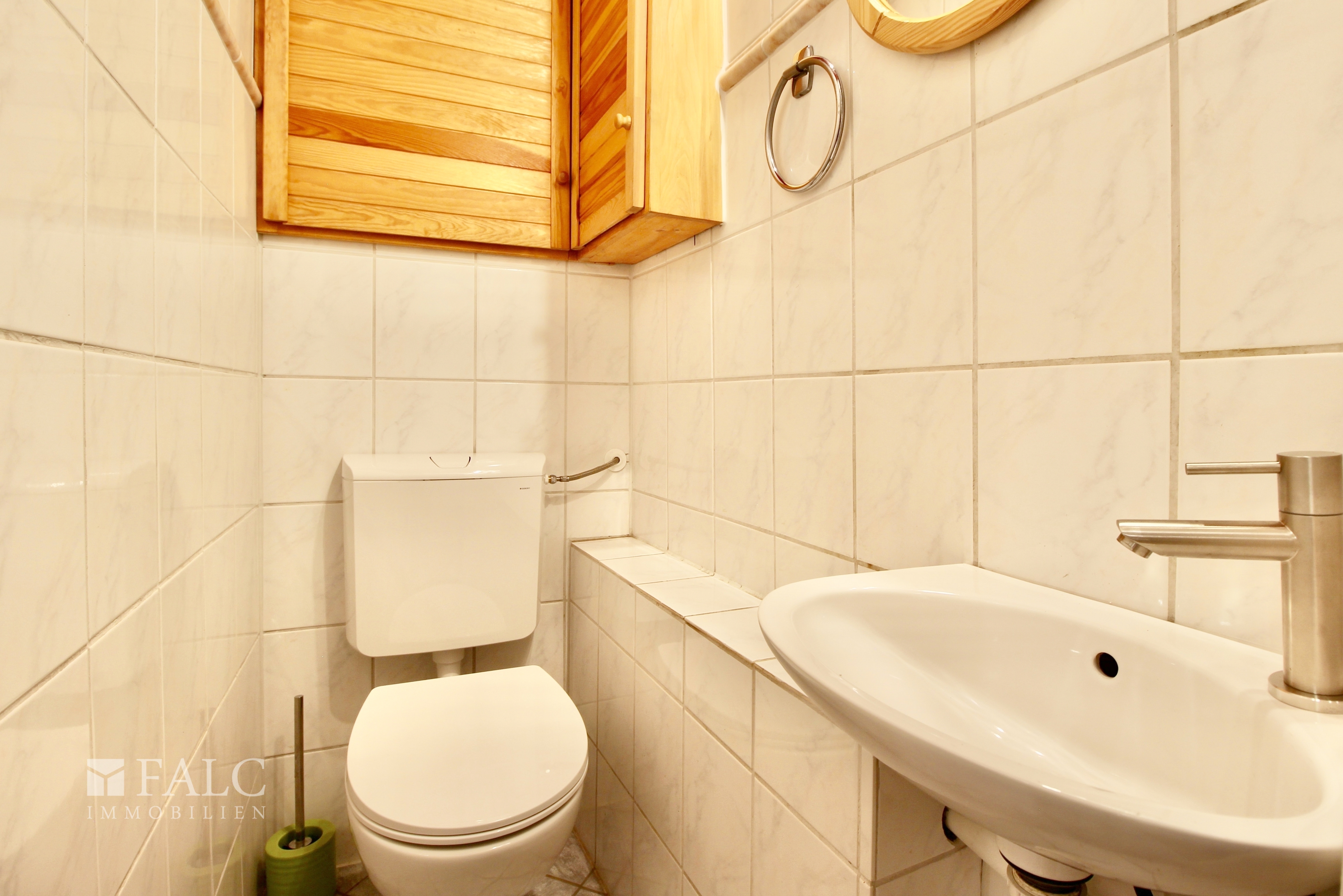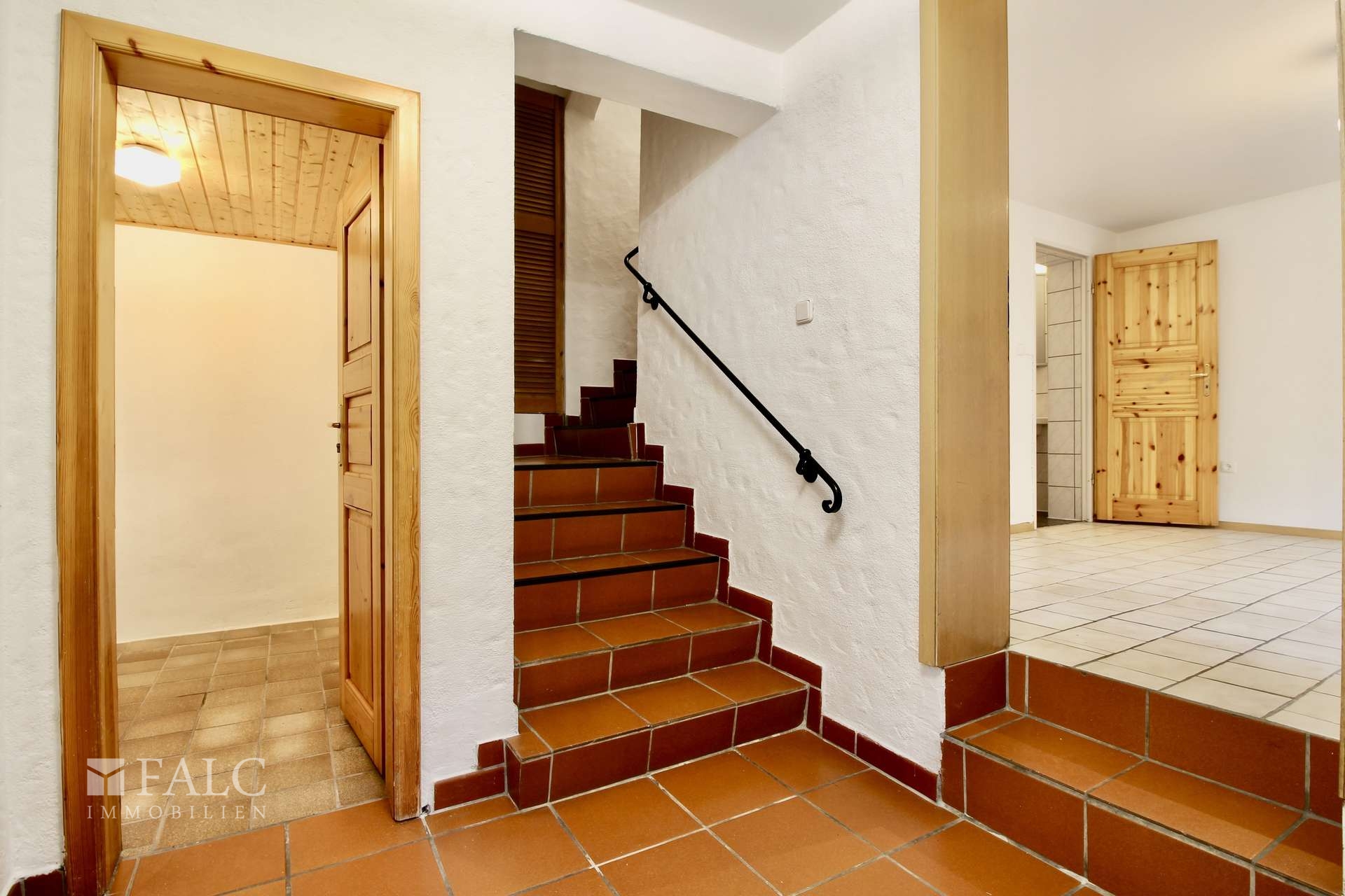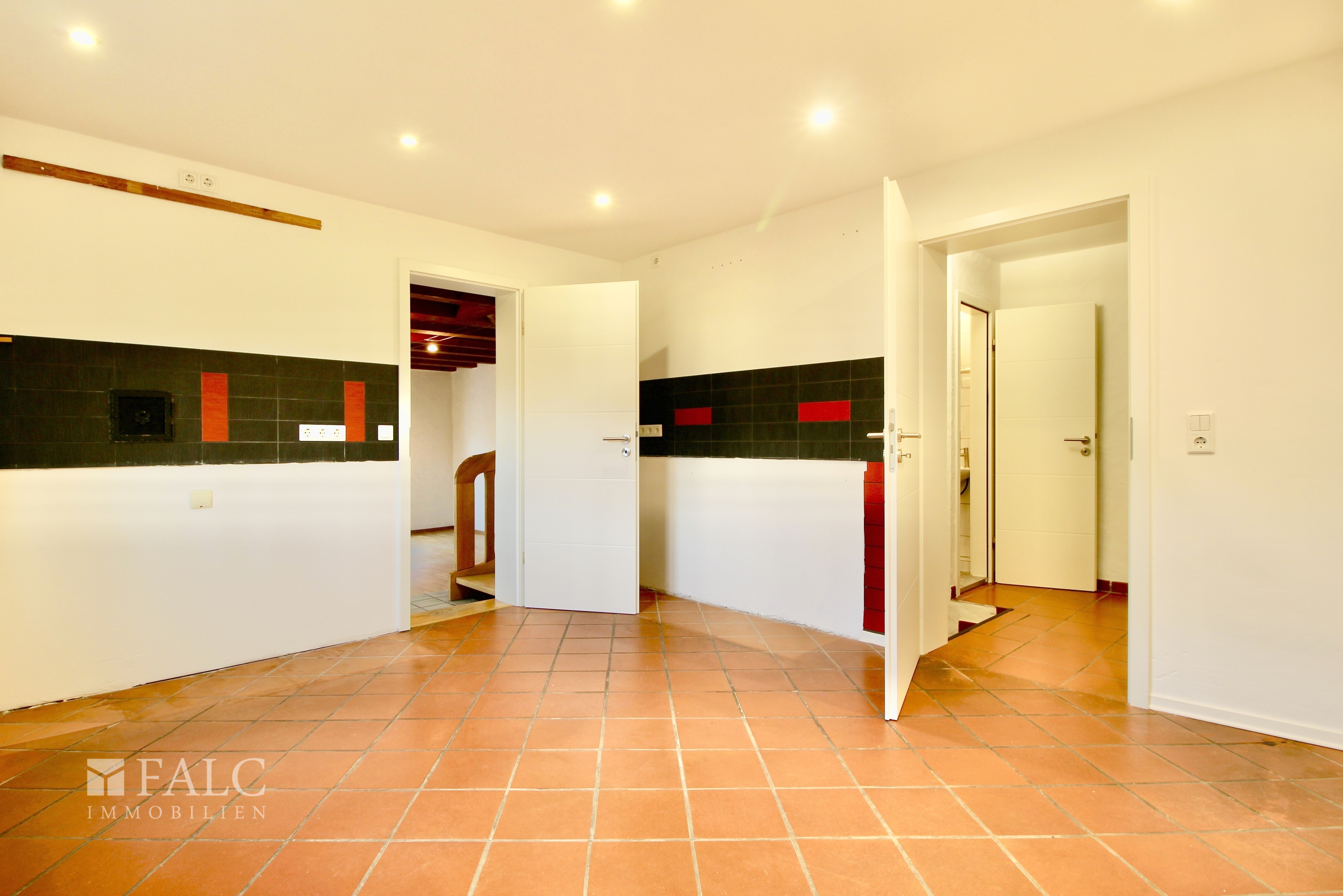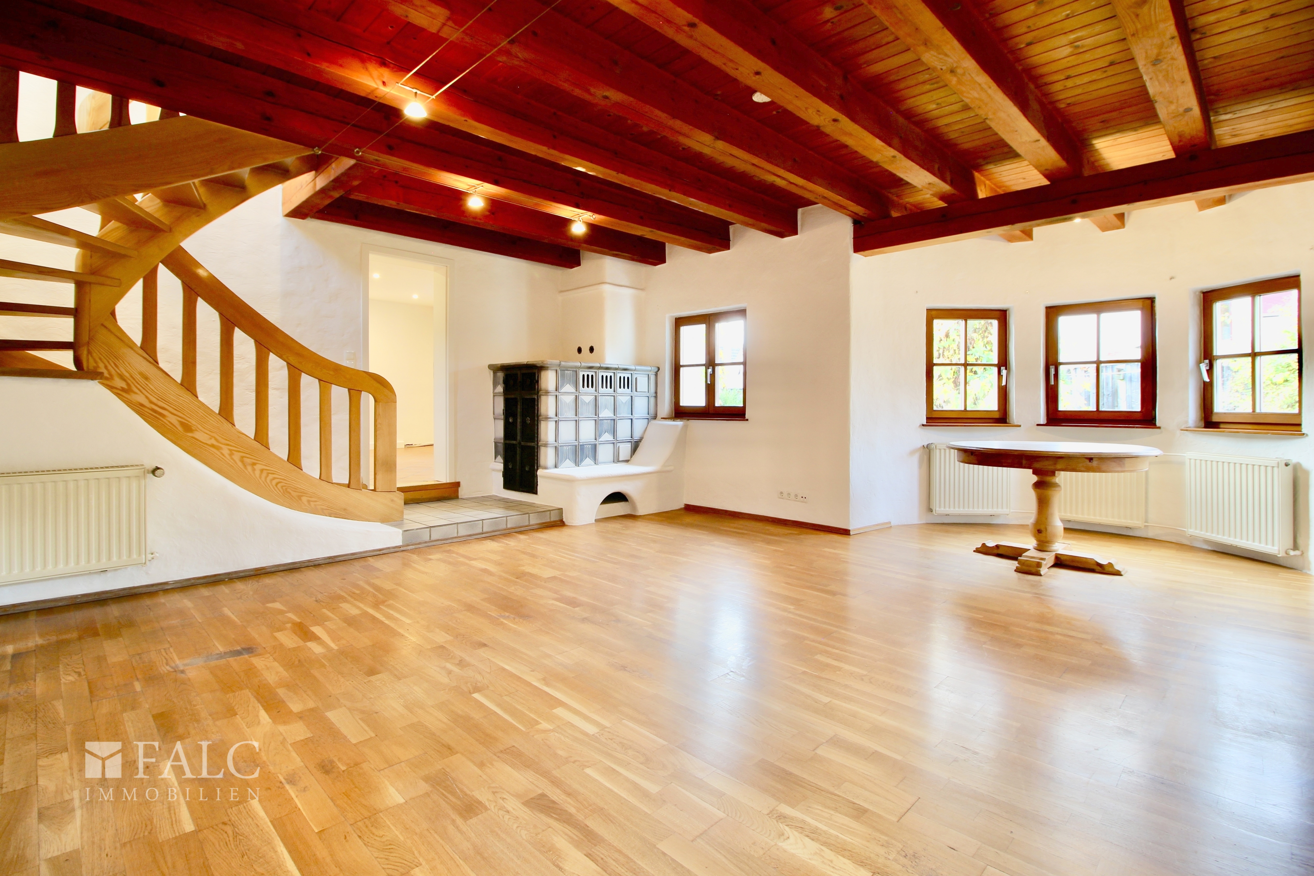 Der Flur führt Sie direkt zu einer stilvollen Holztreppe, die Sie in das Obergeschoss bringt, wo sich das großzügige Wohnzimmer befindet. Dieses beeindruckt mit seinen freiliegenden Holzbalken, einem Kachelofen und dem warmen Holzfußboden, die eine gemütliche Atmosphäre schaffen. Im Obergeschoss finden Sie auch die geräumige Küche, die ausreichend Platz für einen Essbereich bietet. Ein Gäste-WC befindet sich ebenfalls auf dieser Etage und rundet alles ab.