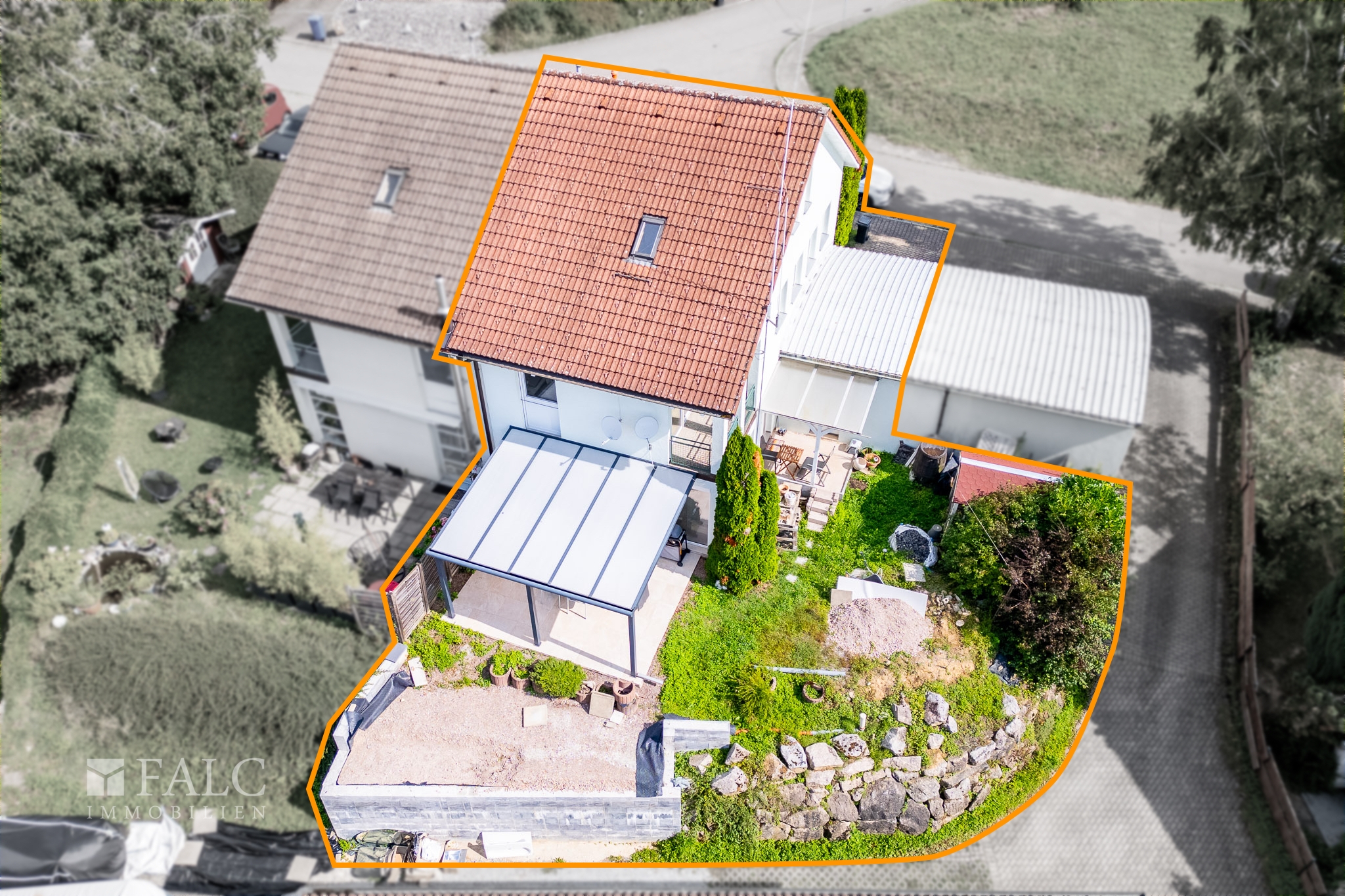 Die überdachte Terrasse bietet viel Schatten und Platz für Gäste und den Grill.