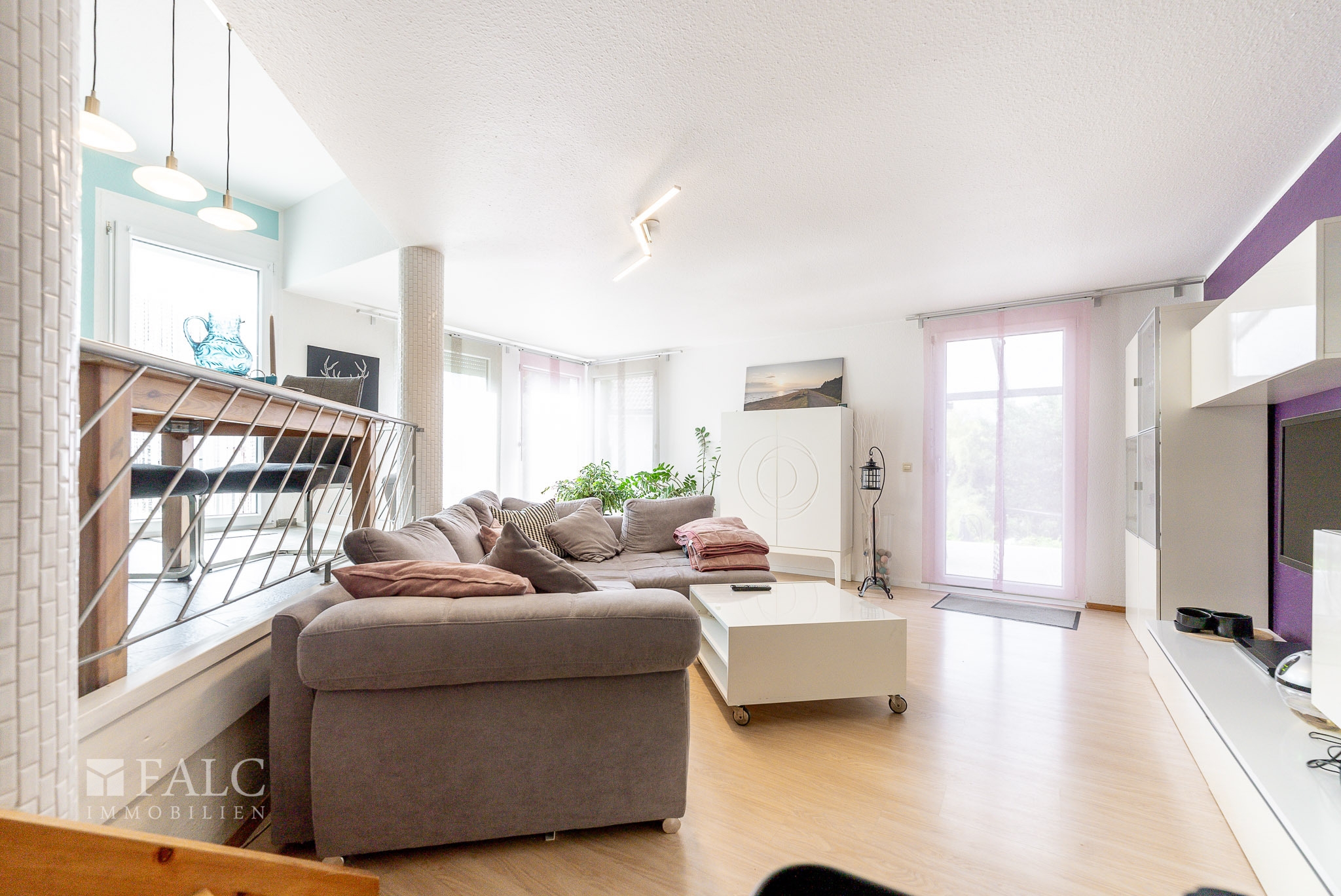 Im Wohnbereich, der vom Essbereich durch ein paar Stufen getrennt ist, entspannen Sie nach getaner Arbeit.
