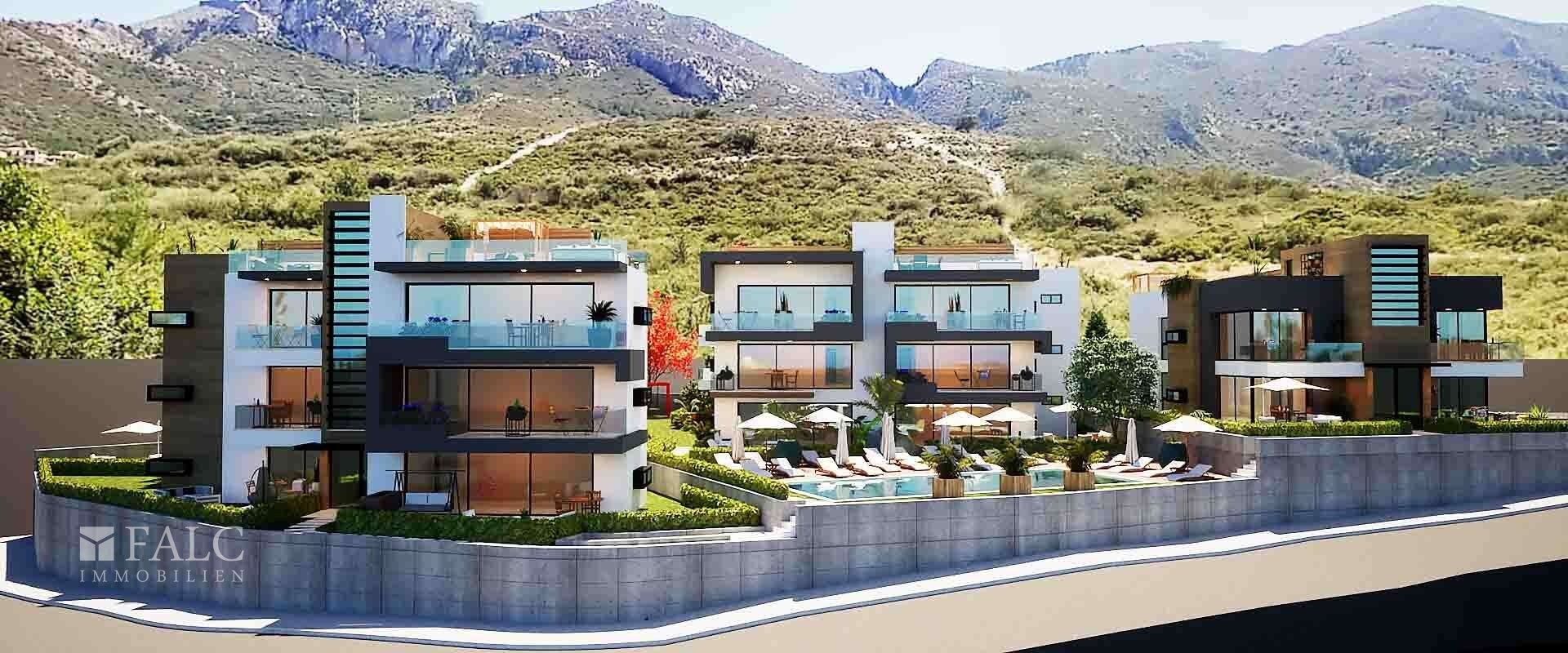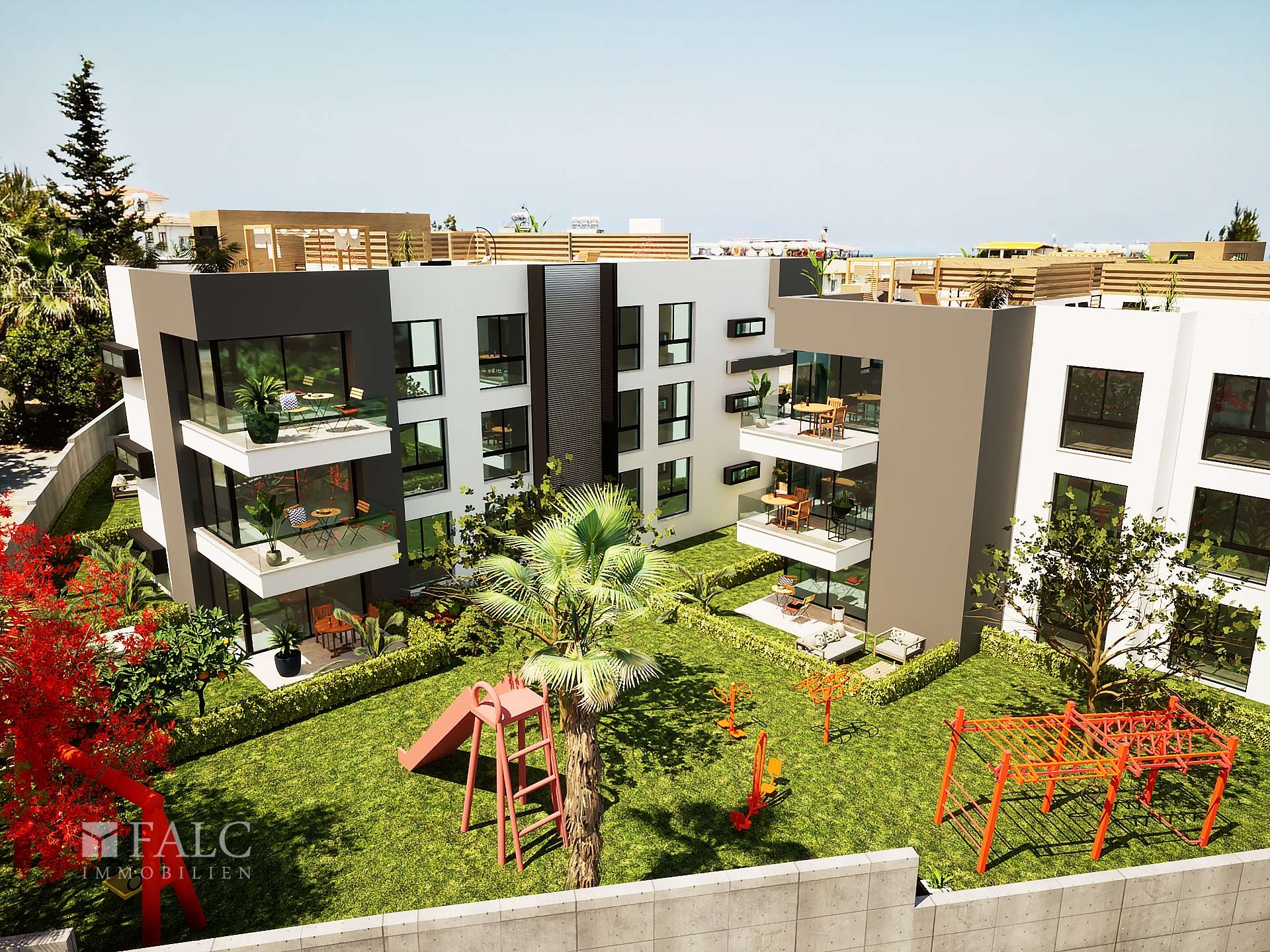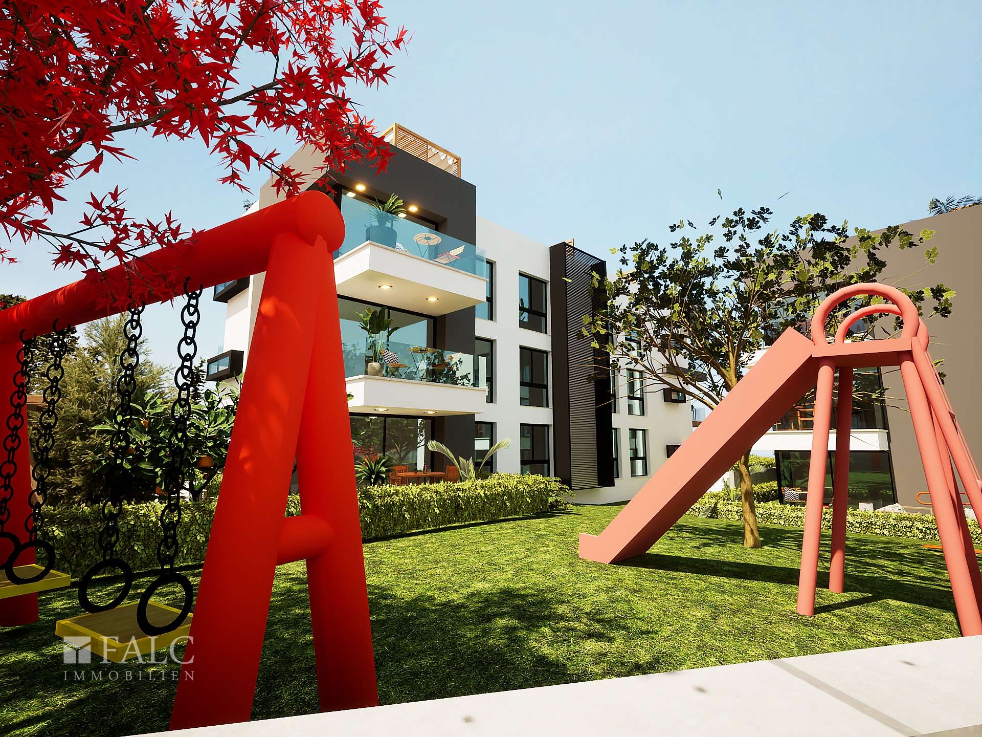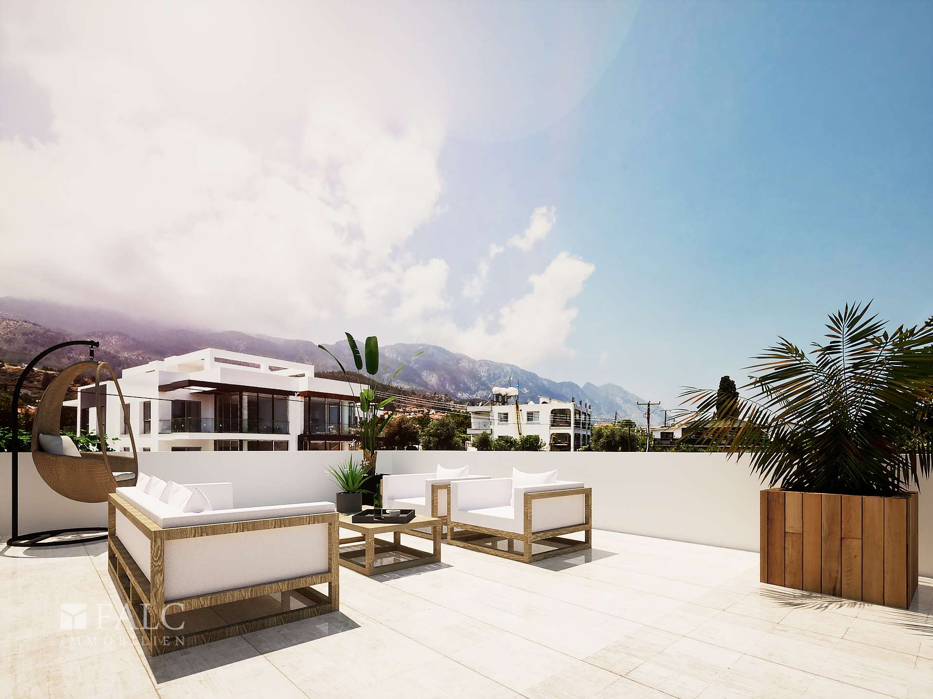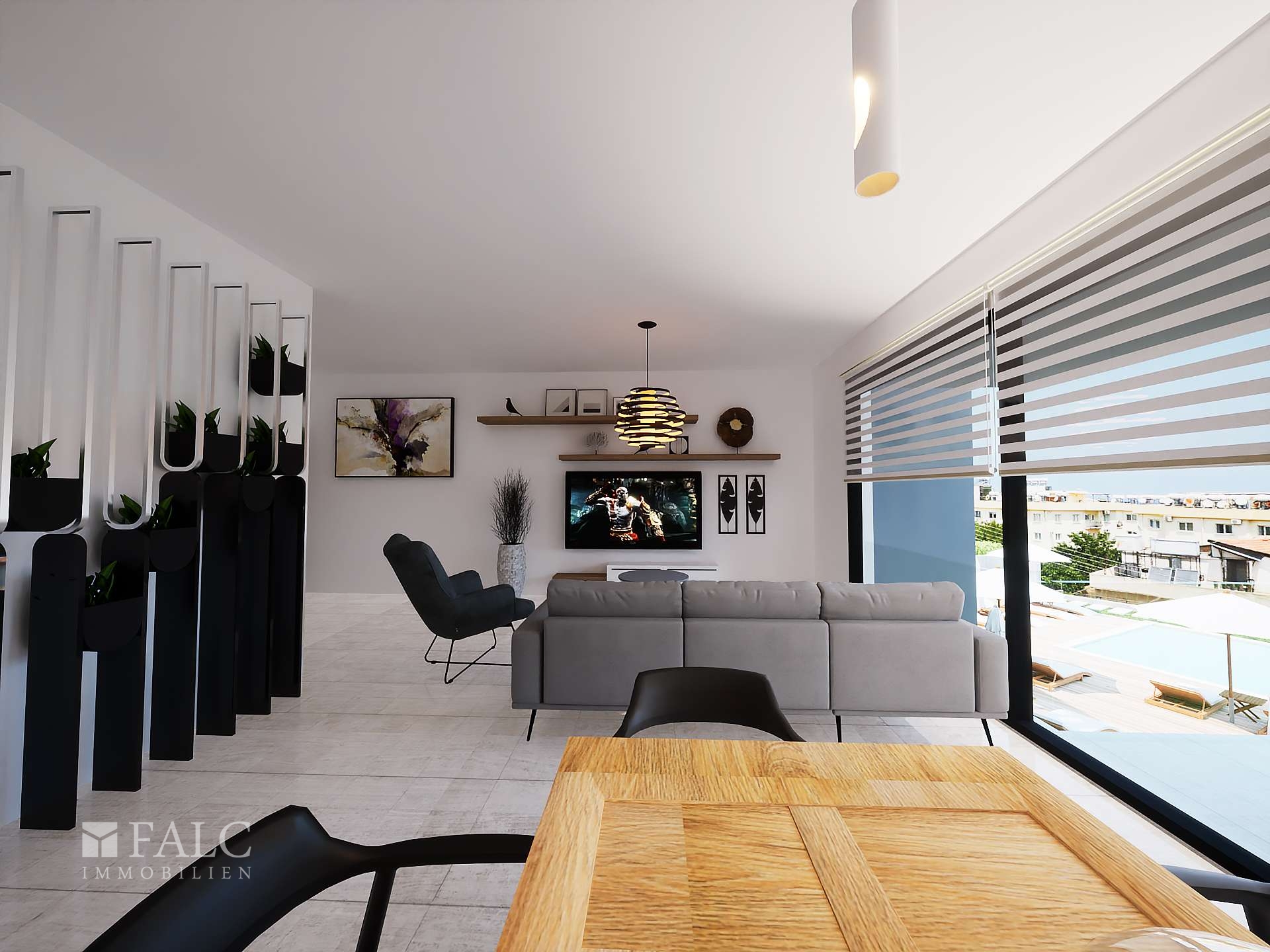 Zum Verkauf steht eine luxuriöse Etagenwohnung in Alsancak, Kyrenia. Die Wohnung befindet sich in einem neu erbauten Gebäude aus massivem Material und wird im Jahr 2024 fertiggestellt. Der Erstbezug garantiert einen makellosen Zustand.