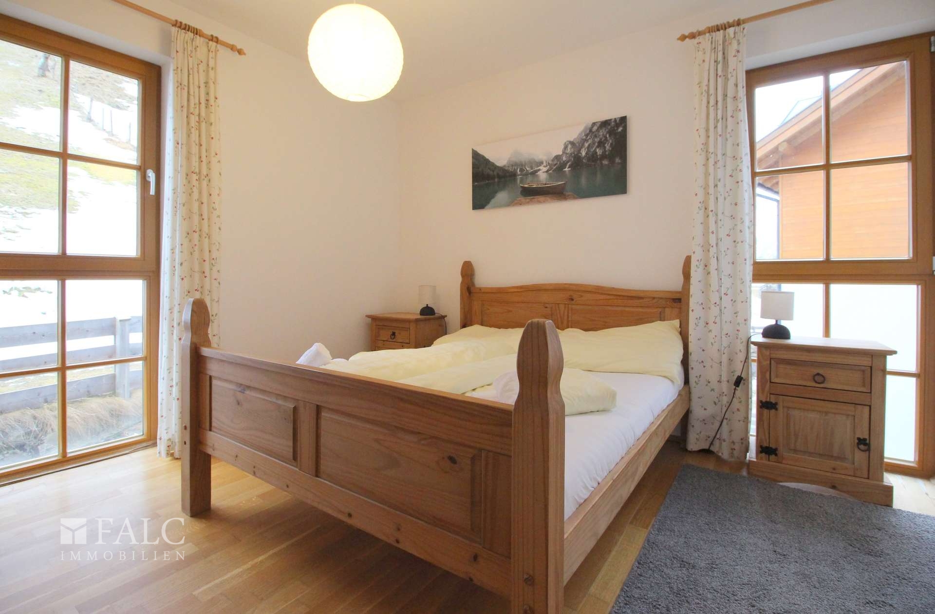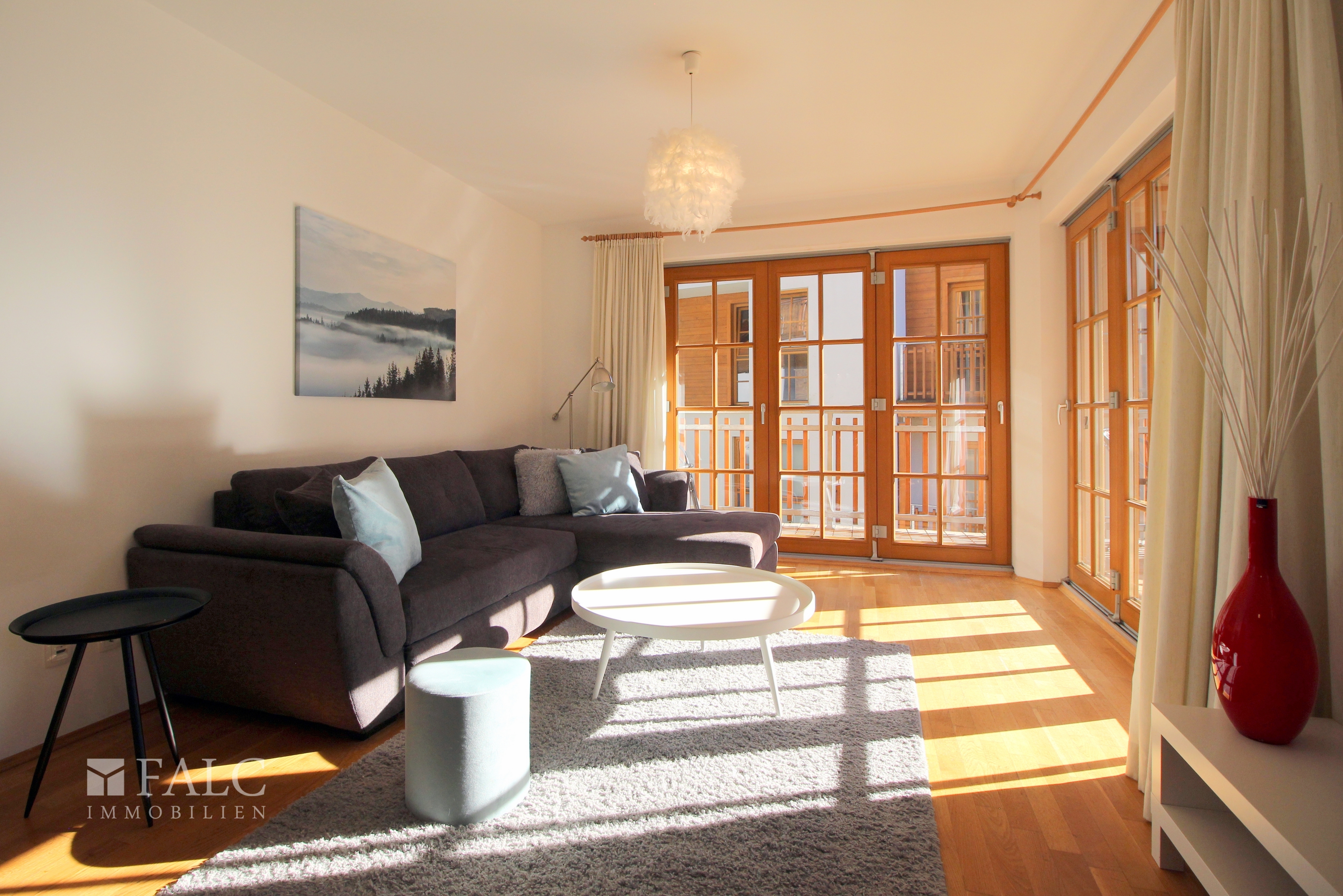Aufgeteilt ist die Wohnung in eine offene Küche im Wohn- und Essbereich mit Ausgang auf den nach Südwesten ausgerichteten Balkon mit Blick in die Berge und auf den Skihang. Drei Schlafzimmer, zwei Badezimmer, davon eines mit Duschwanne sowie zwei Waschbecken und das andere mit Dusche ergänzt durch ein separates WC runden das durchdachte Raumkonzept ab.