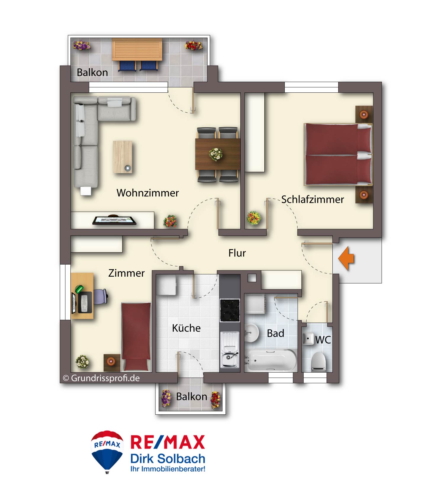 Die sehr gepflegte Wohnung ist im 2. OG eines ruhigen 6-Familienhauses und verfügt über ein großes Wohn-/Esszimmer mit großem Südbalkon, 2 Schlafzimmer, eine Küche mit Essbereich und Nordbalkon, Flur, ein Bad mit Duschwanne, ein separates WC, ein großes Speicherabteil und einen großen Kellerraum.