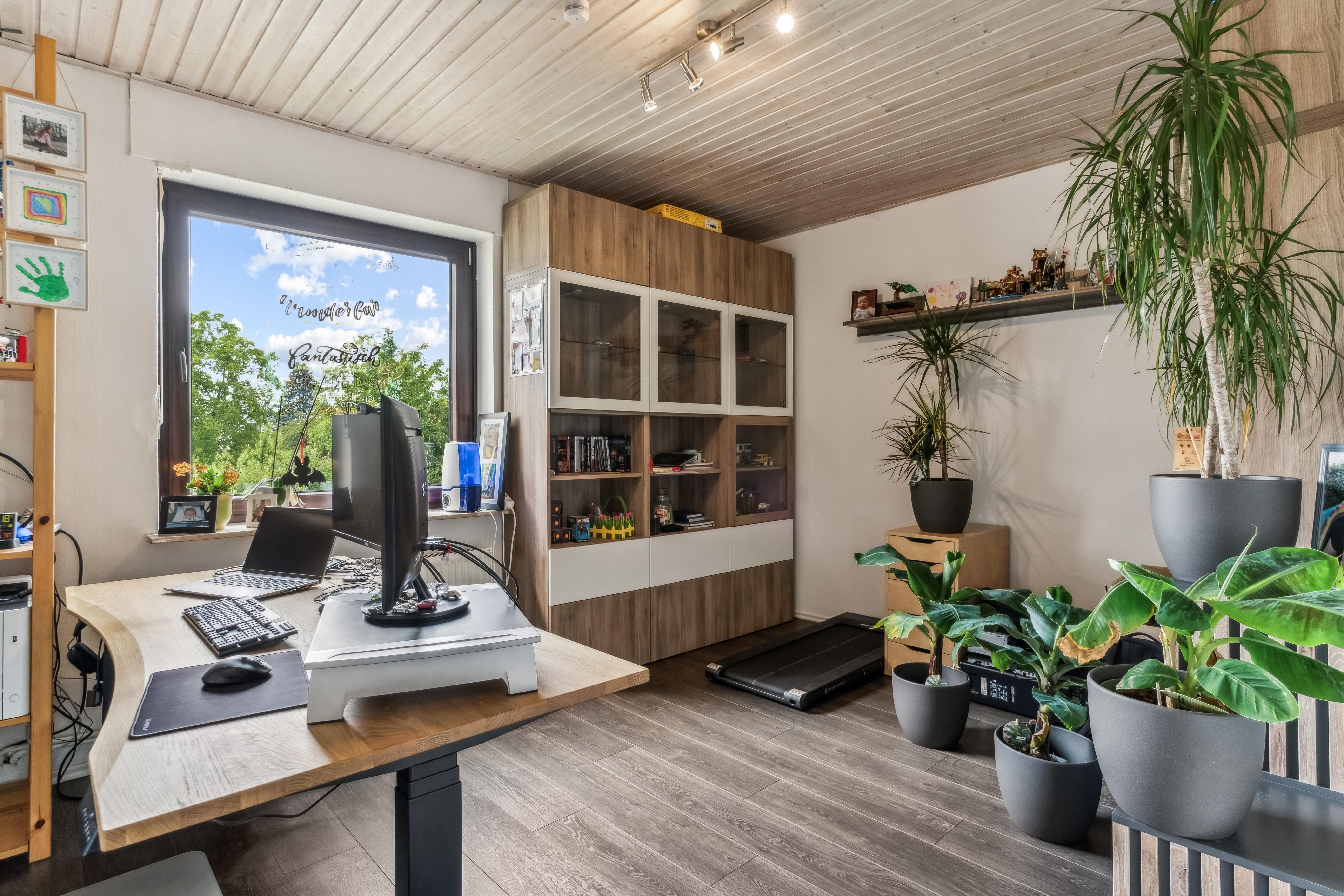 Im 1.OG (ca. 75 m²) sind der Wohn-/Essbereich, Arbeitszimmer, Küche, Bad und der umbaute Balkon. Im Dachgeschoss (ca. 50 m²) sind 2 Schlafzimmer und ein Badezimmer (mit Badewanne). Eines der Schlafzimmer ist mit einer Klimaanlage ausgestattet und verfügt zusätzlich über eine begehbare Ankleide.