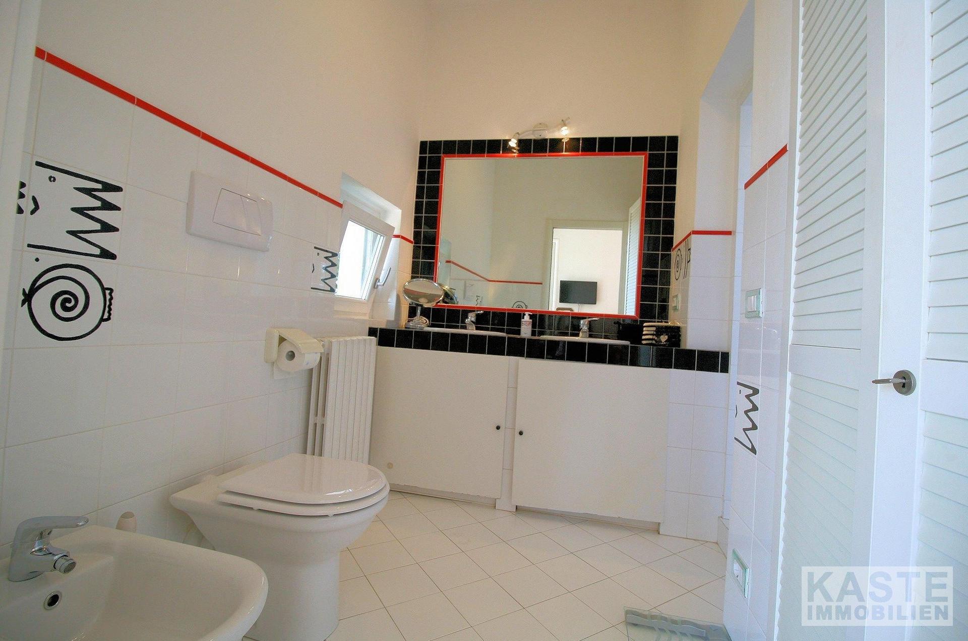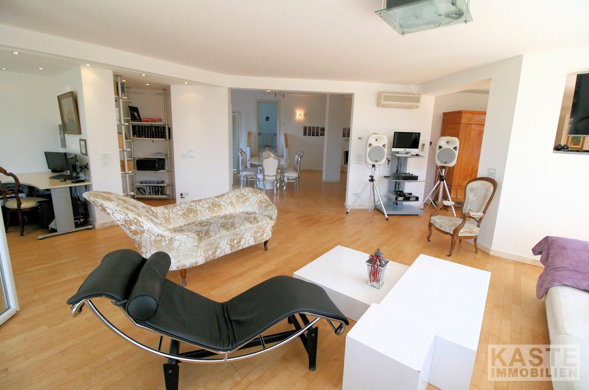 Vom Haupteingang gelangen Sie in das Wohnzimmer, das eine Bar enthält. Außerdem gibt es dort ein Esszimmer und ein weiteres Wohnzimmer mit Gästebad, mit ca. 75 qm. Der Raum ist ausgestattet mit großen Fenstern und einem elektrischen Sonnenschutz. Über 3 Sprossen gelangen Sie in die Küche, mit einem großzügigen Arbeitsbereich. Neben der Küche befindet sich die Waschküche und ein weiterer Raum als Hauswirtschaftsraum. Dieser Teil der Villa hat auch einen eigenen Zugang. Vom Hauptzugang aus gelangen Sie über eine Travertin-Treppe in den ersten Stock, in dem sich eine Bibliothek, das Hauptschlafzimmer mit schöner Aussicht, begehbarem Kleiderschrank und ein exklusives Bad mit Dusche befindet. Außerdem gibt es dort 2 weitere Schlafzimmer, beide mit exklusiven Bädern ausgestattet und ein Hauswirtschaftsraum. Diese Ebene hat Holzböden.