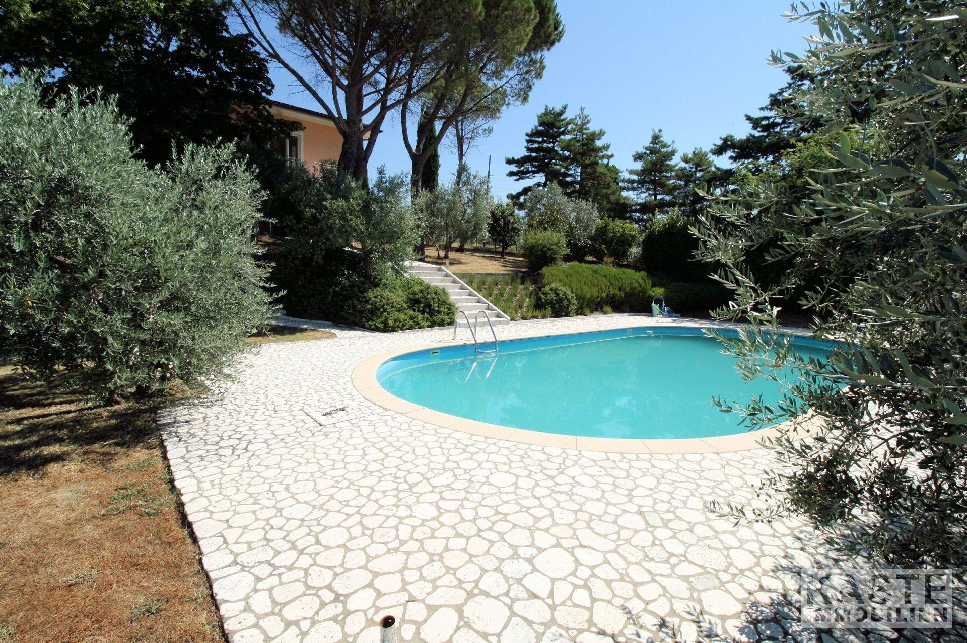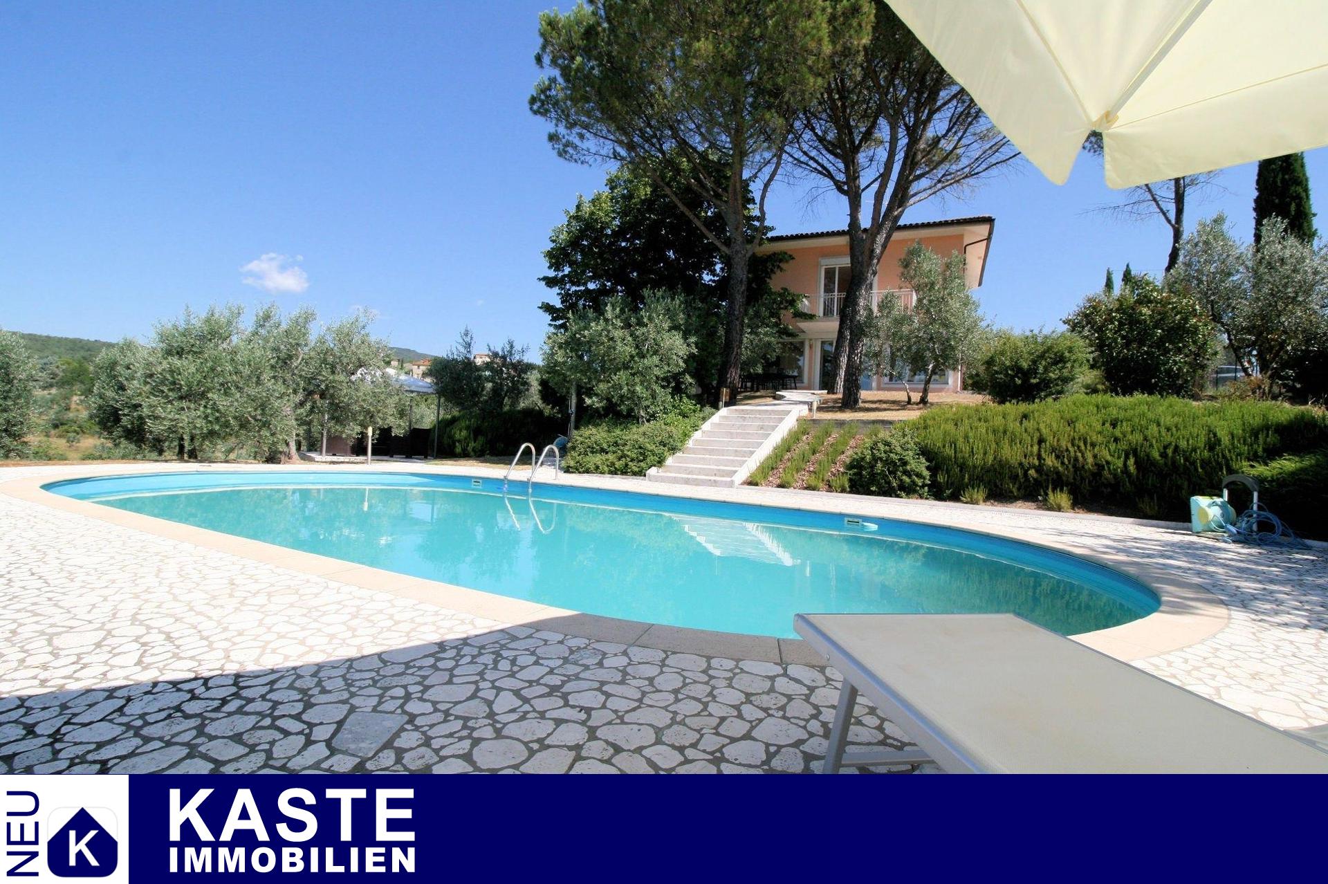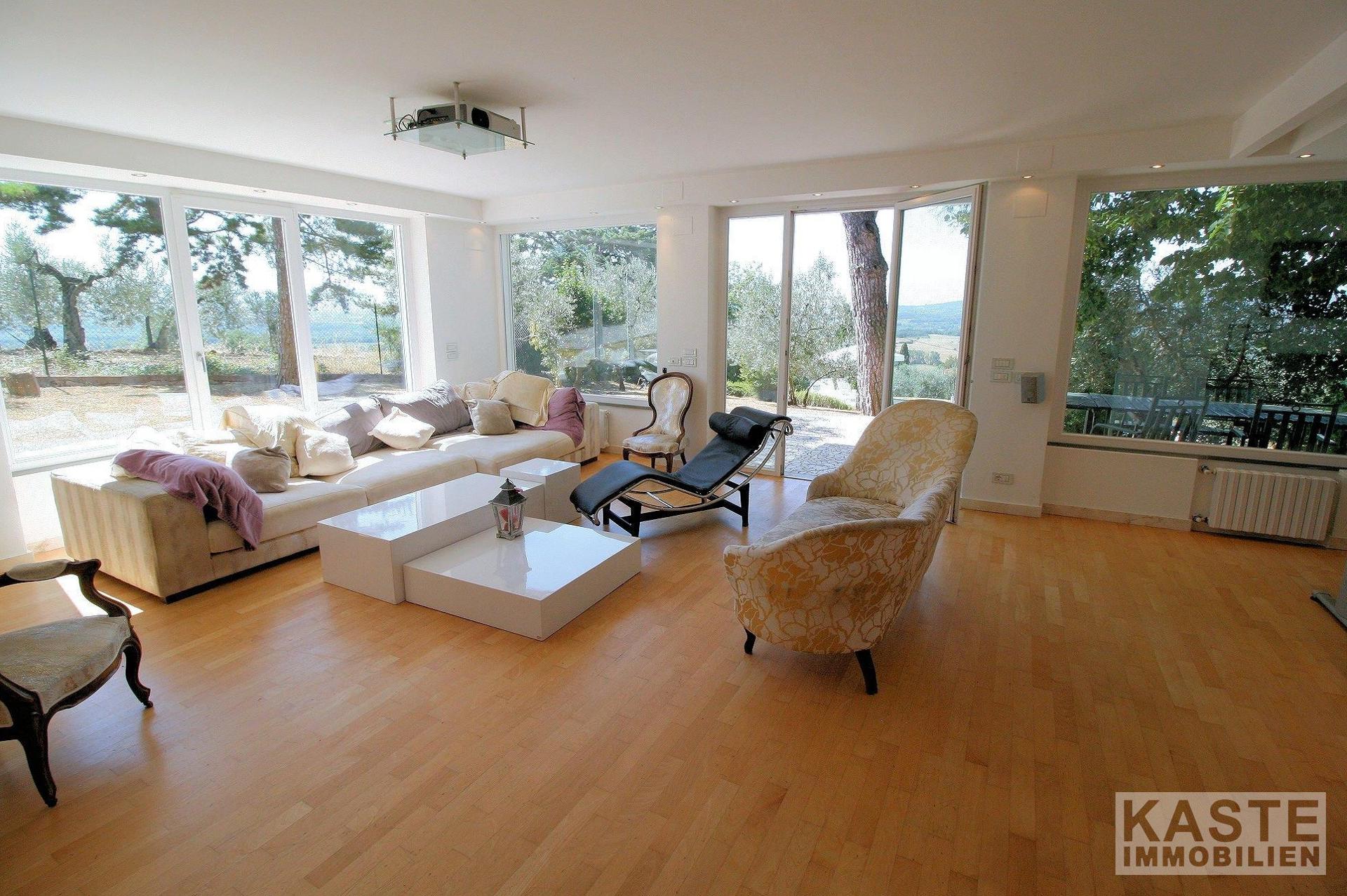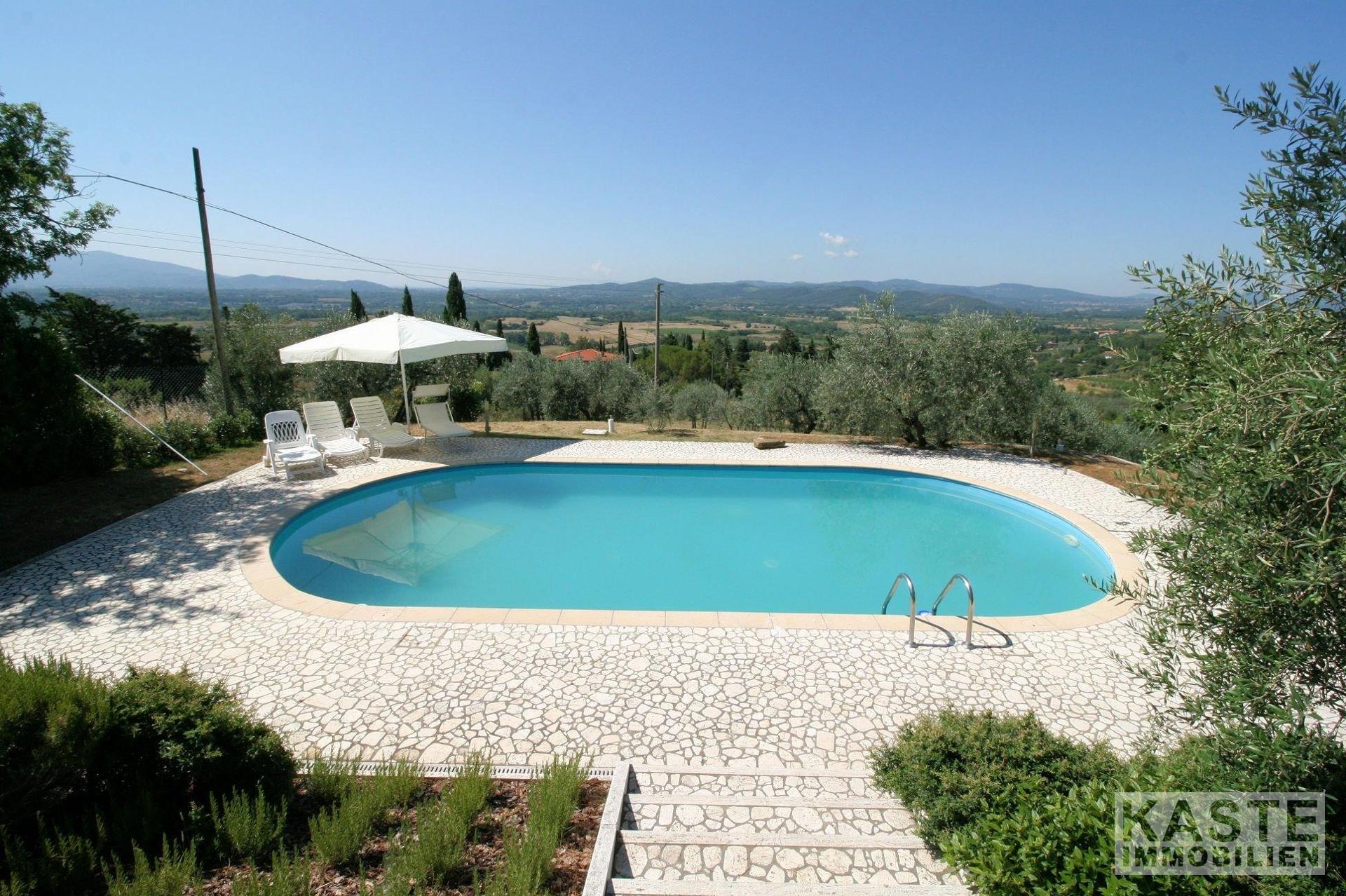 Die Villa liegt auf 300 ü.d.M. am Hang des Naturparks Pratomagno. Sie ist umgeben von 3300 qm Garten, der komplett eingezäunt ist. Sie können sogar auf Pfaden direkt vom Grundstück aus im Wald spazieren gehen. Sowohl vom Haus als auch vom Garten und dem Pool aus haben Sie einen unglaublichen Blick auf Arezzo, das ValdiChiana, den Monte Amiata, den Monte Cetone und das Valdarno. Sie können das Grundstück mit dem Bus direkt von Arezzo aus erreichen. Die örtliche Regierung hat die Erlaubnis erteilt, 200 qm mehr zu bauen, sowohl neben dem Haus als auch in der Nähe davon. Das gesamte Grundstück ist in perfektem Zustand.