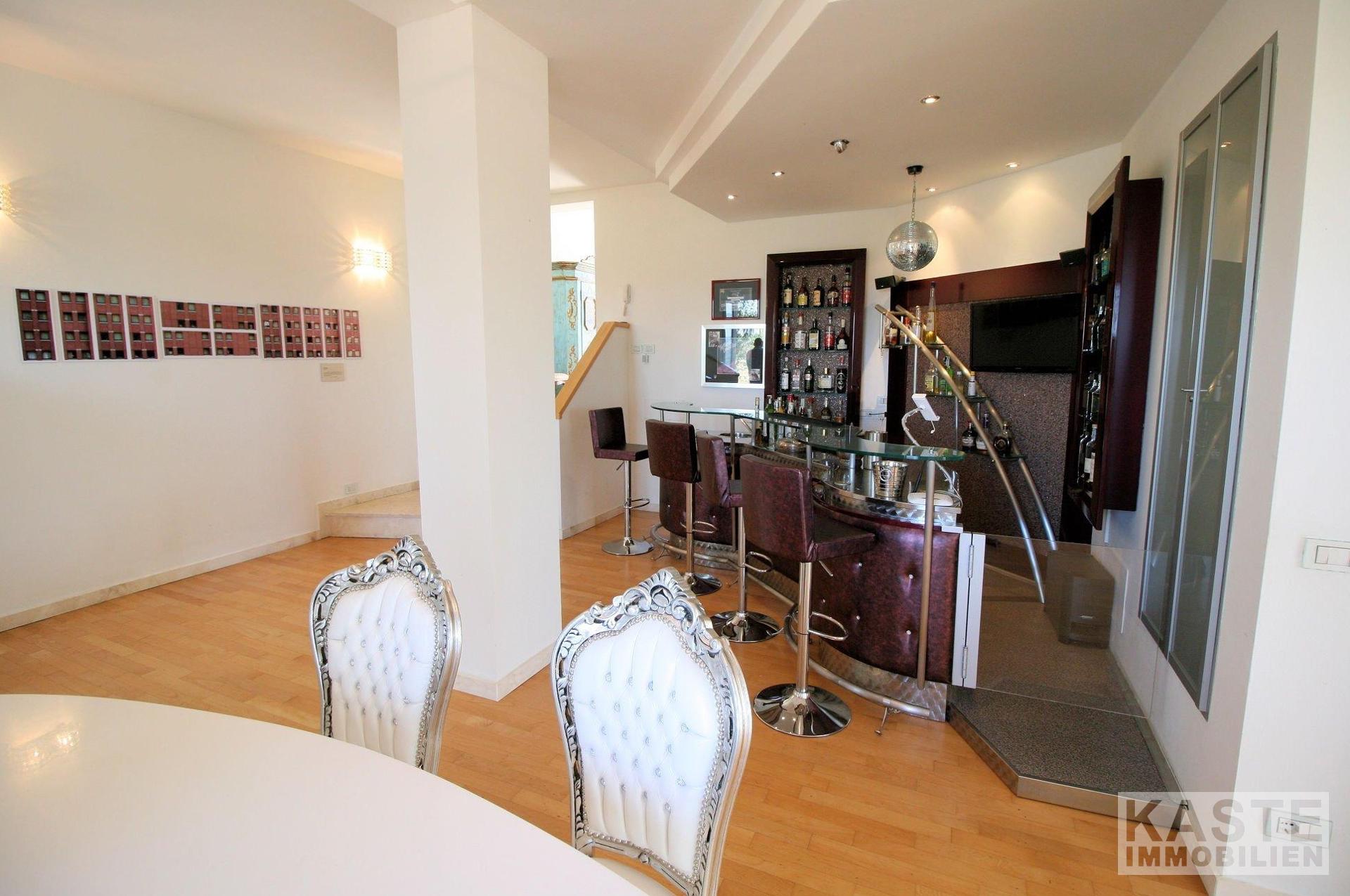Vom Haupteingang gelangen Sie in das Wohnzimmer, das eine Bar enthält. Außerdem gibt es dort ein Esszimmer und ein weiteres Wohnzimmer mit Gästebad, mit ca. 75 qm. Der Raum ist ausgestattet mit großen Fenstern und einem elektrischen Sonnenschutz. Über 3 Sprossen gelangen Sie in die Küche, mit einem großzügigen Arbeitsbereich. Neben der Küche befindet sich die Waschküche und ein weiterer Raum als Hauswirtschaftsraum. Dieser Teil der Villa hat auch einen eigenen Zugang. Vom Hauptzugang aus gelangen Sie über eine Travertin-Treppe in den ersten Stock, in dem sich eine Bibliothek, das Hauptschlafzimmer mit schöner Aussicht, begehbarem Kleiderschrank und ein exklusives Bad mit Dusche befindet. Außerdem gibt es dort 2 weitere Schlafzimmer, beide mit exklusiven Bädern ausgestattet und ein Hauswirtschaftsraum. Diese Ebene hat Holzböden.