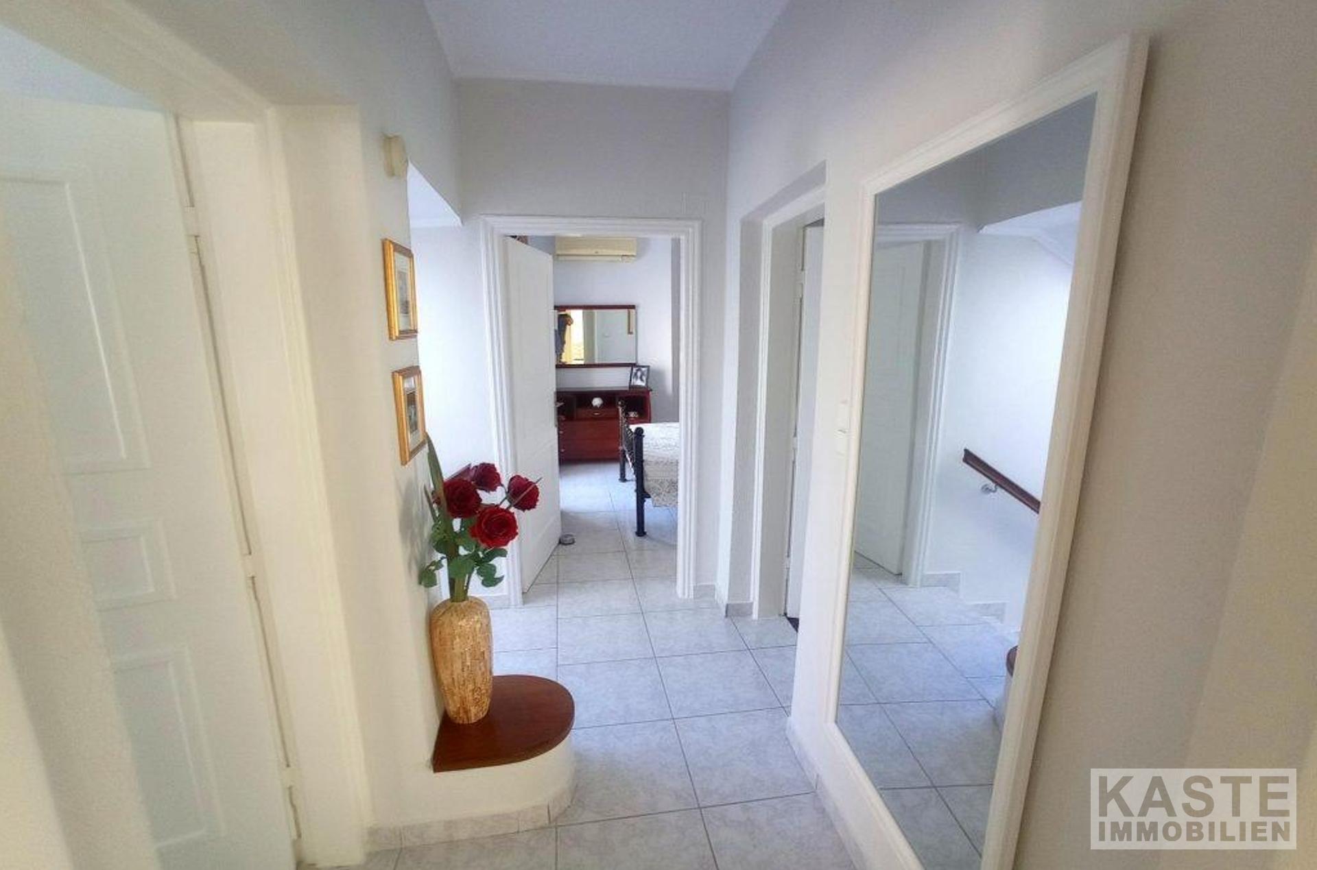 Die oberste Etage besteht aus einem Doppelschlafzimmer mit Einbauschränken und einem Balkon mit Blick auf das Meer und die Küste von Pachia Ammos, einem großen (gemeinsamen) Badezimmer, einem Doppelschlafzimmer mit einem kleinen begehbaren Kleiderschrank und einem Balkon mit Blick auf den Berg Thrypti und die Ha-Schlucht und einem Doppelschlafzimmer mit eigenem Badezimmer und einem Balkon mit Blick auf die Küste von Pachia Ammos und den Berg Thrypti. Eine Innentreppe mit einem Glasdach führt hinunter ins Erdgeschoss. Auf dieser Etage gibt es eine voll ausgestattete Küche/Esszimmer, ein Wohnzimmer mit Kamin, ein zweites Wohnzimmer (das leicht in ein 5. Schlafzimmer umgewandelt werden könnte), ein Einzelzimmer mit Einbauschränken und Zugang zur Poolterrasse/BBQ-Bereich und ein Gäste-WC.