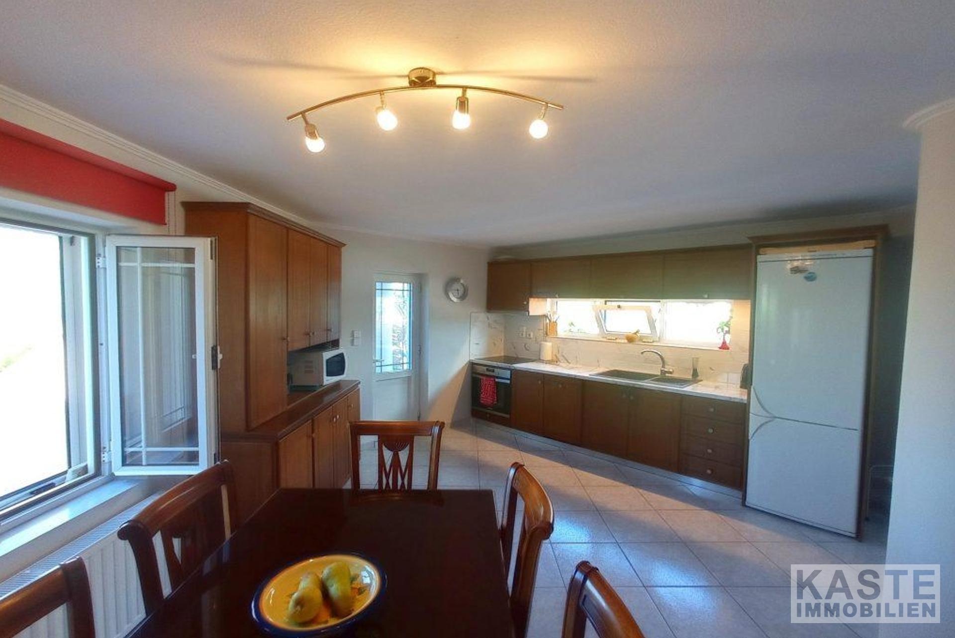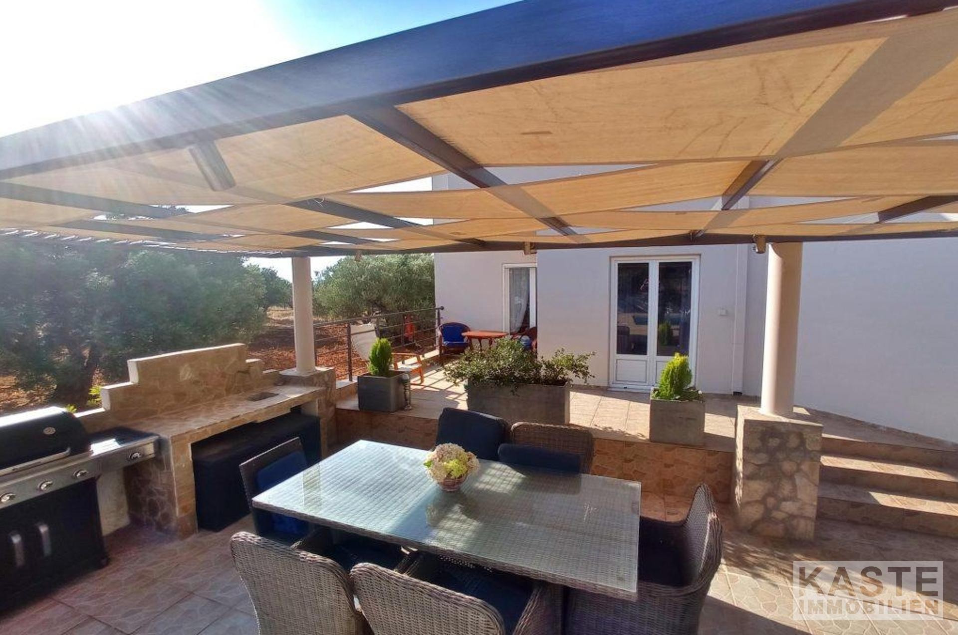 Diese freistehende Villa von 200 qm auf einem privaten Grundstück von 4130 qm in der Nähe von Kavousi auf Kreta, steht zum Verkauf. Die Villa liegt innerhalb eines ummauerten/umzäunten Grundstücks und verfügt über zwei Eingänge, eine gepflasterte Auffahrt mit ferngesteuertem Eisentor zum Haus und eine Toreinfahrt zum Olivenhain auf der Rückseite des Grundstücks.