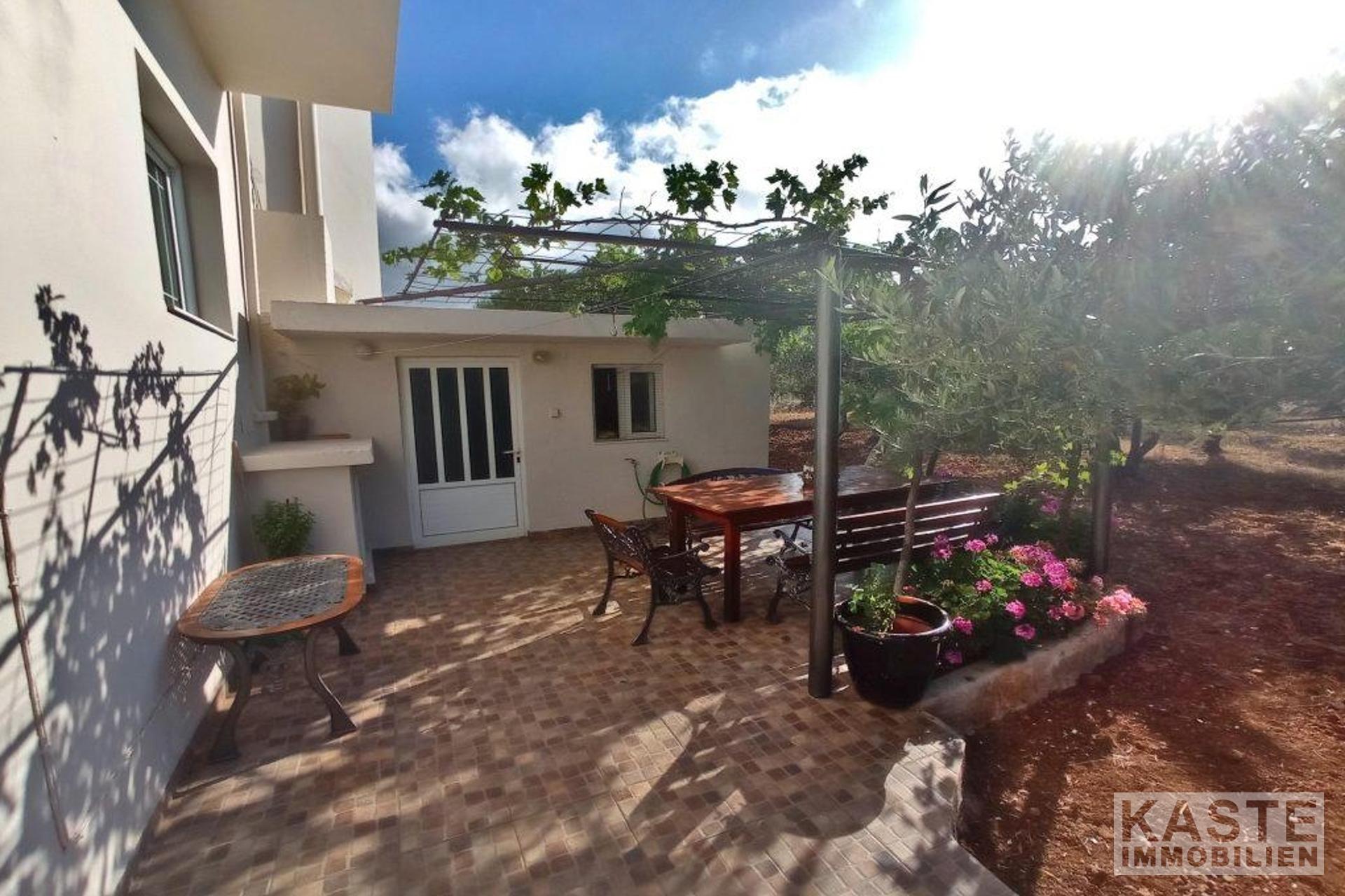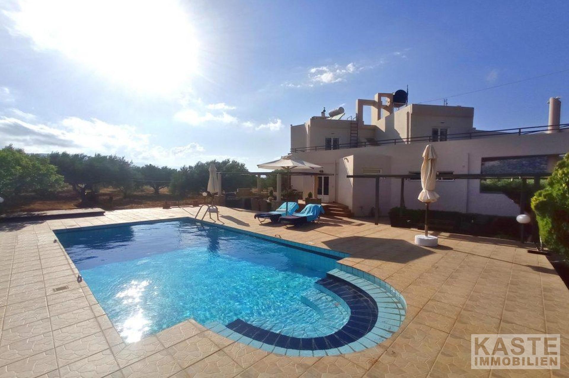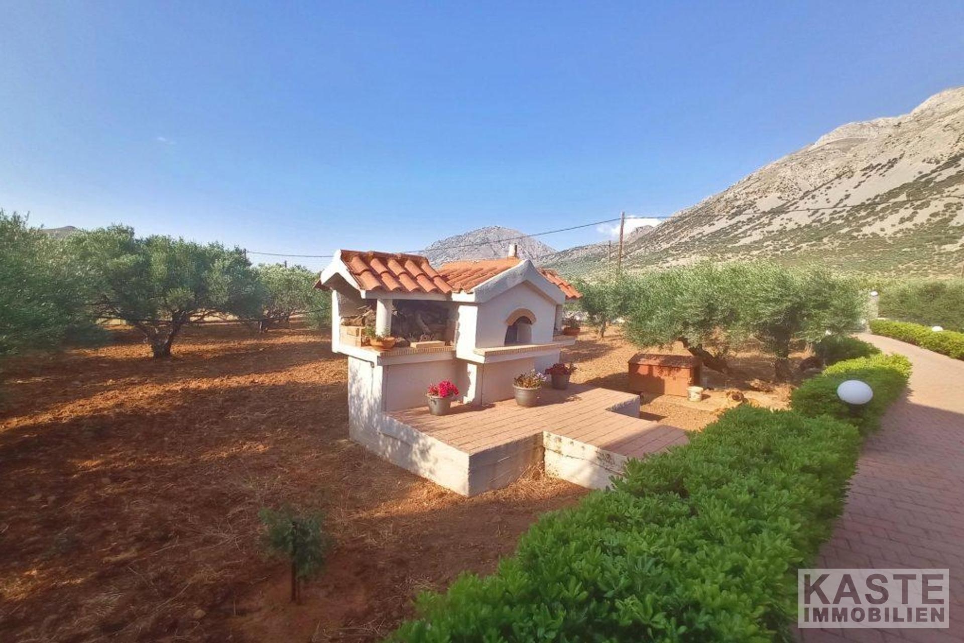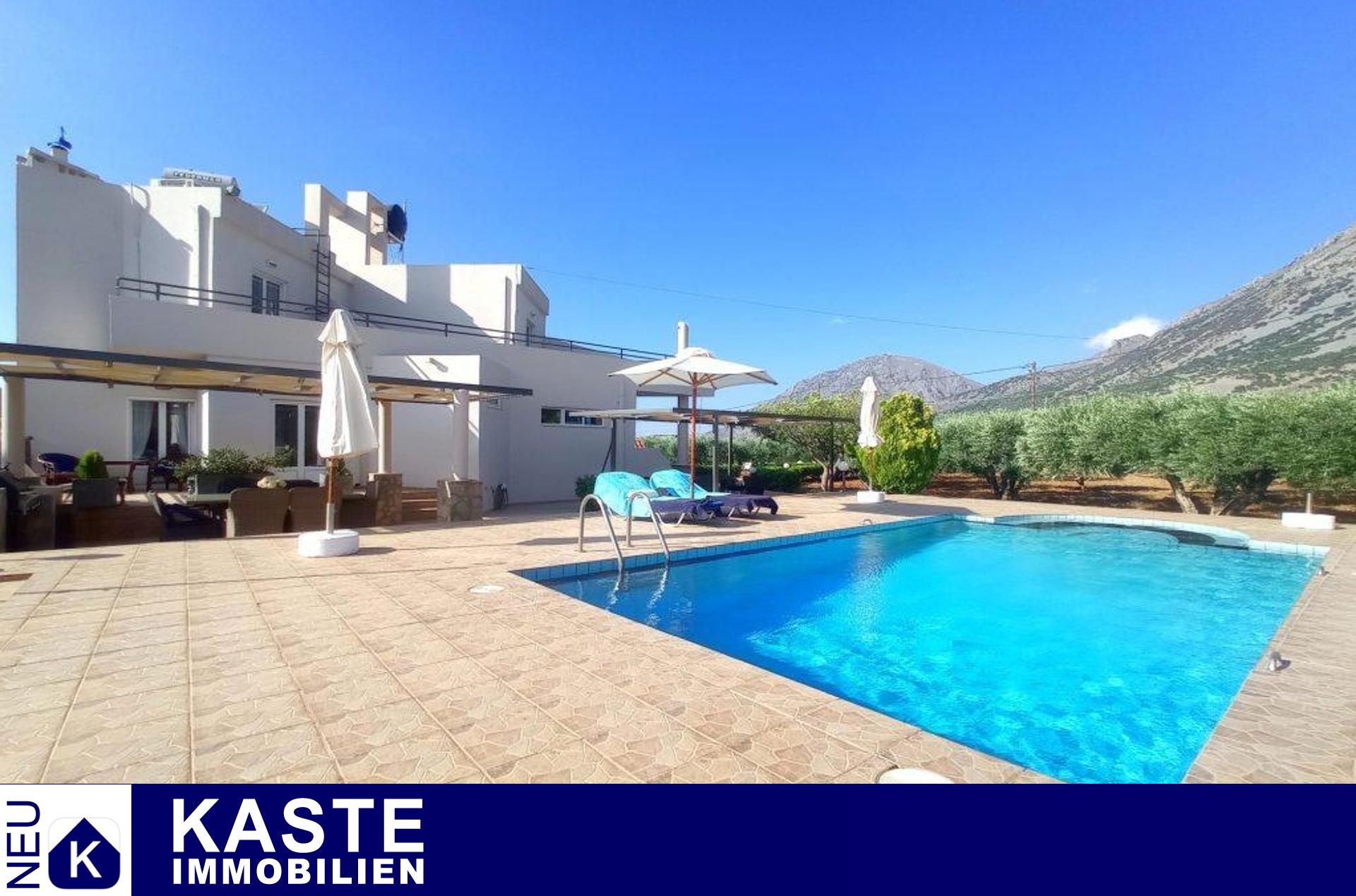 Diese freistehende Villa von 200 qm auf einem privaten Grundstück von 4130 qm in der Nähe von Kavousi auf Kreta, steht zum Verkauf. Die Villa liegt innerhalb eines ummauerten/umzäunten Grundstücks und verfügt über zwei Eingänge, eine gepflasterte Auffahrt mit ferngesteuertem Eisentor zum Haus und eine Toreinfahrt zum Olivenhain auf der Rückseite des Grundstücks.