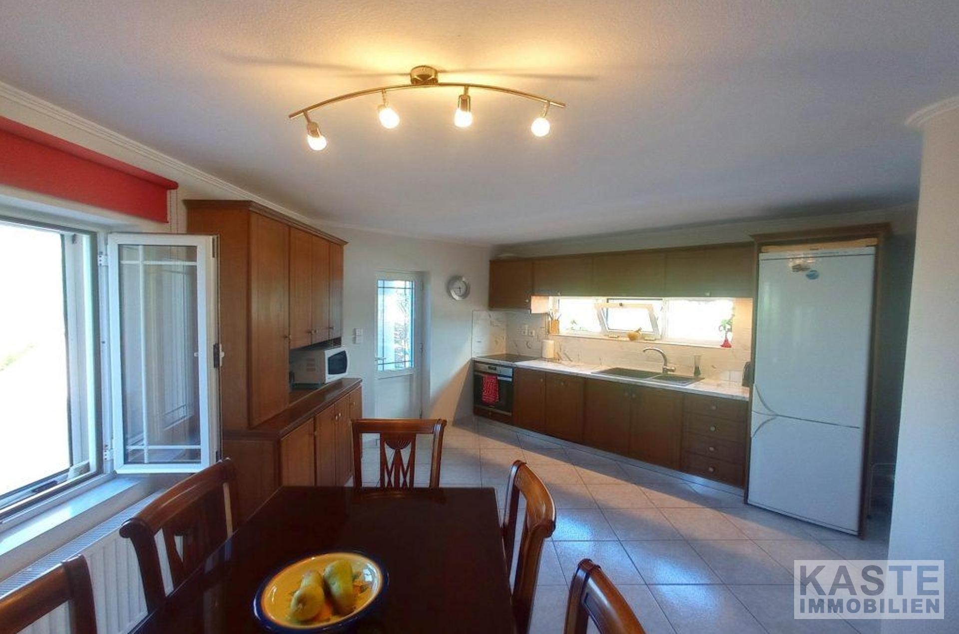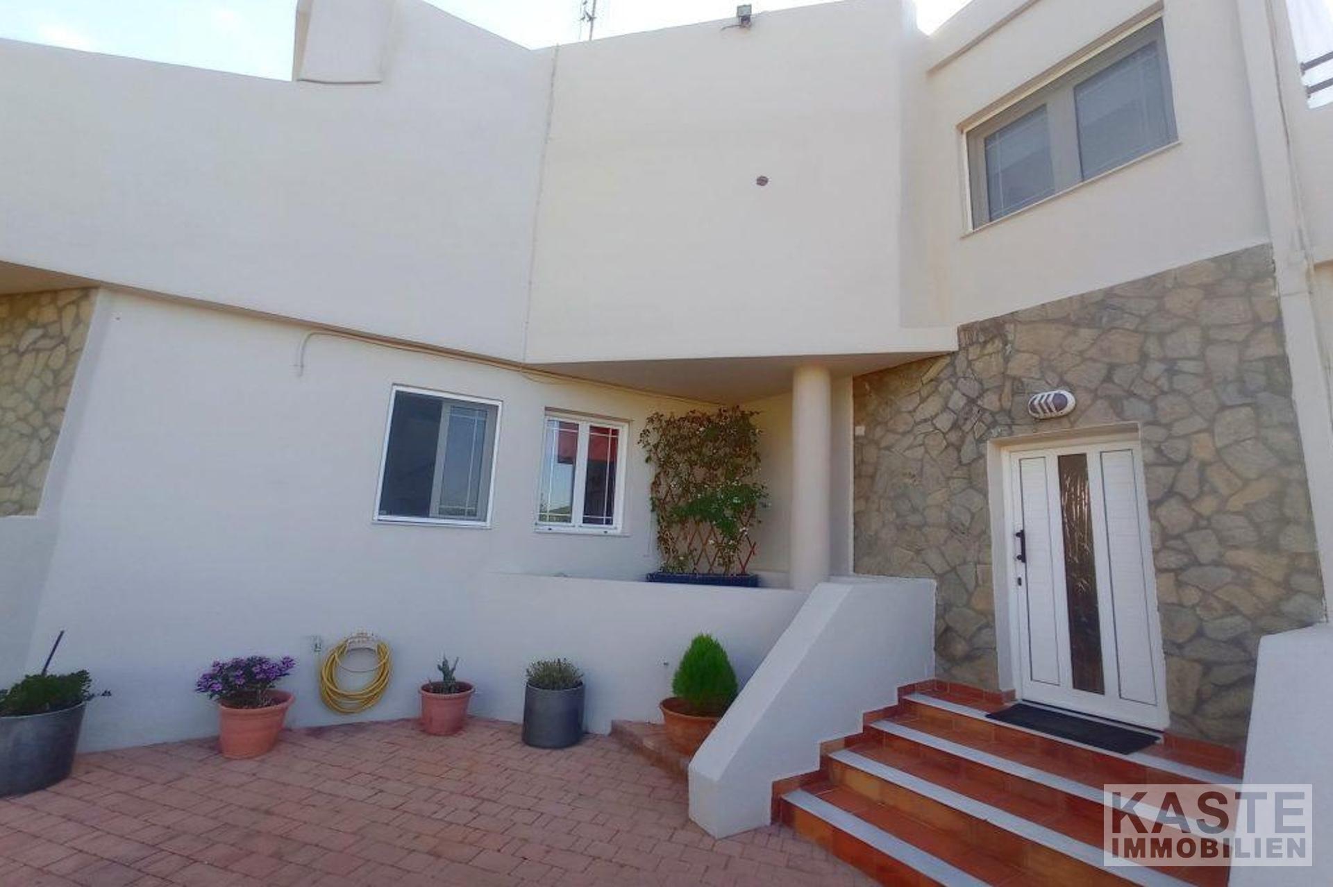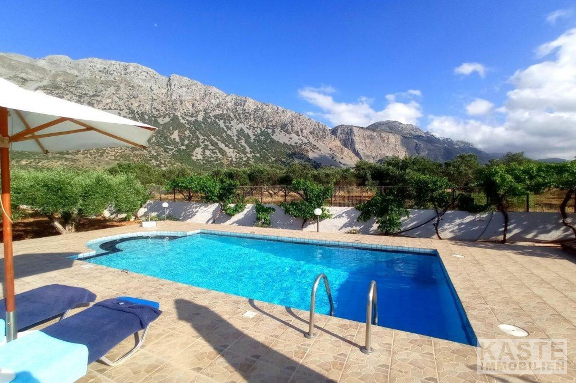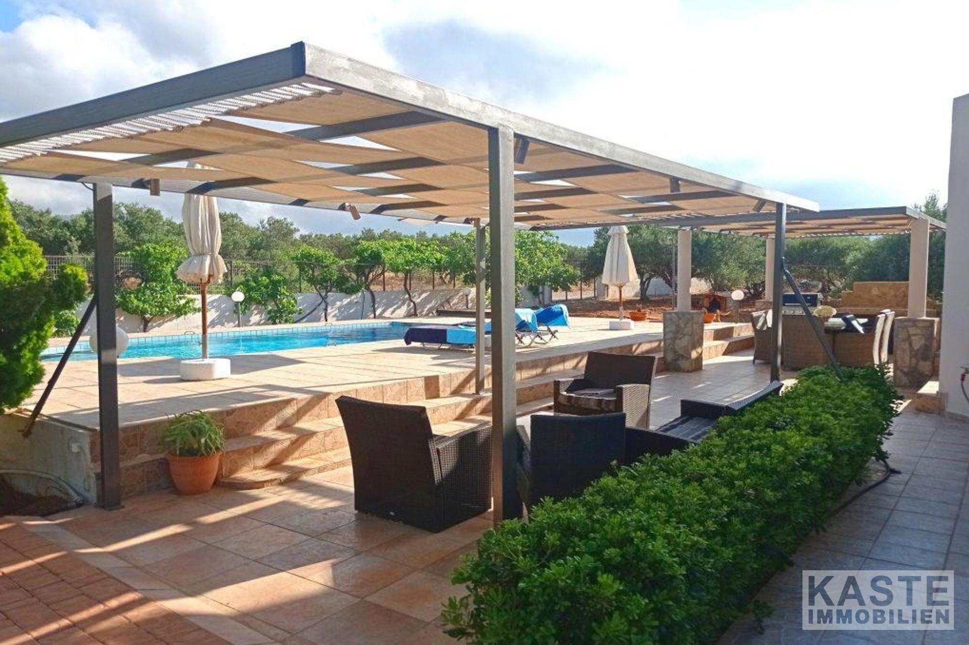 Diese freistehende Villa von 200 qm auf einem privaten Grundstück von 4130 qm in der Nähe von Kavousi auf Kreta, steht zum Verkauf. Die Villa liegt innerhalb eines ummauerten/umzäunten Grundstücks und verfügt über zwei Eingänge, eine gepflasterte Auffahrt mit ferngesteuertem Eisentor zum Haus und eine Toreinfahrt zum Olivenhain auf der Rückseite des Grundstücks.