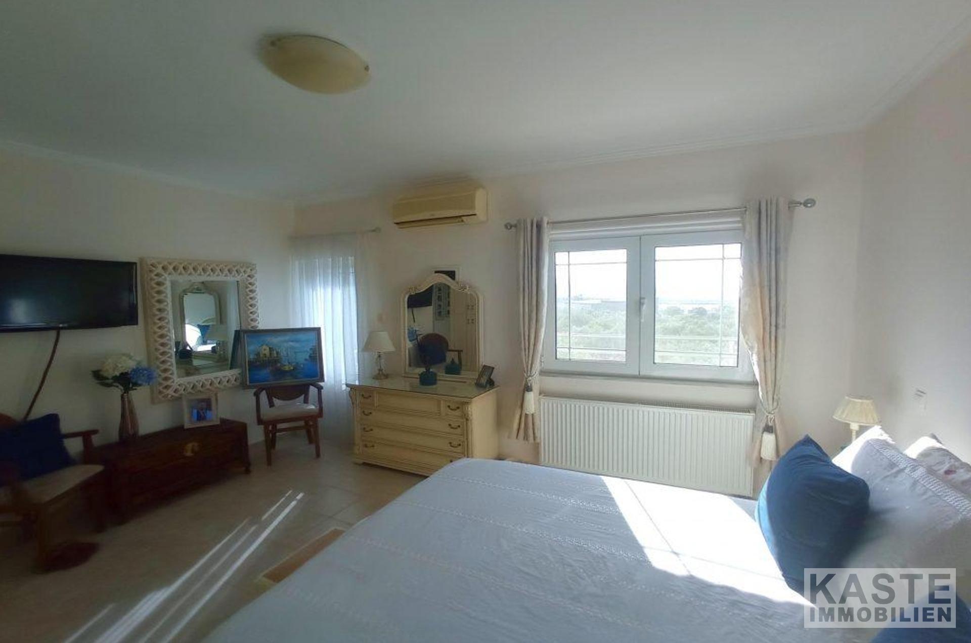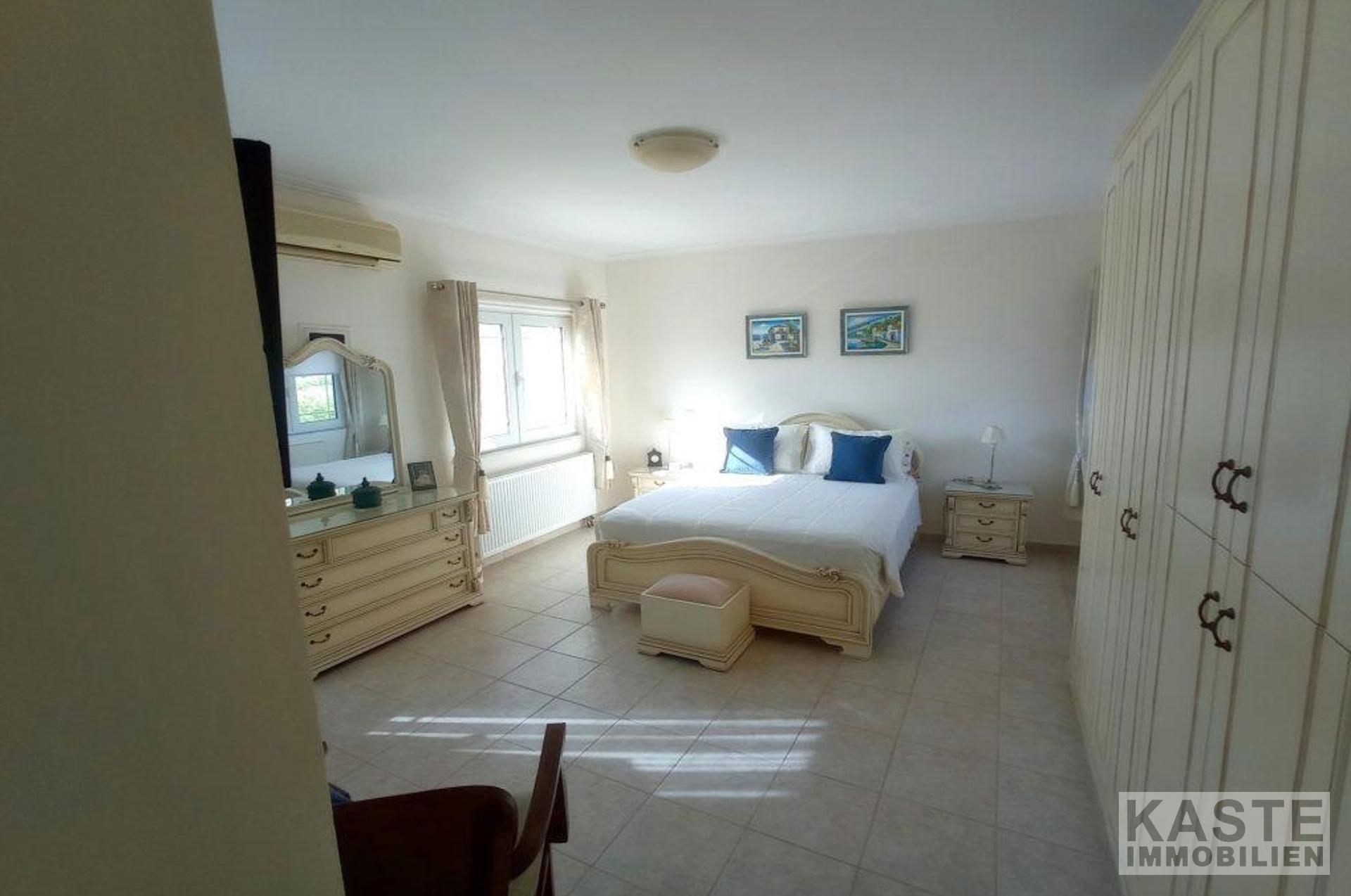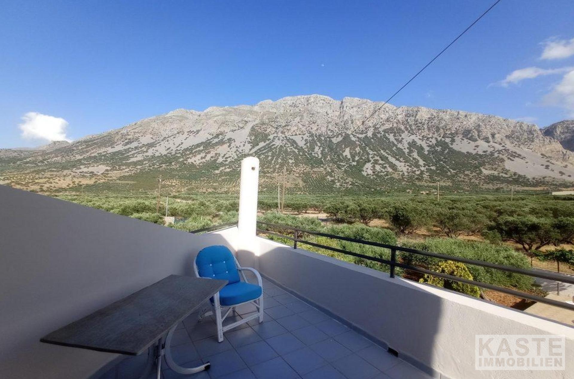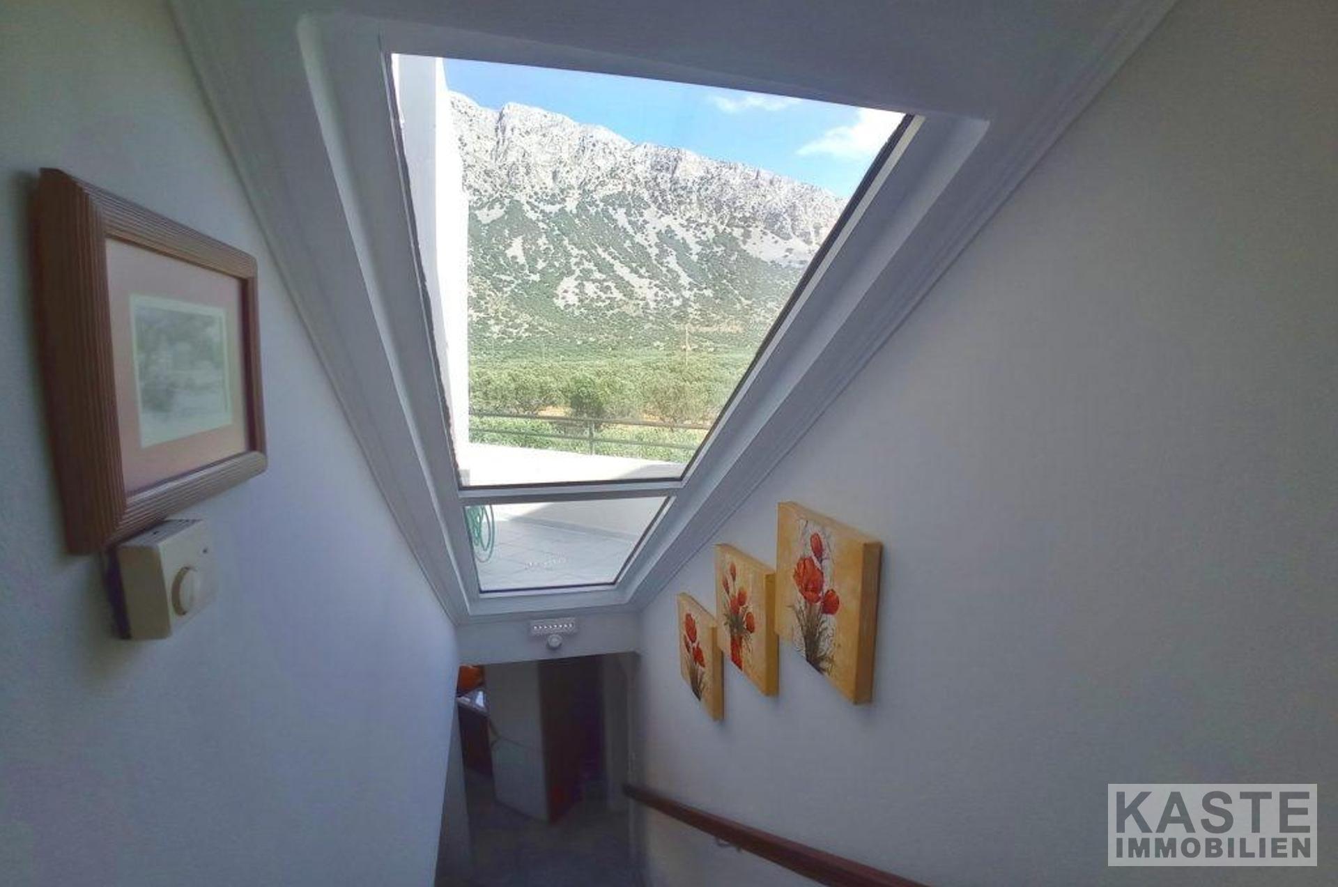 Die oberste Etage besteht aus einem Doppelschlafzimmer mit Einbauschränken und einem Balkon mit Blick auf das Meer und die Küste von Pachia Ammos, einem großen (gemeinsamen) Badezimmer, einem Doppelschlafzimmer mit einem kleinen begehbaren Kleiderschrank und einem Balkon mit Blick auf den Berg Thrypti und die Ha-Schlucht und einem Doppelschlafzimmer mit eigenem Badezimmer und einem Balkon mit Blick auf die Küste von Pachia Ammos und den Berg Thrypti. Eine Innentreppe mit einem Glasdach führt hinunter ins Erdgeschoss. Auf dieser Etage gibt es eine voll ausgestattete Küche/Esszimmer, ein Wohnzimmer mit Kamin, ein zweites Wohnzimmer (das leicht in ein 5. Schlafzimmer umgewandelt werden könnte), ein Einzelzimmer mit Einbauschränken und Zugang zur Poolterrasse/BBQ-Bereich und ein Gäste-WC.