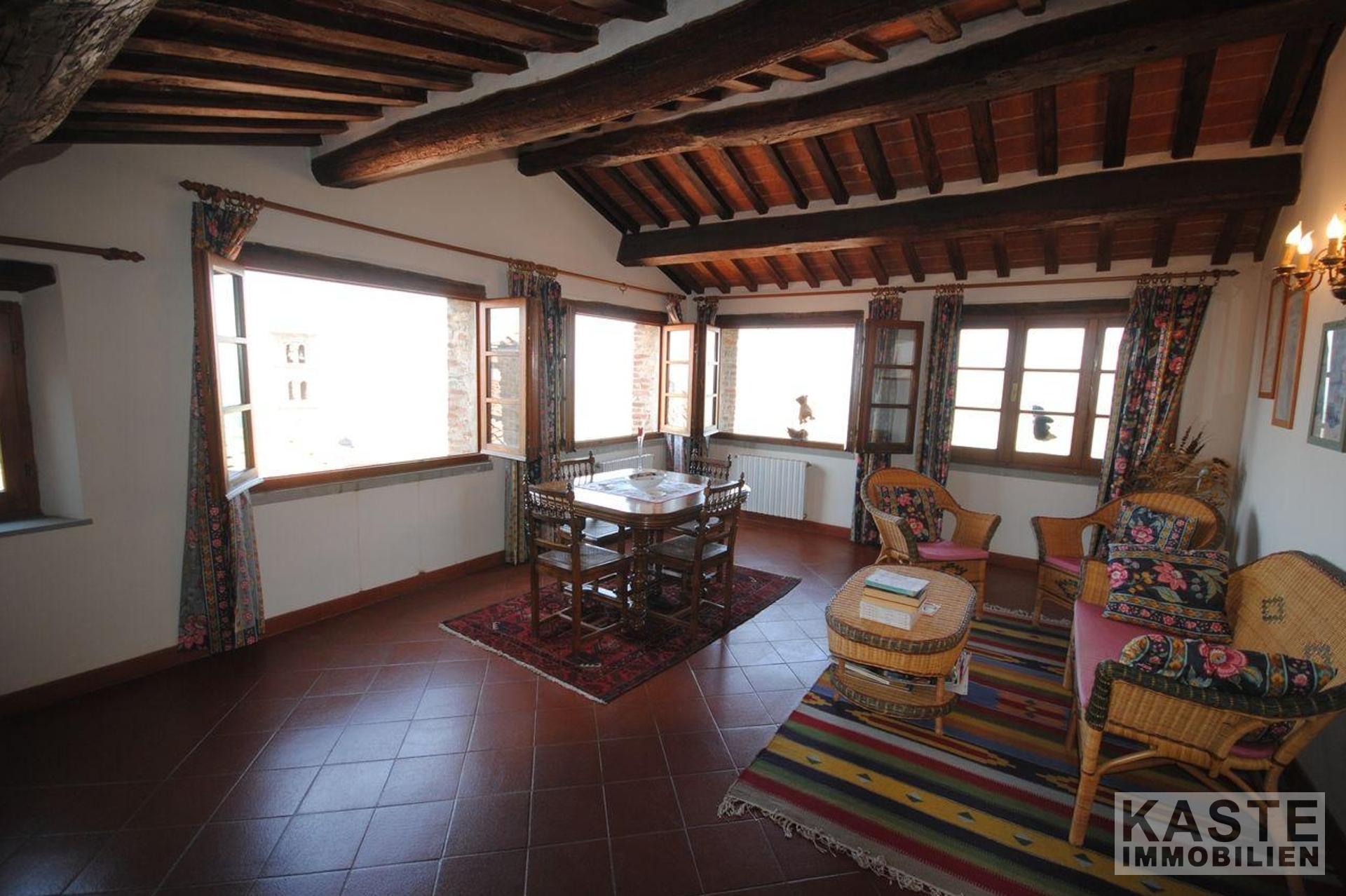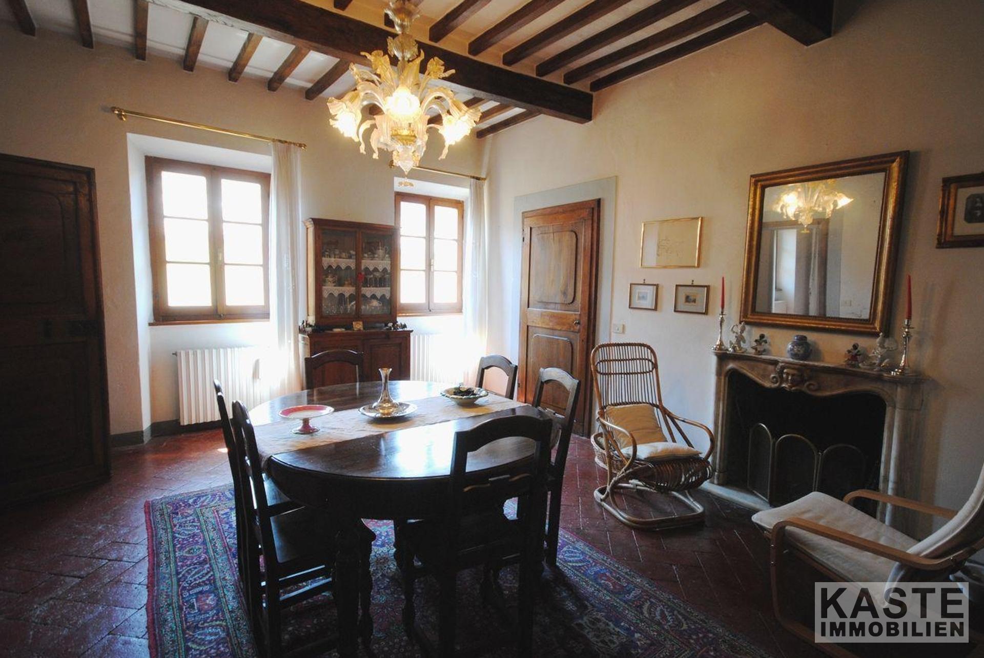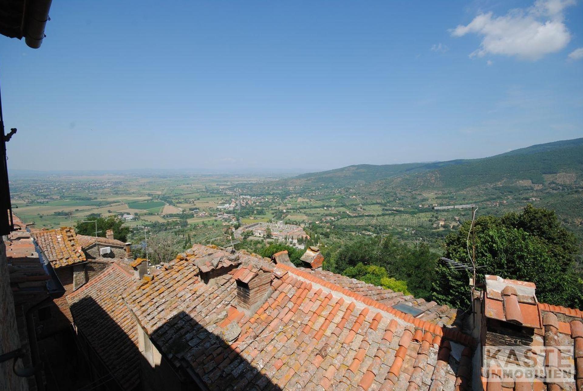Das Erdgeschoss verfügt über eine Eingangshalle, Esszimmer mit schönem Marmorkamin, Küche, großes Wohnzimmer, 2 Schlafzimmer und 2 Bäder. Die gesamte untere Etage hat schöne antike Terrakottaböden. In der zweiten Etage gibt es ein Wohnzimmer, ein Badezimmer, ein Schlafzimmer und ein Esszimmer mit Kamin und eine voll ausgestattete Küche mit einem einzigartigen 180-Grad-Blick auf den Glockenturm des Doms, das Tal und die Berge des Cortona-Hügels.