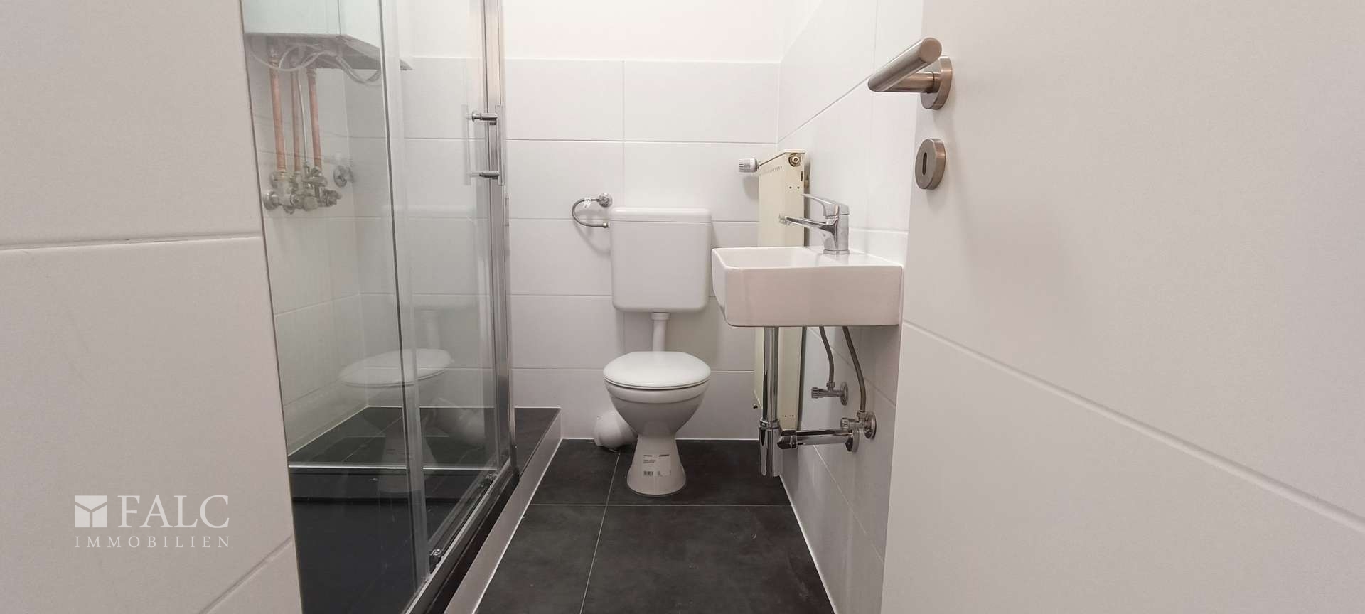 Das Badezimmer ist funktional gestaltet und mit einer Dusche ausgestattet. Die hellen Wandfliesen verleihen dem Raum eine freundliche Atmosphäre und bilden einen schönen Kontrast zu den schwarzen Bodenfliesen.