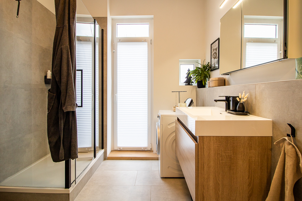 - Einbauküche - Badezimmer mit Dusche, Badezimmermöbeln und Fenster - Dachterrasse - teilweise Aussenjalousien