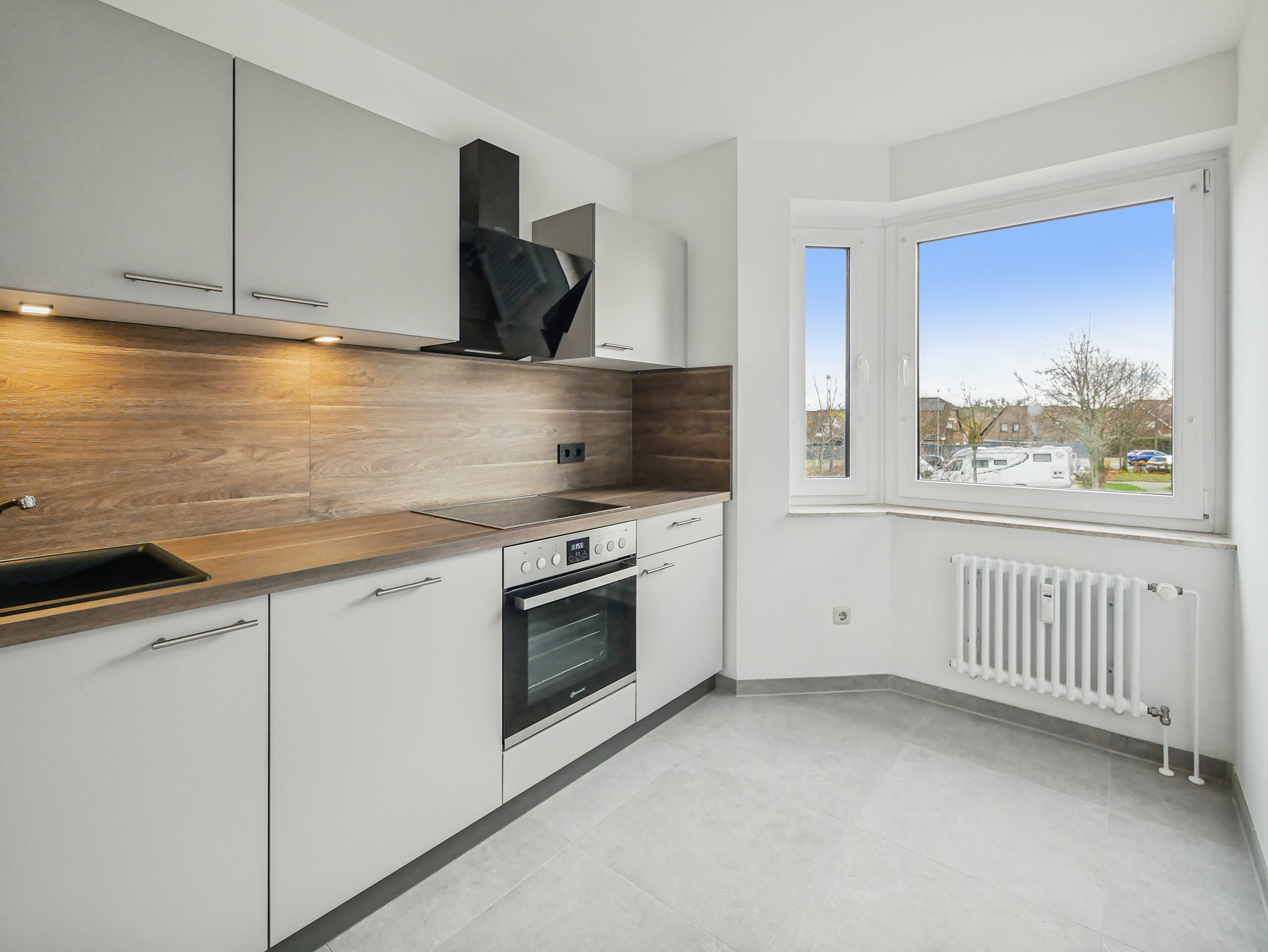 Beim Betreten dieser charmanten 2-Zimmer-Wohnung mit einer Wohnfläche von 55,75 m² werden Sie von einem einladenden Flur empfangen, der Sie direkt in die verschiedenen Bereiche der Wohnung führt. Rechts befindet sich die moderne Küche, die mit ihren hellen Fronten und einem großzügigen Fenster viel Tageslicht bietet. Hier können Sie Ihre kulinarischen Fähigkeiten entfalten und den Blick nach draußen genießen.