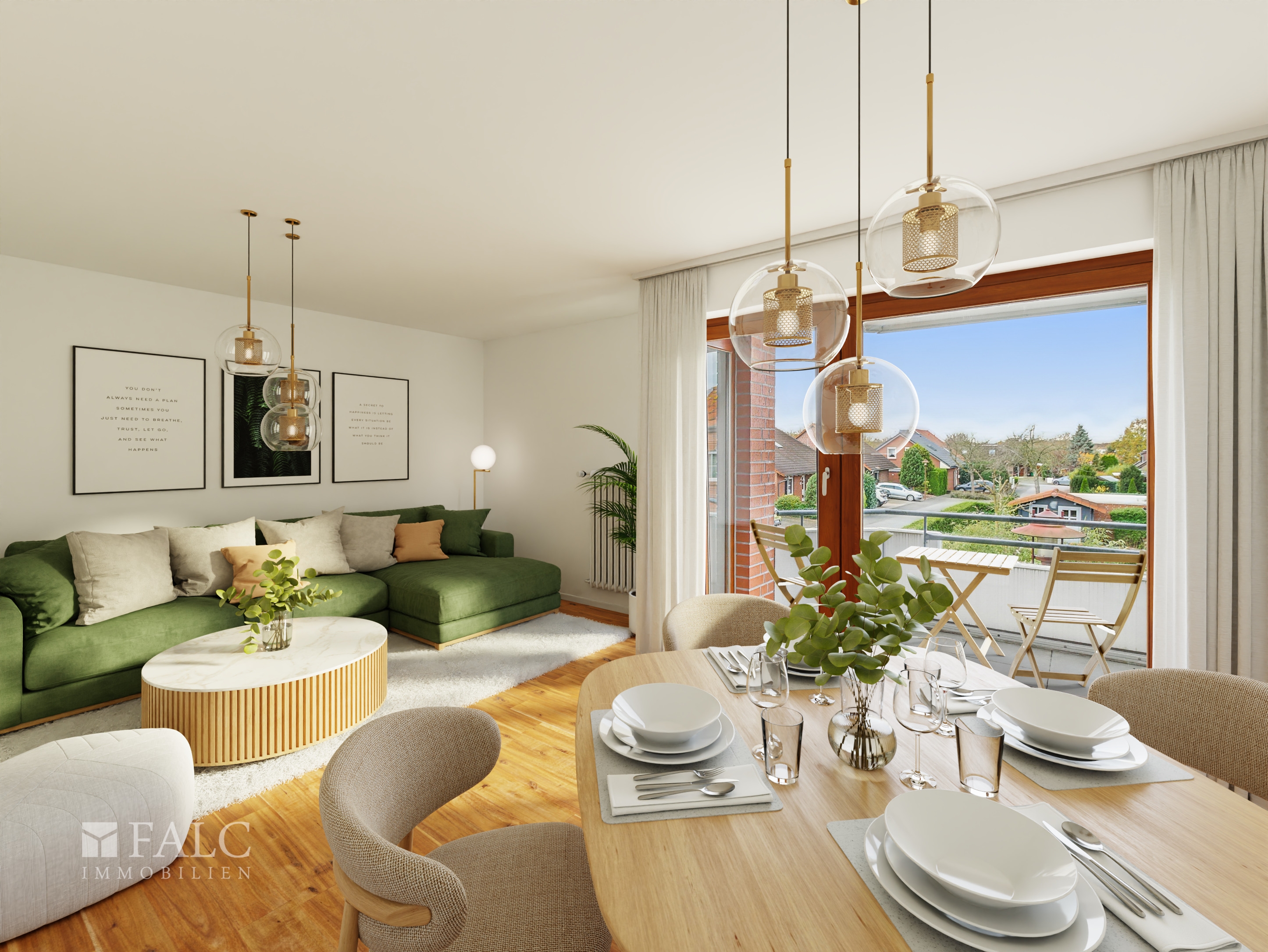 Weiter geht es in das geräumige Wohnzimmer, das ausreichend Platz für einen gemütlichen Wohnbereich bietet. Die großen Fenster und der Zugang zum Balkon sorgen für eine helle und freundliche Atmosphäre. Der Balkon selbst lädt dazu ein, entspannte Stunden im Freien zu verbringen und bietet einen schönen Ausblick auf die Umgebung.
